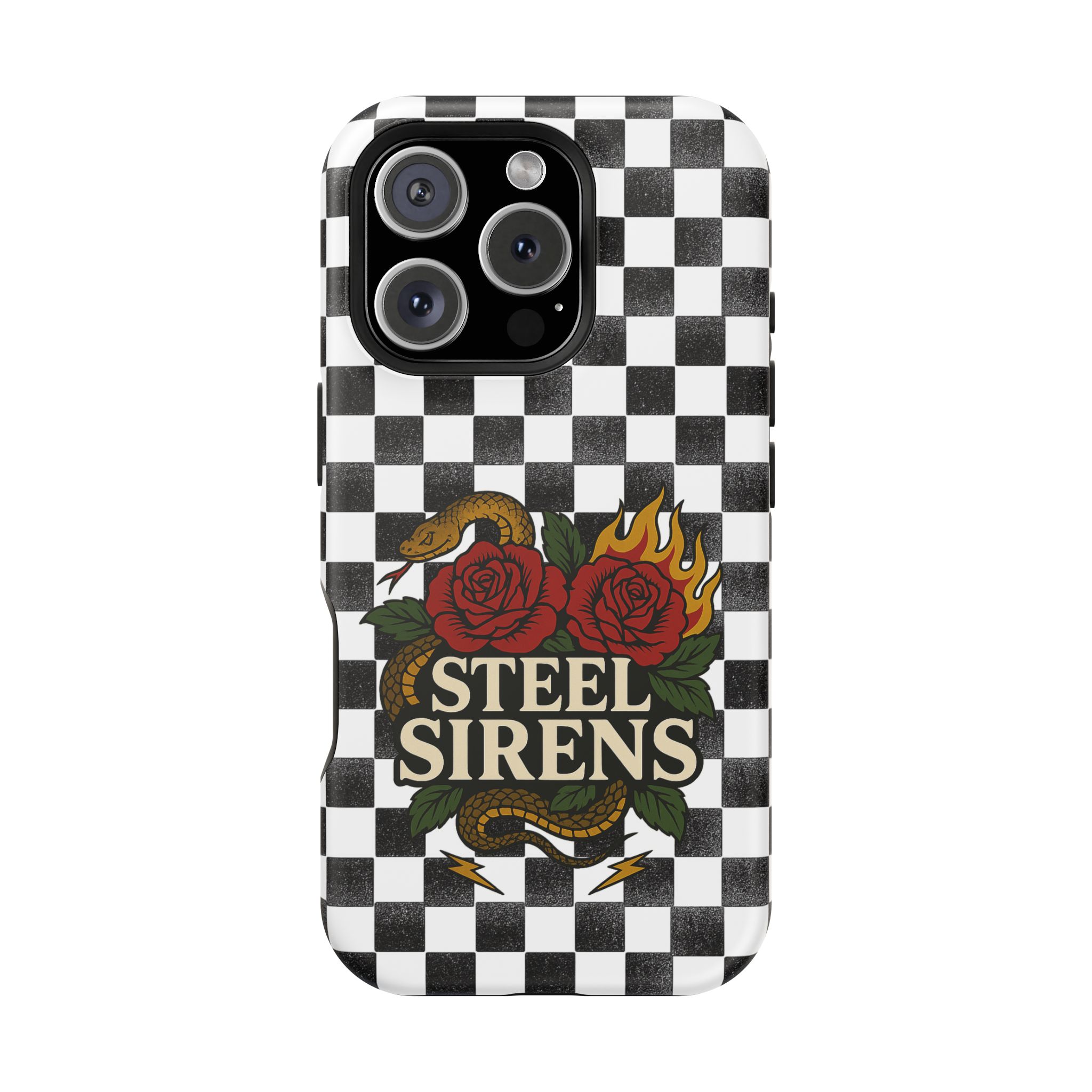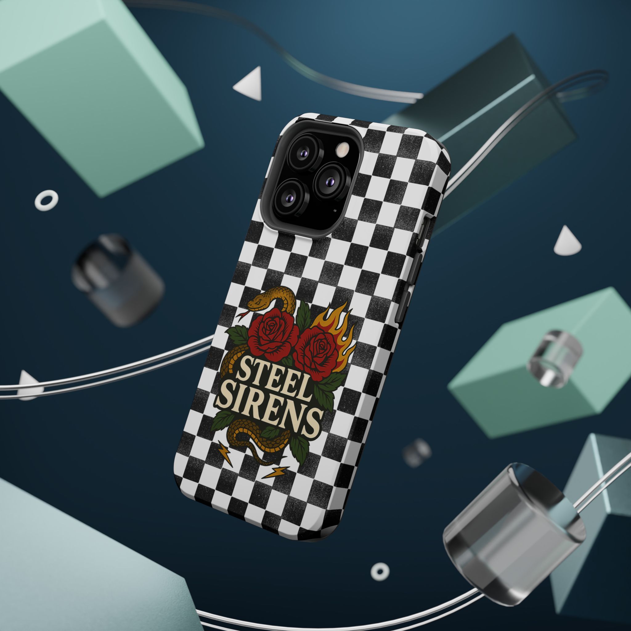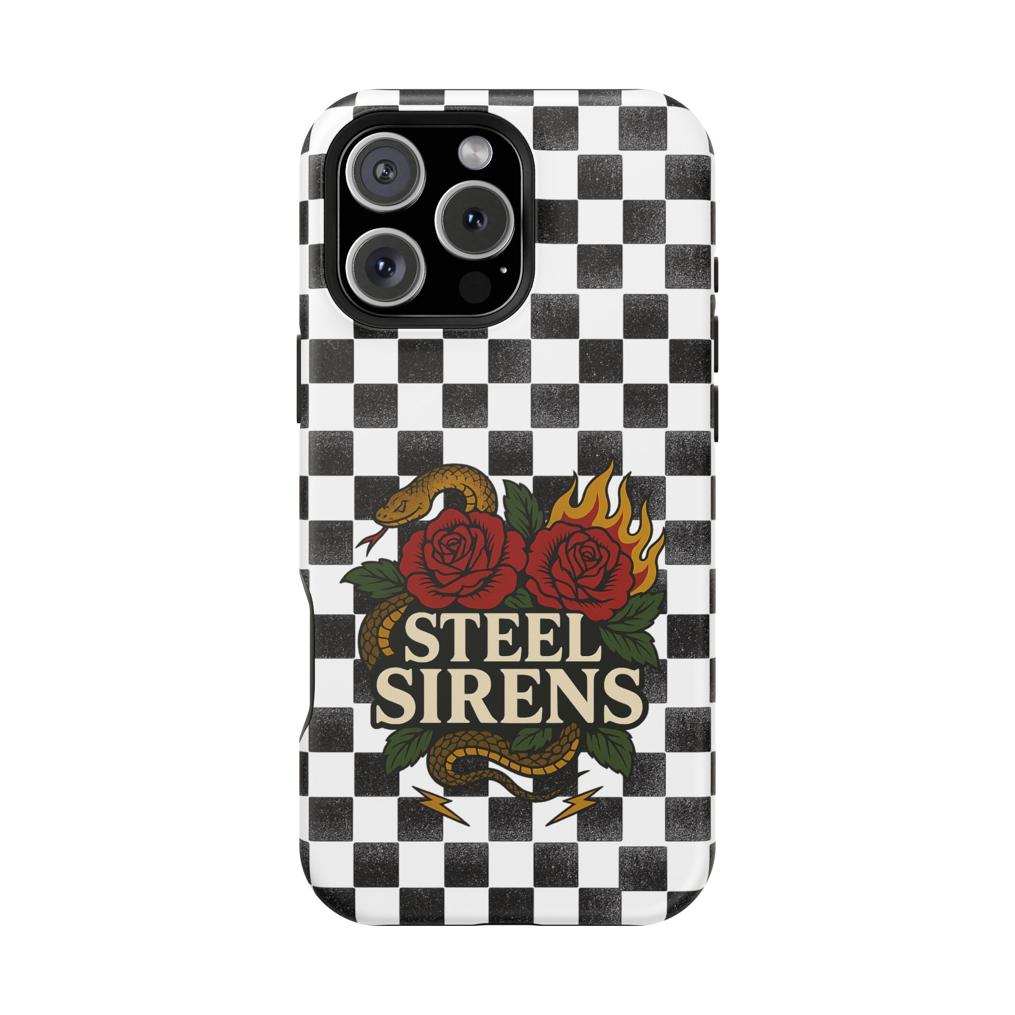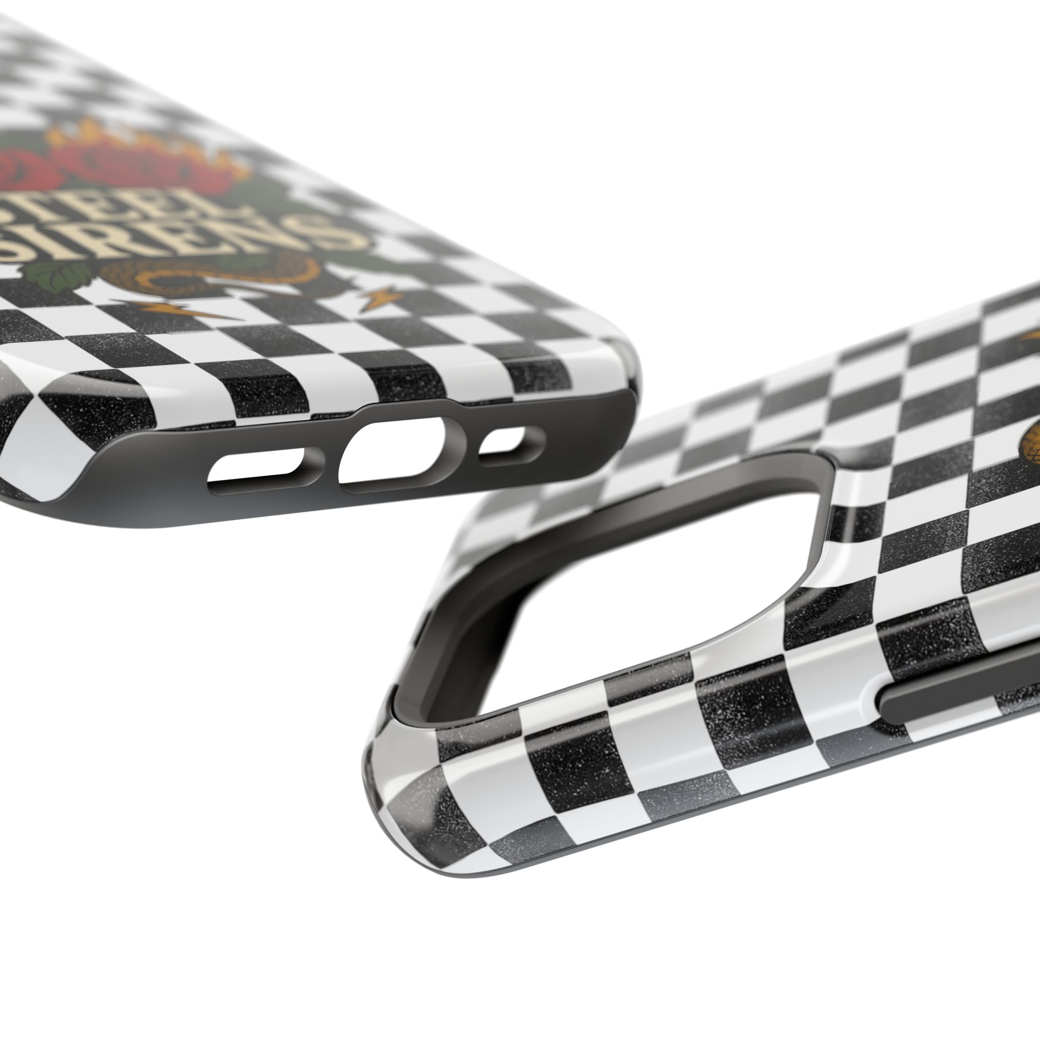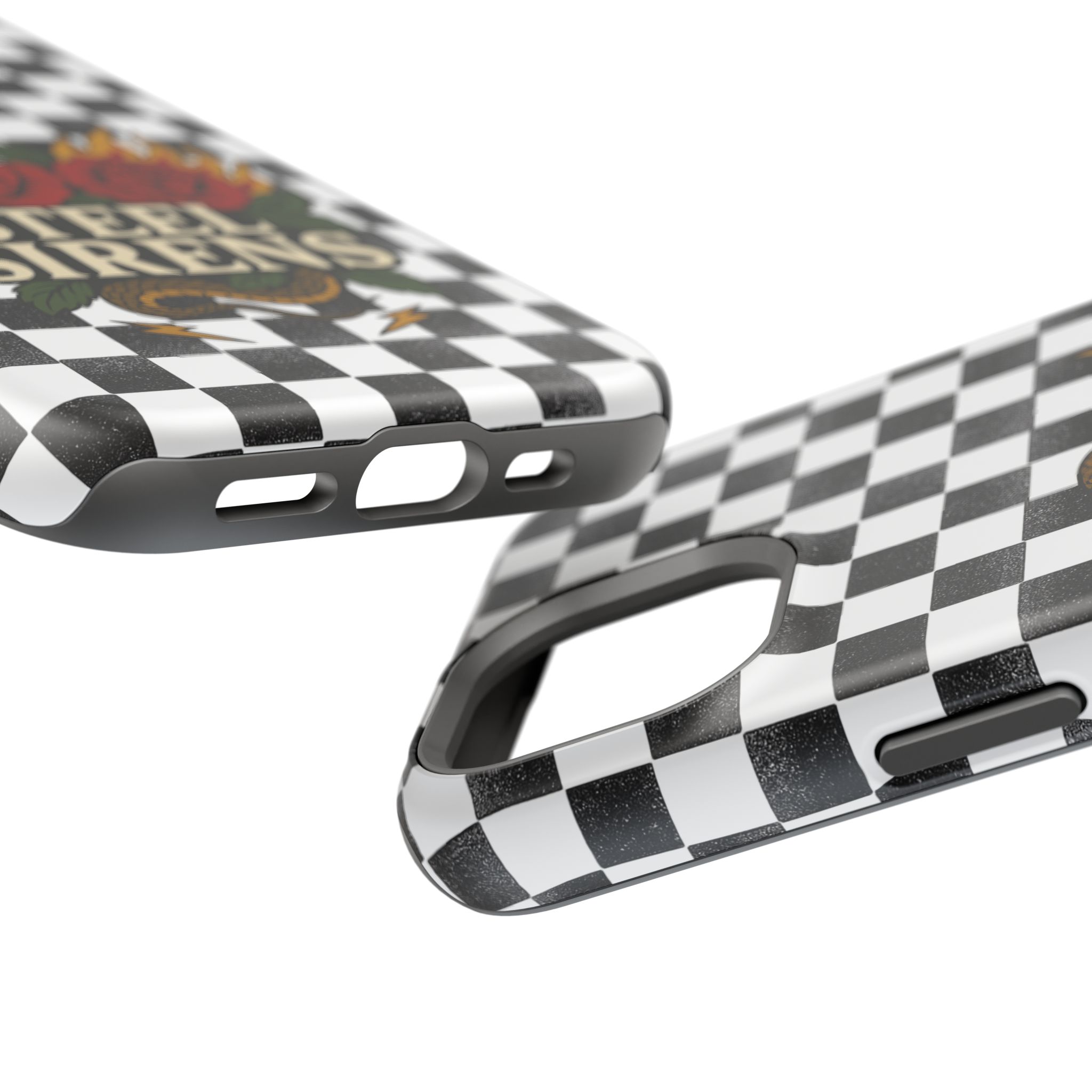 Protect your phone with attitude. The Checkered Flame Siren iPhone Case features Steel Sirens’ iconic logo set against a bold black-and-white checkerboard backdrop, finished with fiery details, roses, and a venomous edge. Built for riders, rebels, and anyone who refuses to blend in, this case doesn’t just guard your phone, it makes a statement.