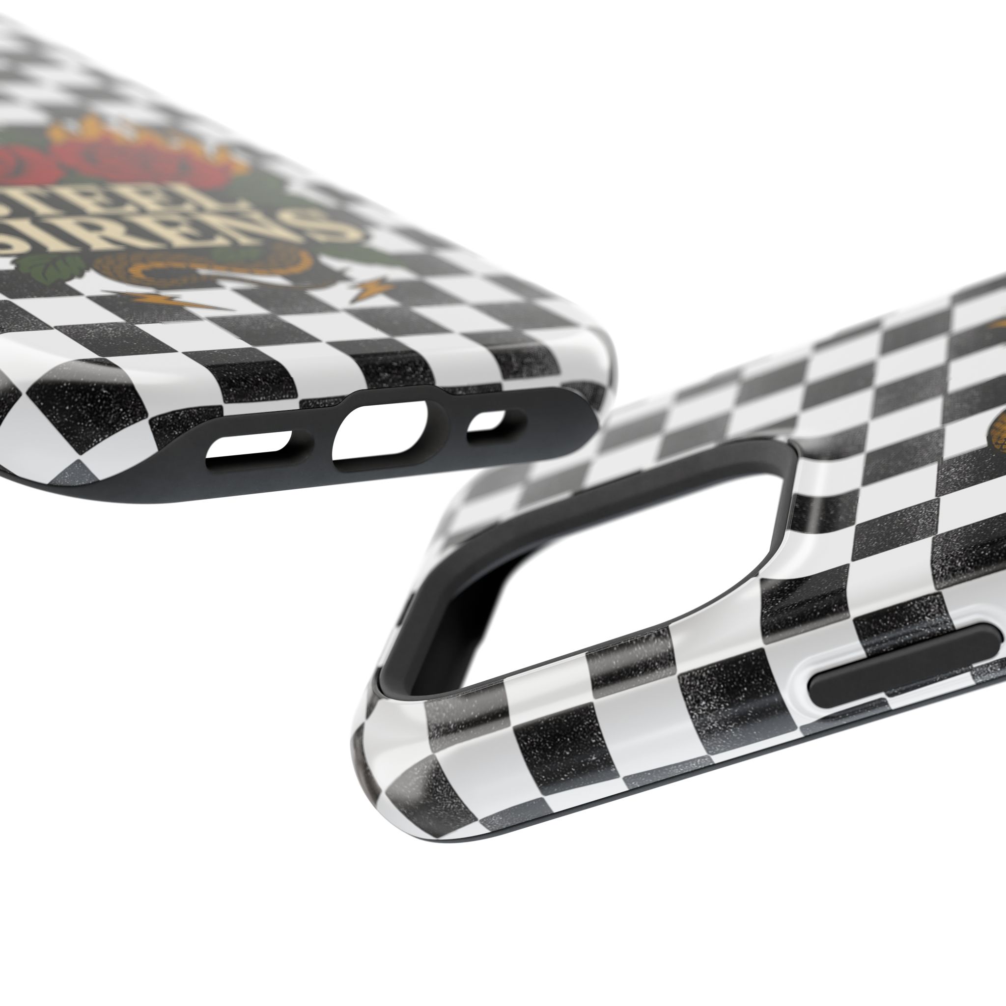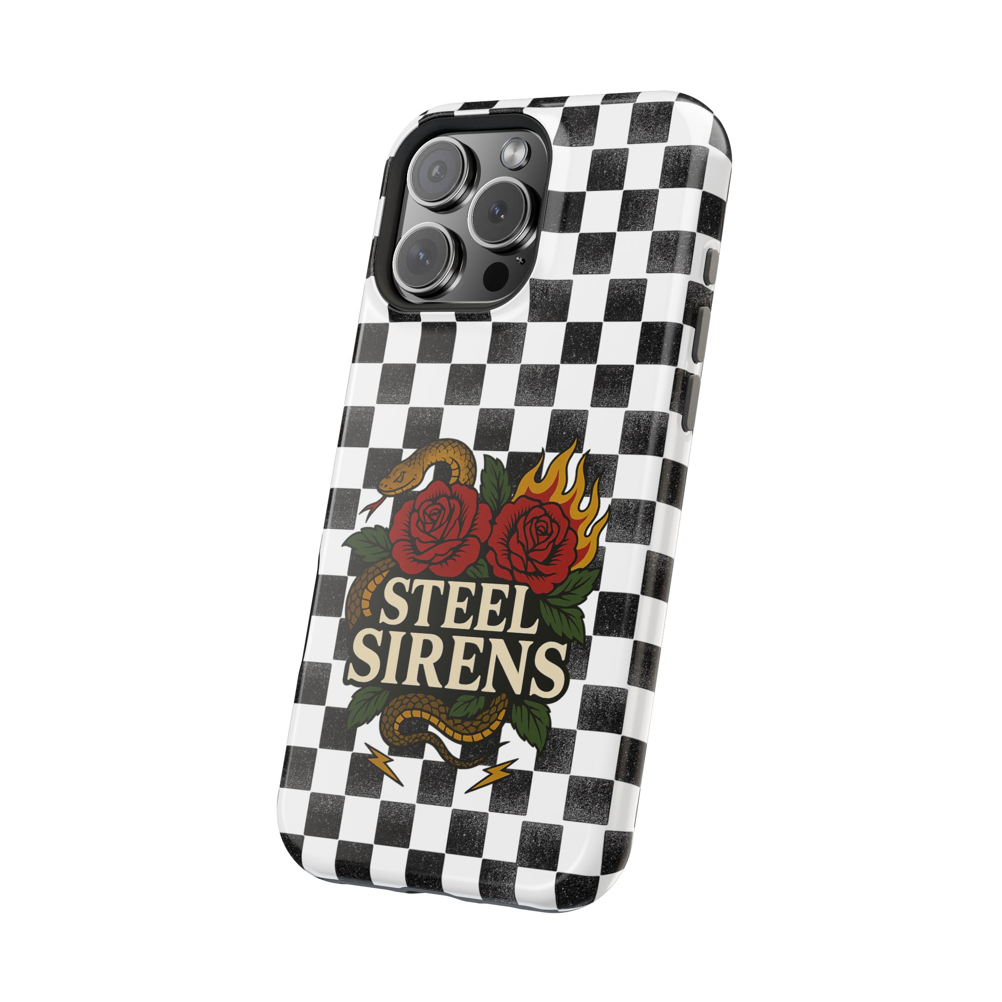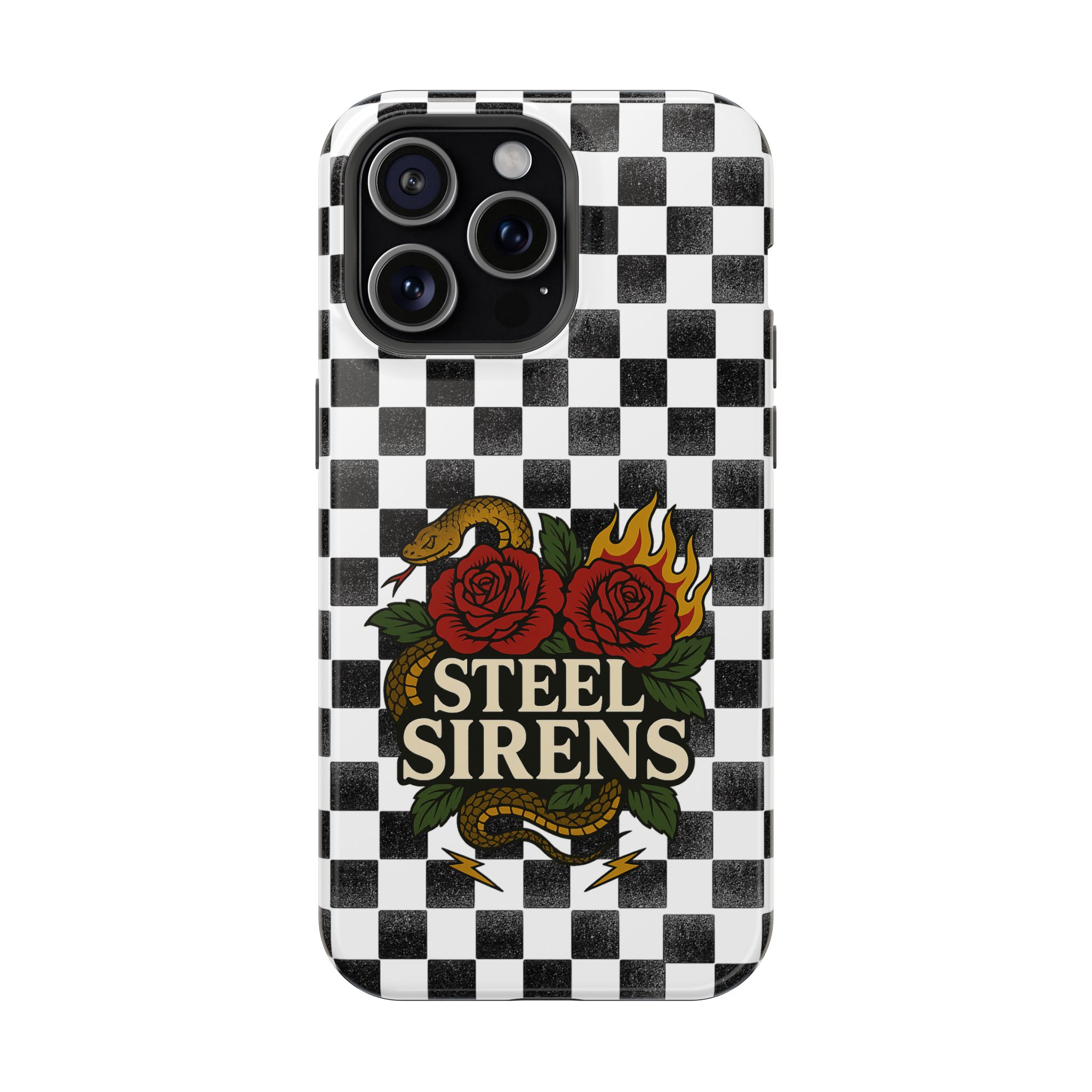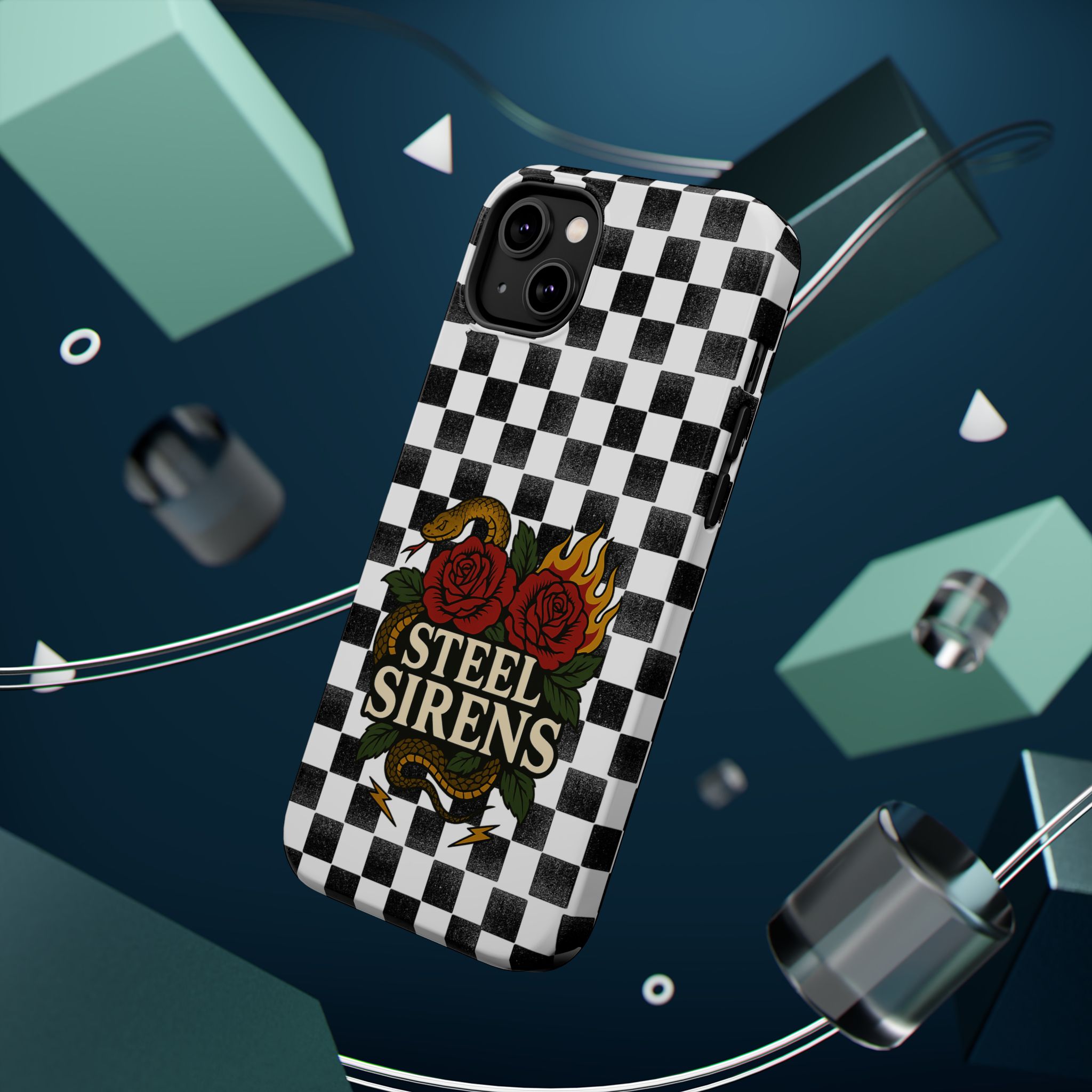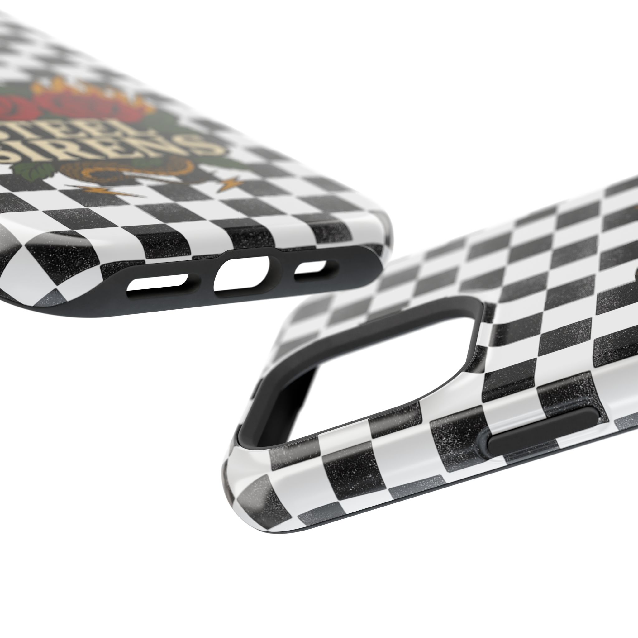 Protect your phone with attitude. The Checkered Flame Siren iPhone Case features Steel Sirens’ iconic logo set against a bold black-and-white checkerboard backdrop, finished with fiery details, roses, and a venomous edge. Built for riders, rebels, and anyone who refuses to blend in, this case doesn’t just guard your phone, it makes a statement.