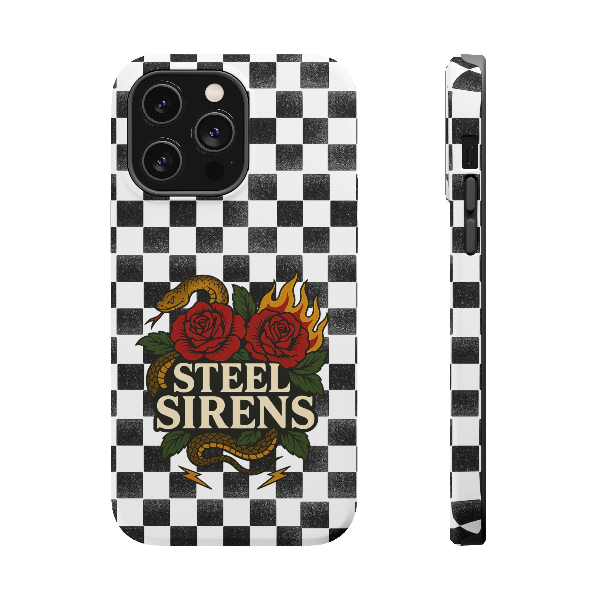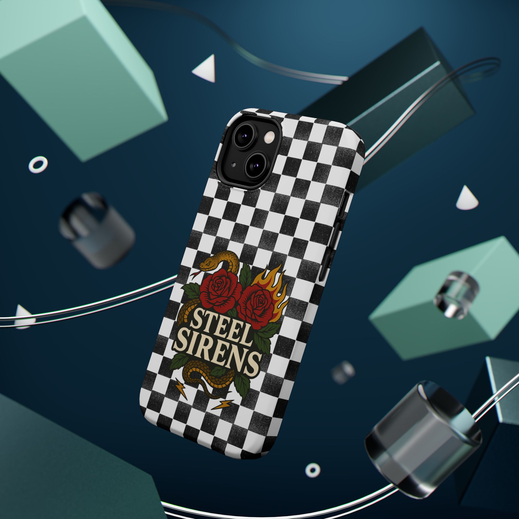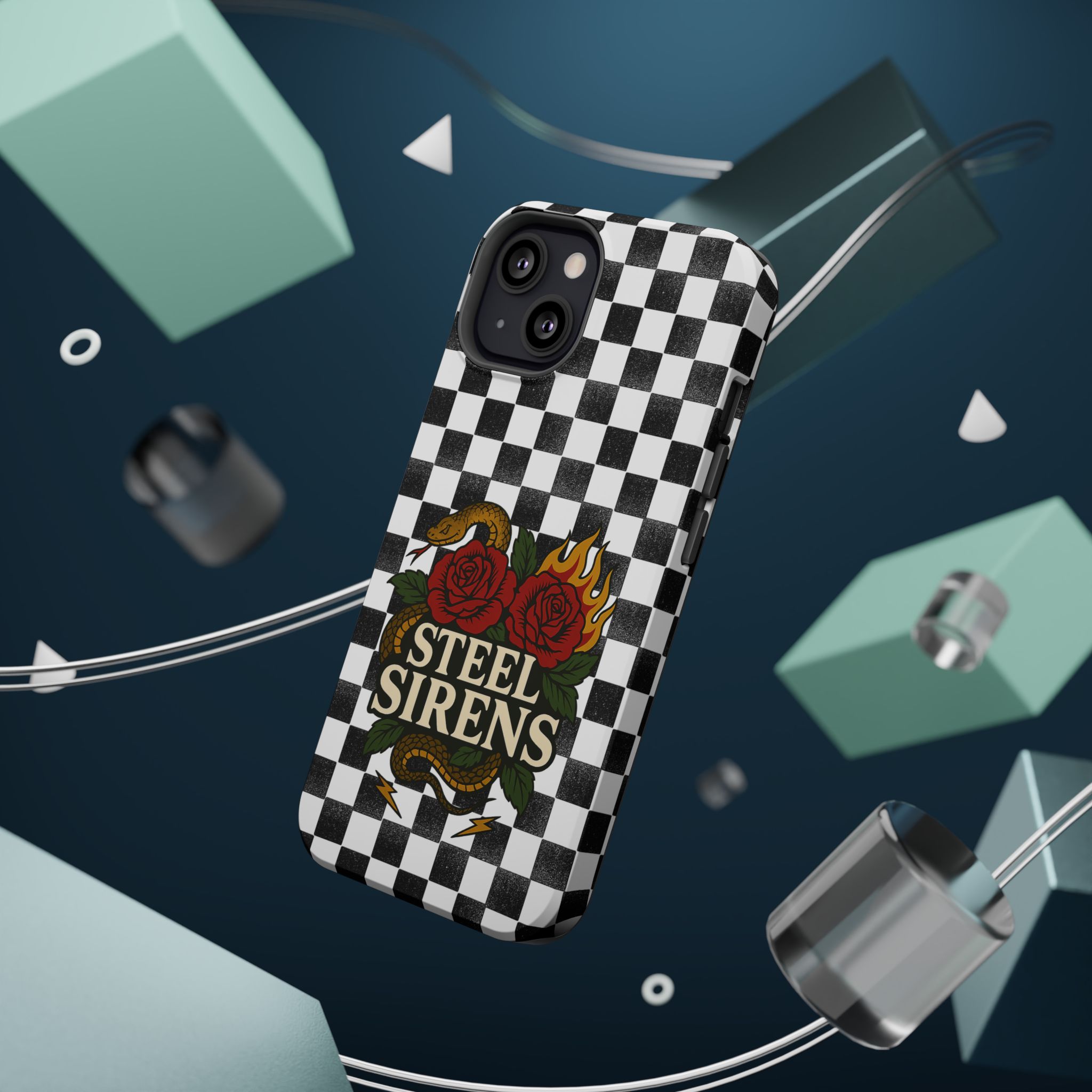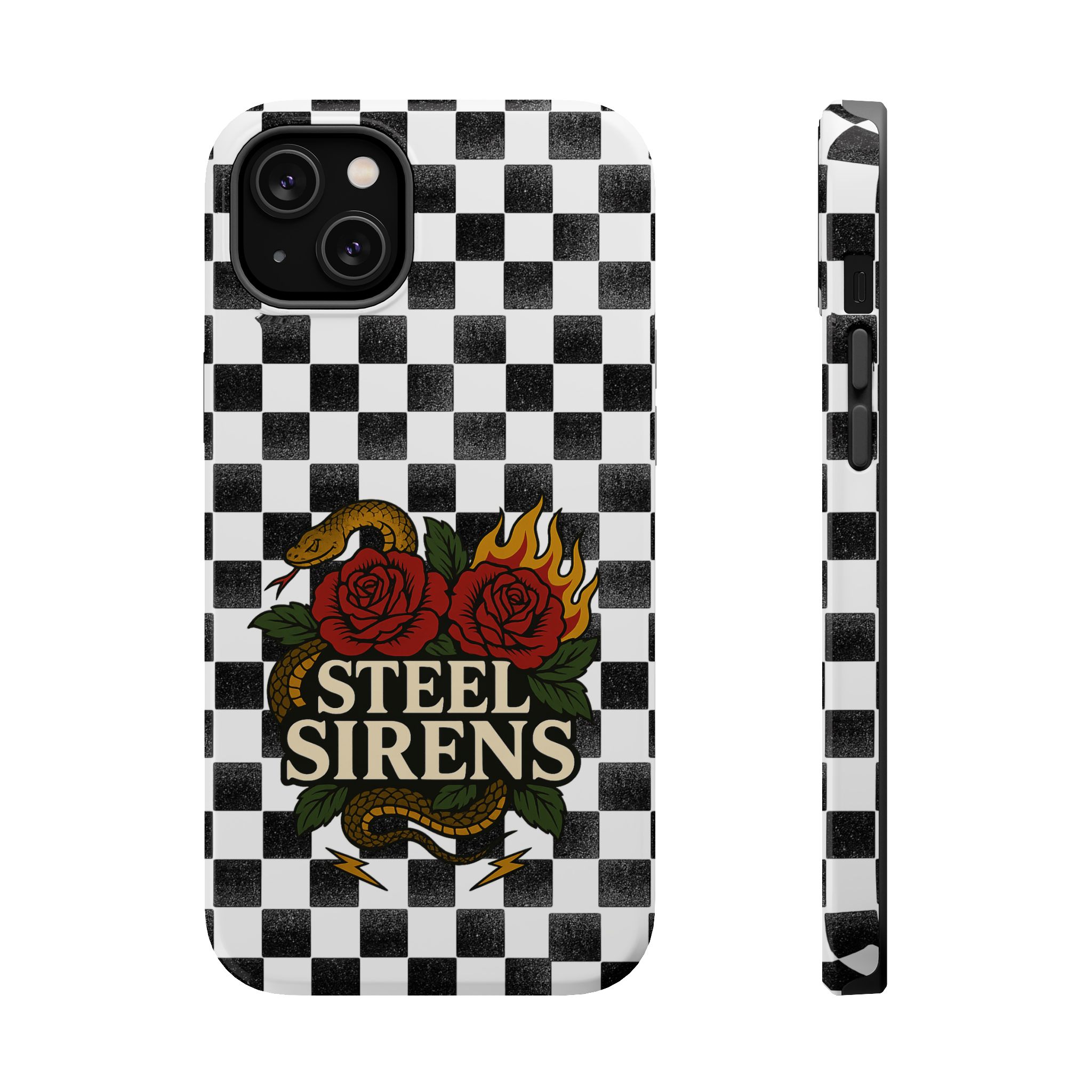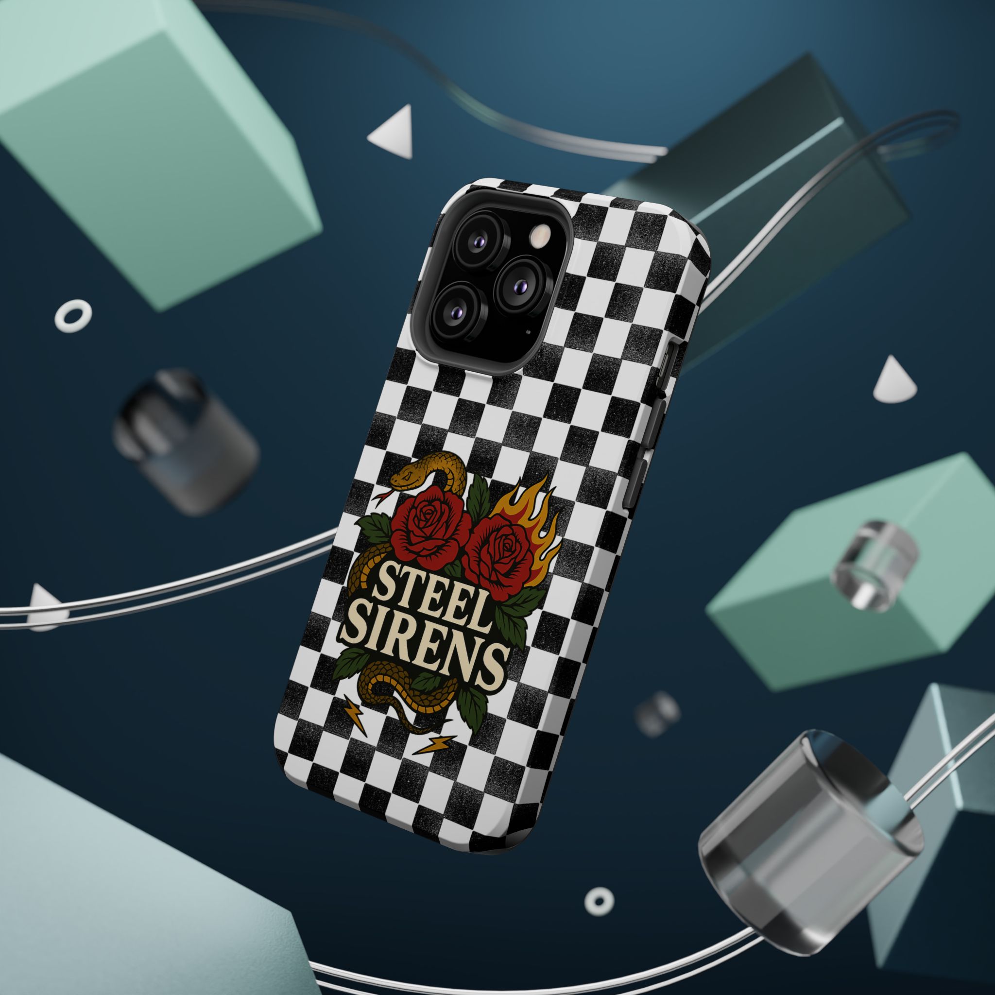 Protect your phone with attitude. The Checkered Flame Siren iPhone Case features Steel Sirens’ iconic logo set against a bold black-and-white checkerboard backdrop, finished with fiery details, roses, and a venomous edge. Built for riders, rebels, and anyone who refuses to blend in, this case doesn’t just guard your phone, it makes a statement.
