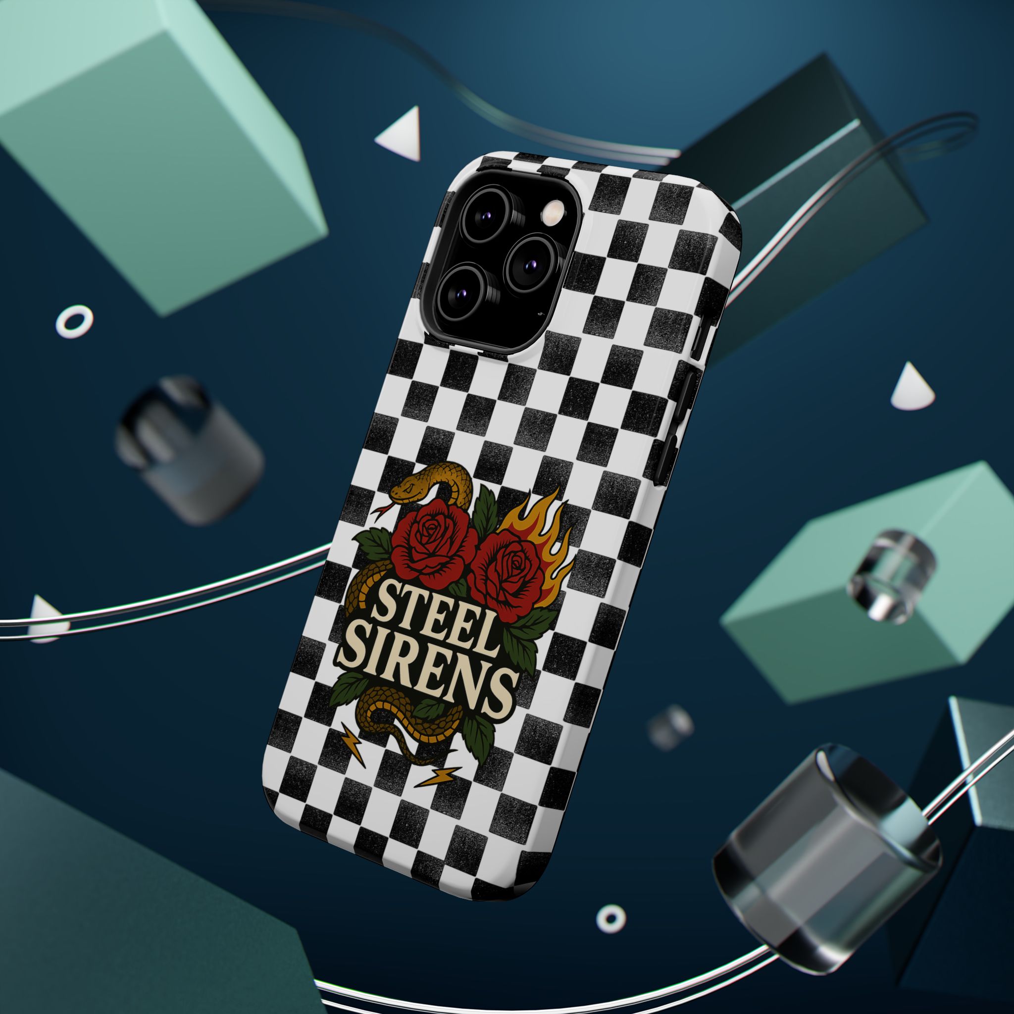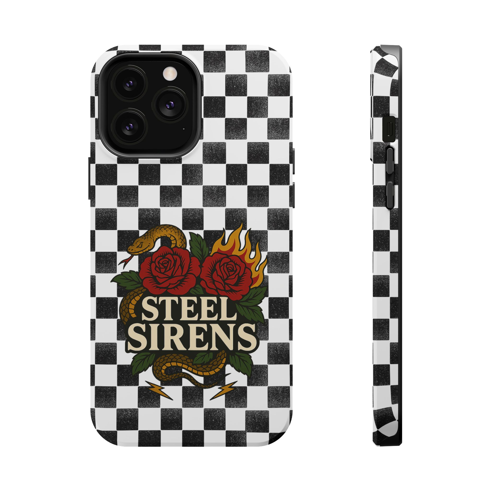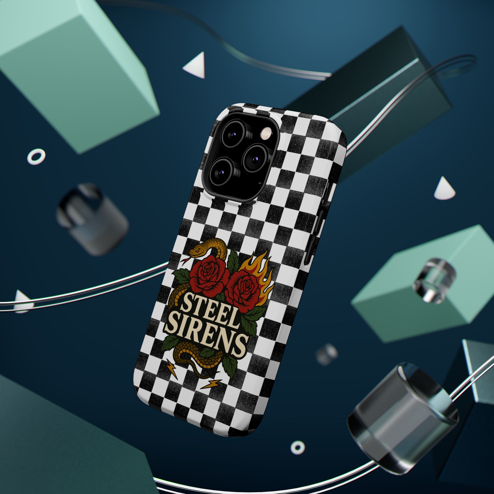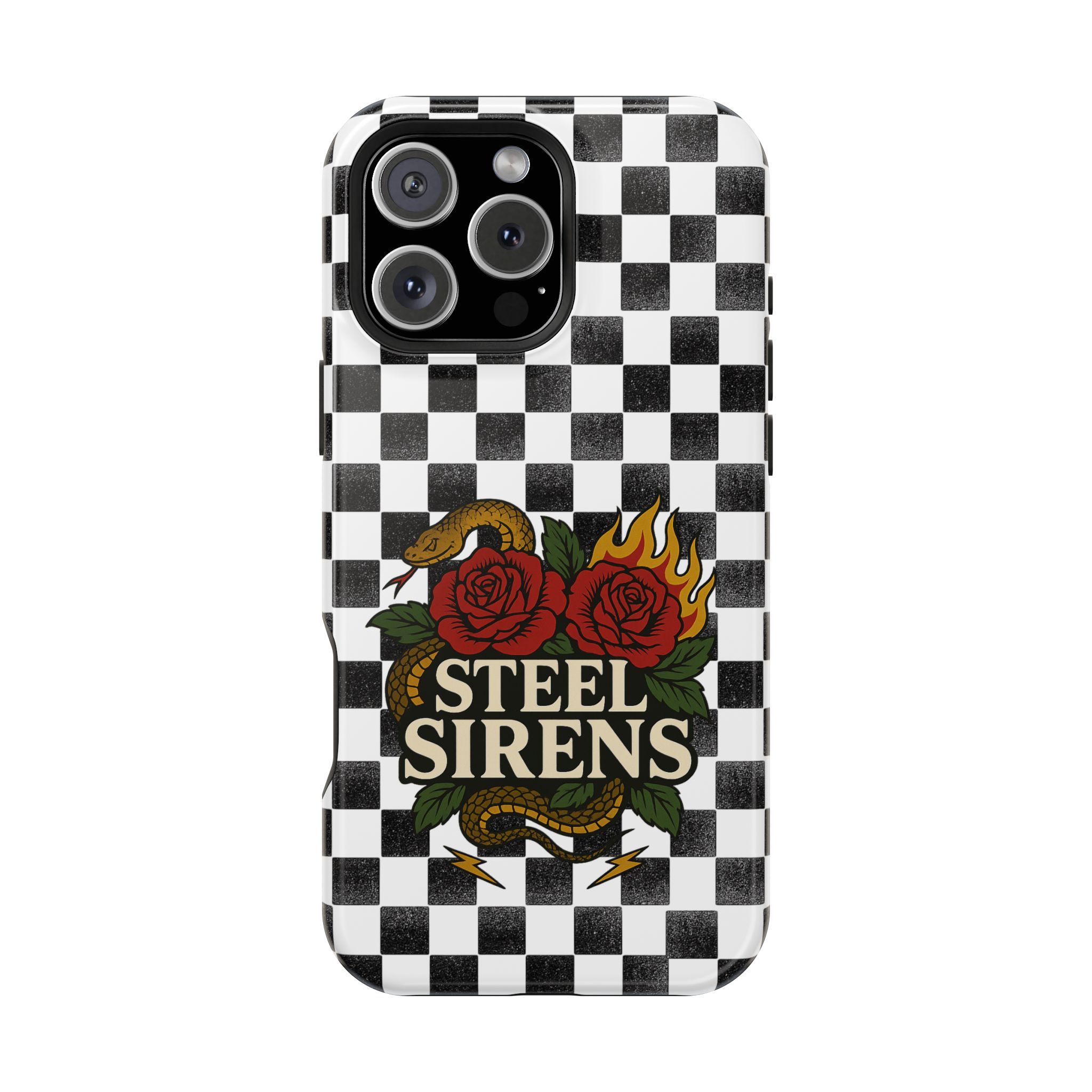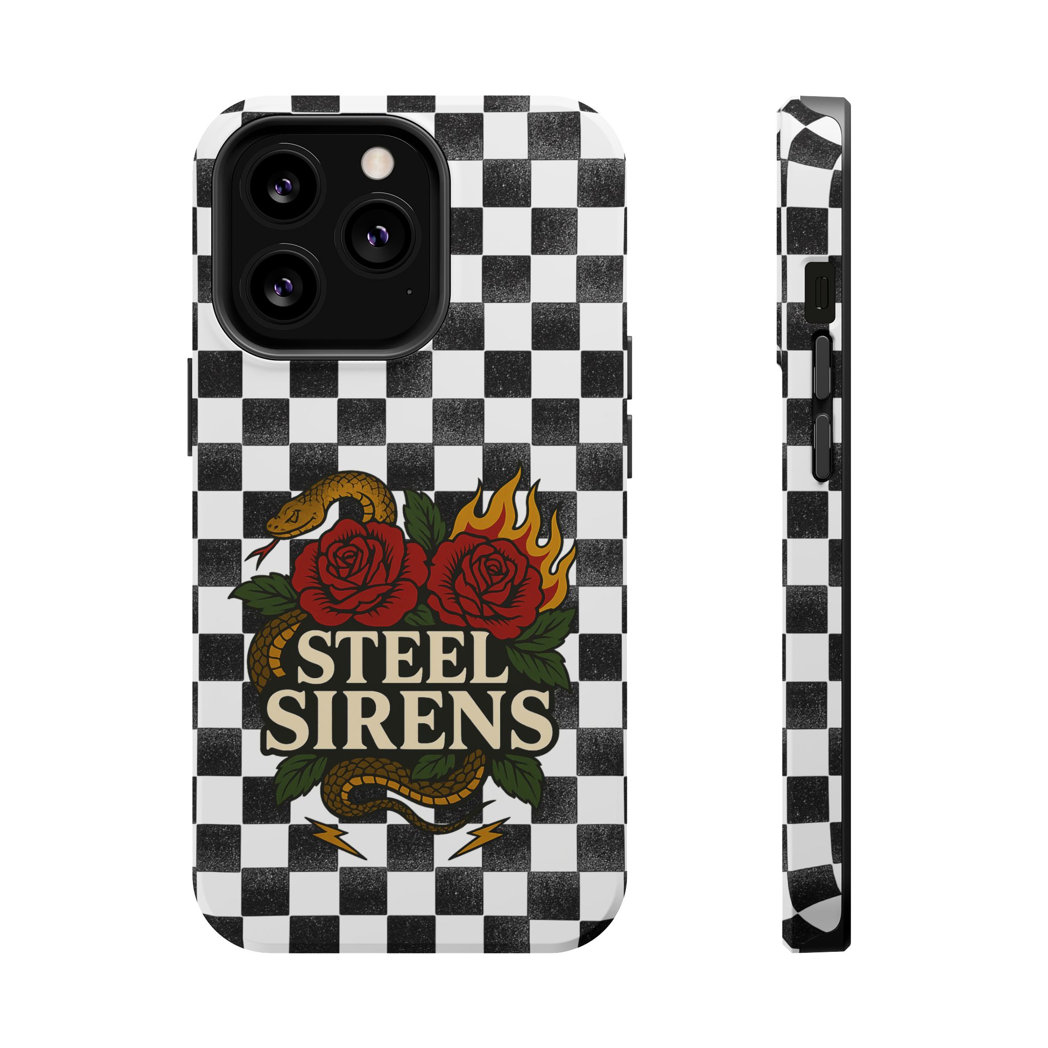 Protect your phone with attitude. The Checkered Flame Siren iPhone Case features Steel Sirens’ iconic logo set against a bold black-and-white checkerboard backdrop, finished with fiery details, roses, and a venomous edge. Built for riders, rebels, and anyone who refuses to blend in, this case doesn’t just guard your phone, it makes a statement.