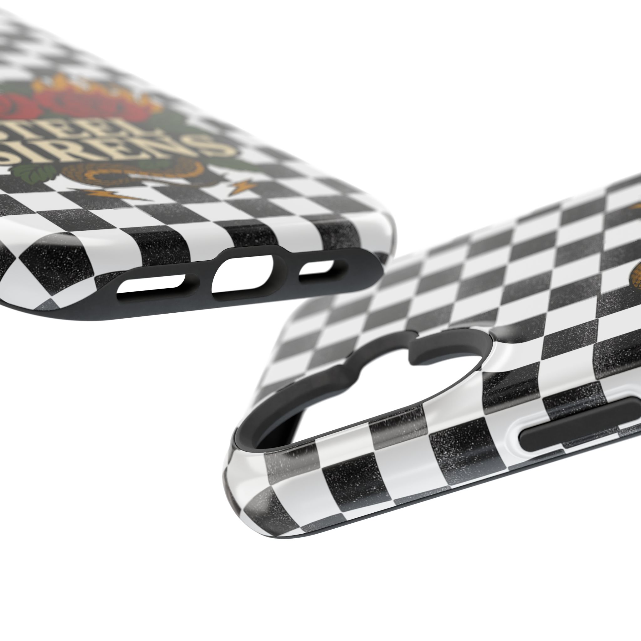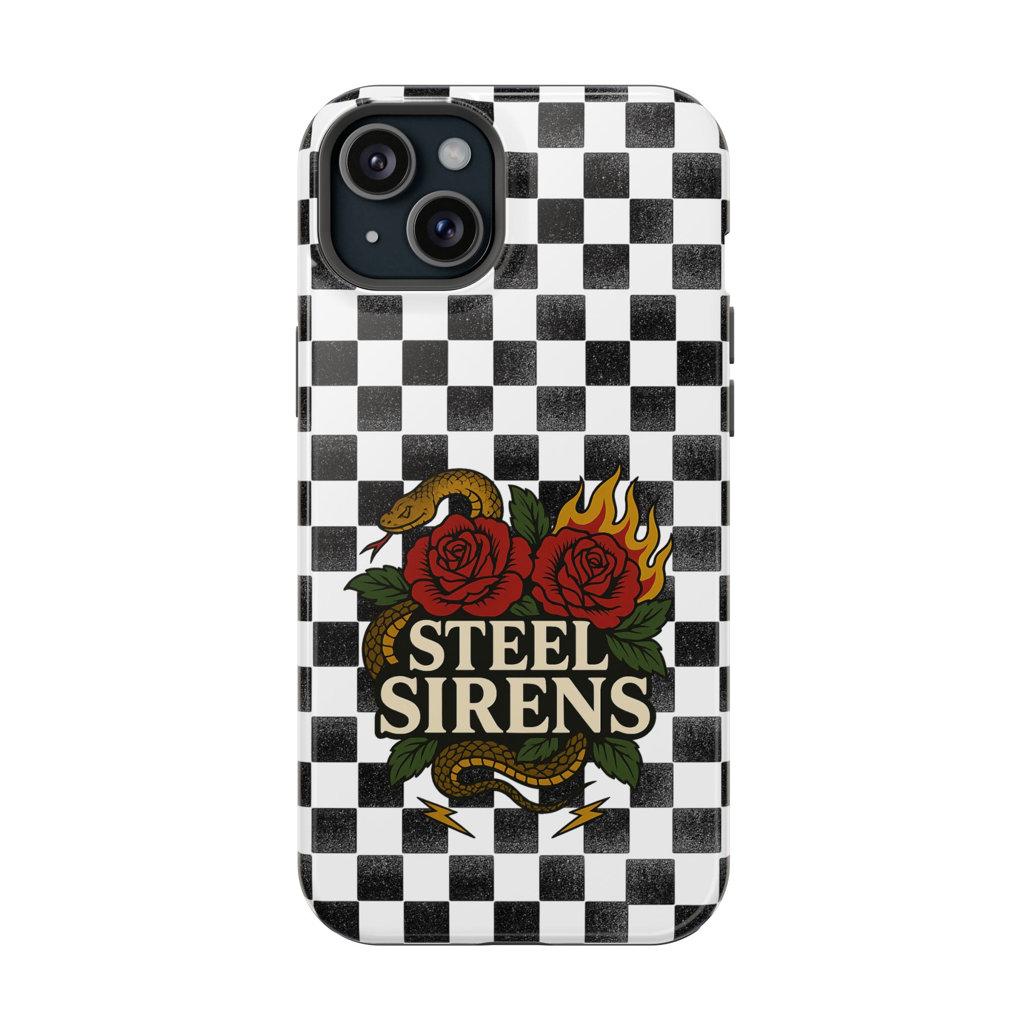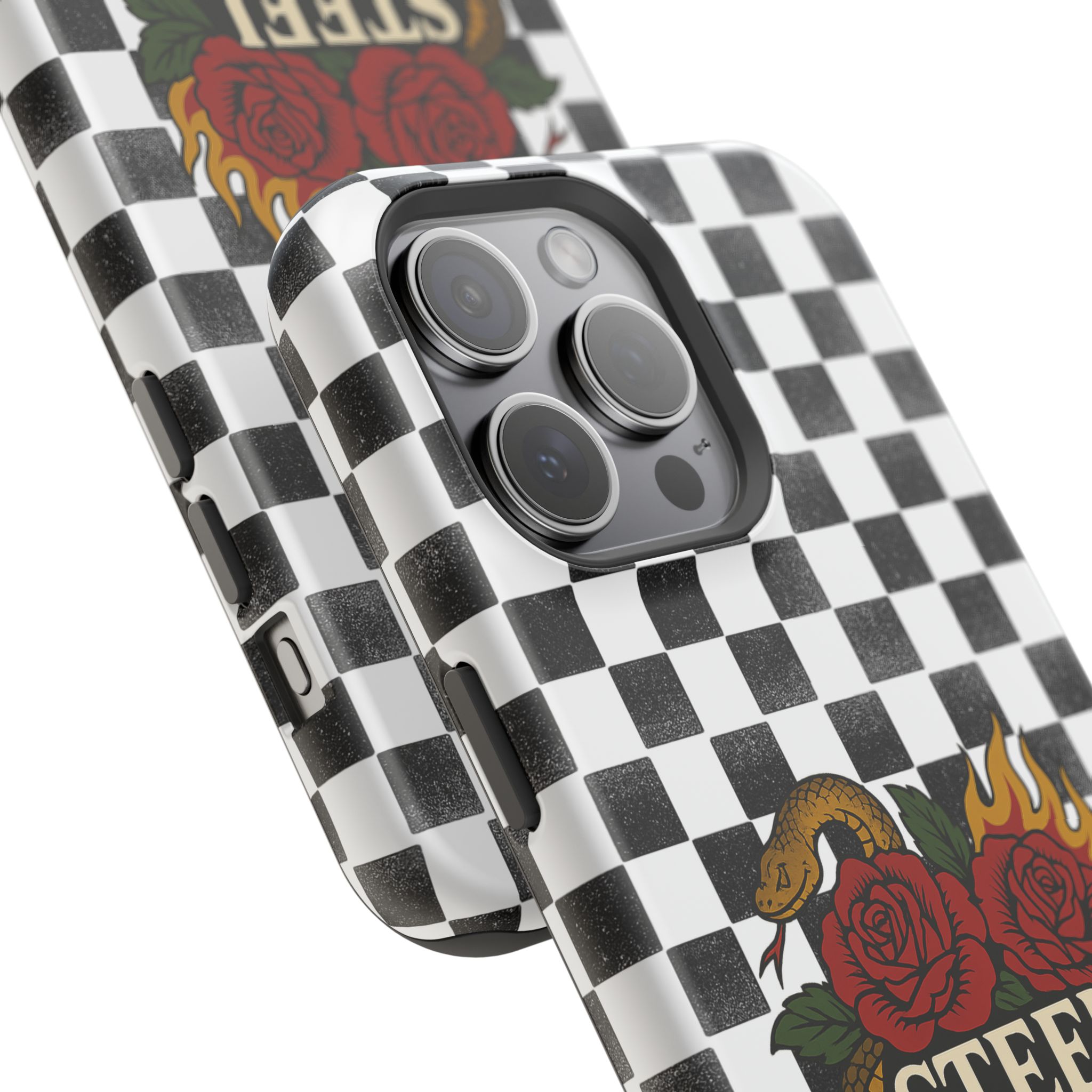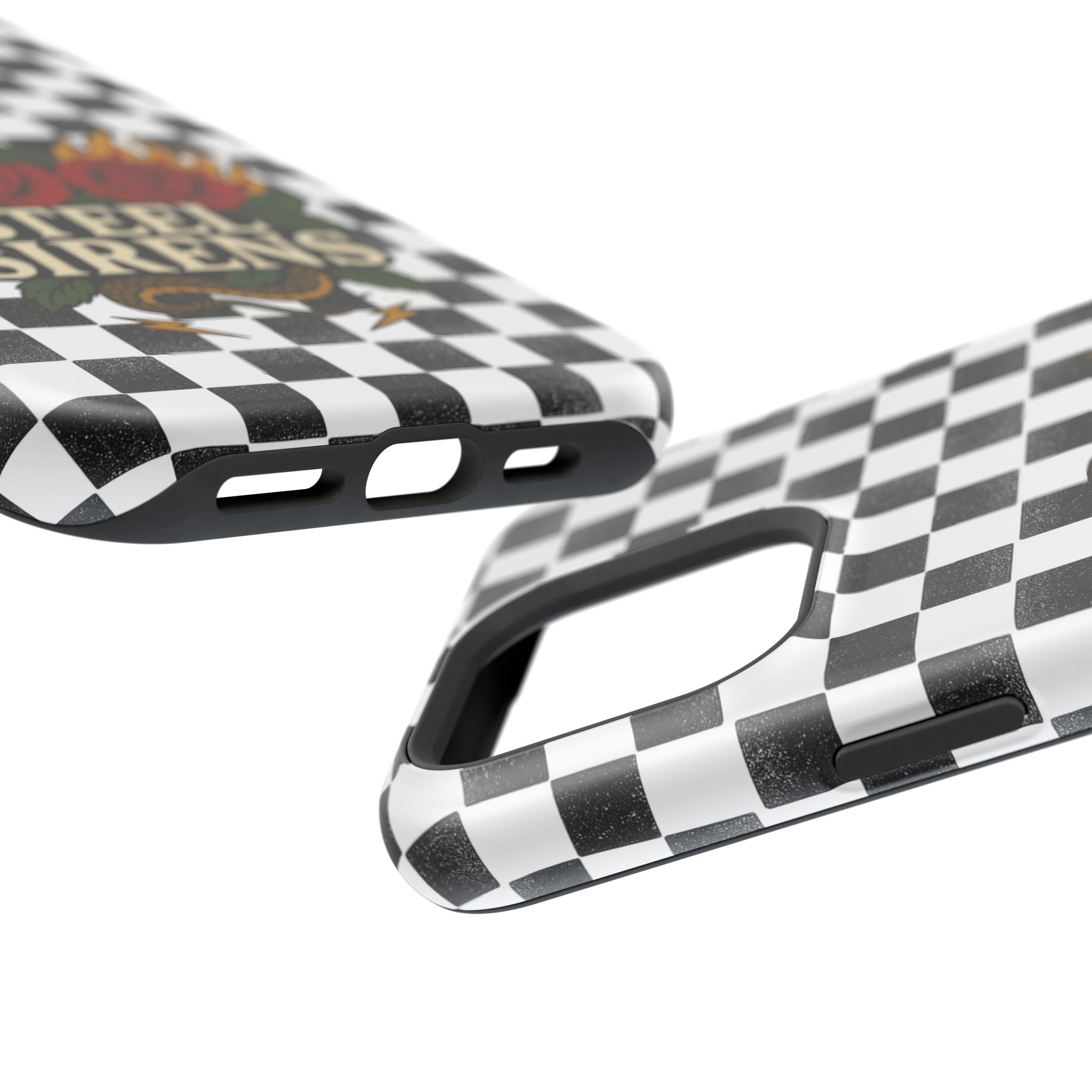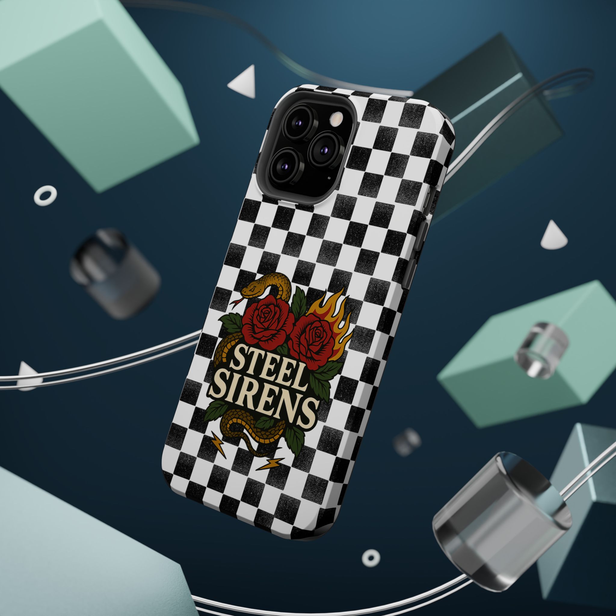 Protect your phone with attitude. The Checkered Flame Siren iPhone Case features Steel Sirens’ iconic logo set against a bold black-and-white checkerboard backdrop, finished with fiery details, roses, and a venomous edge. Built for riders, rebels, and anyone who refuses to blend in, this case doesn’t just guard your phone, it makes a statement.