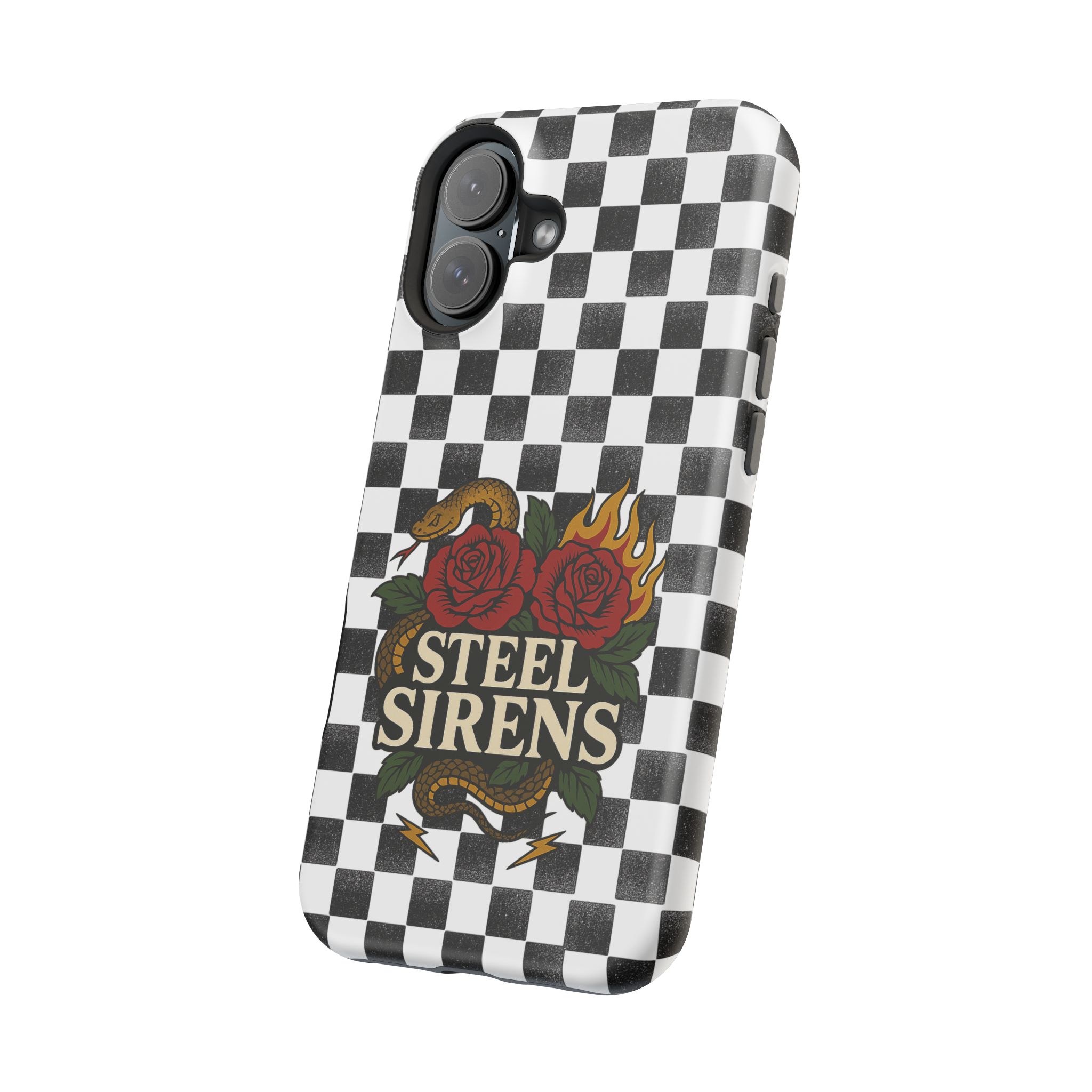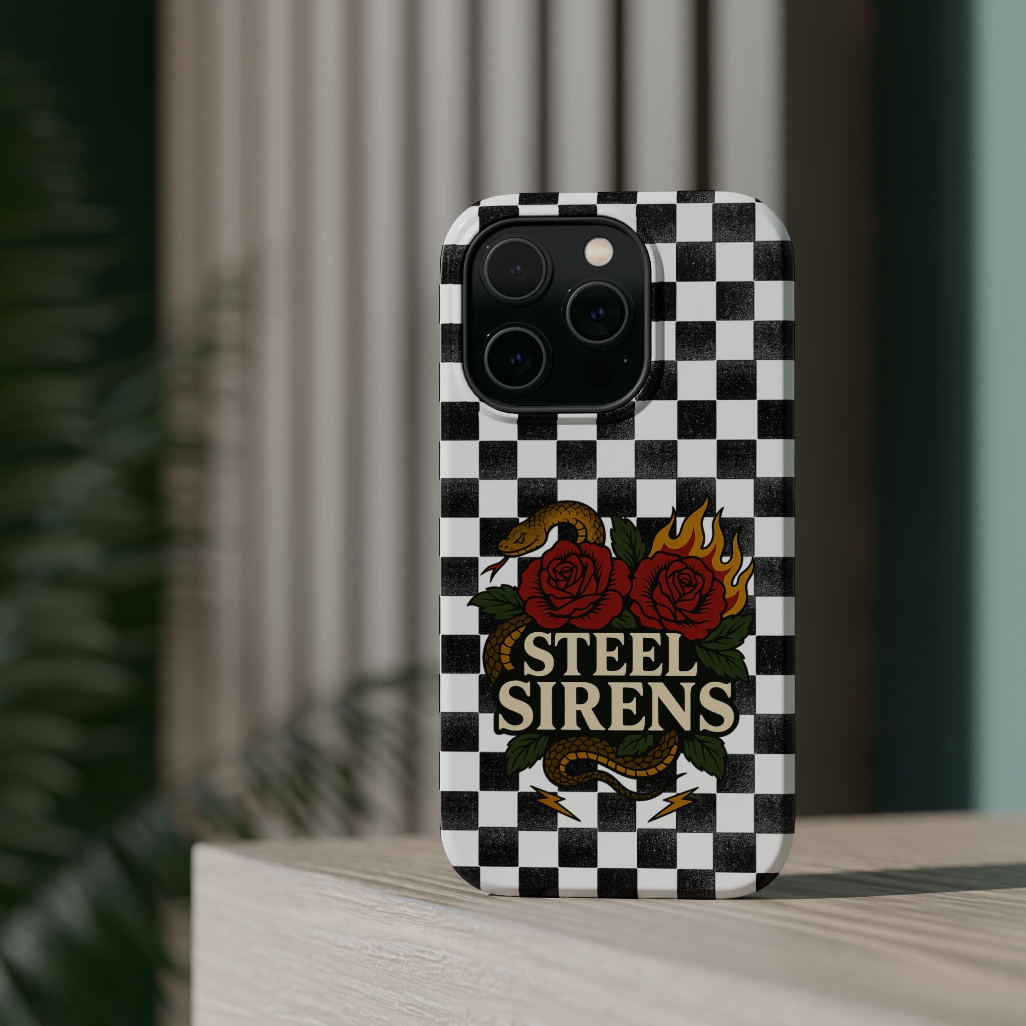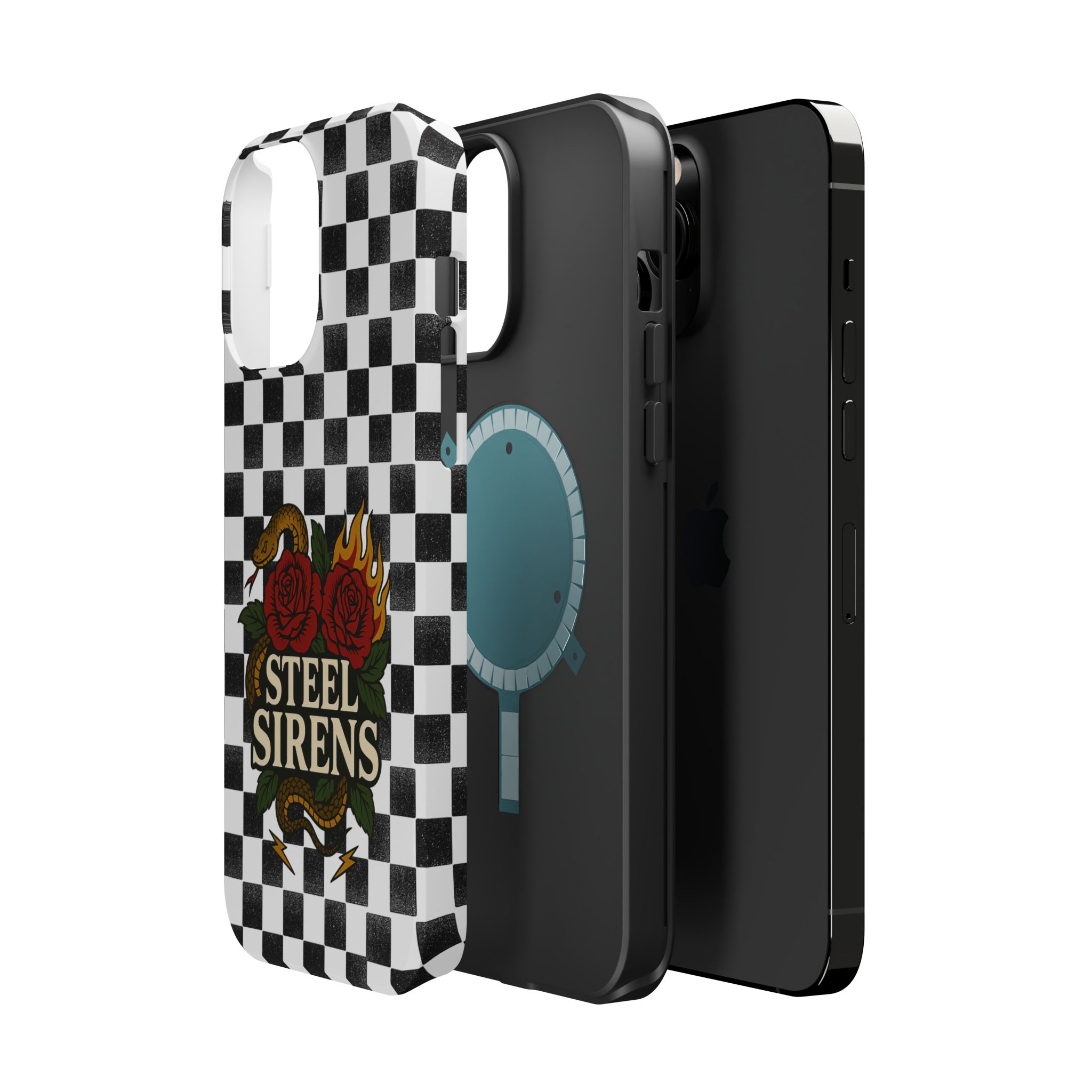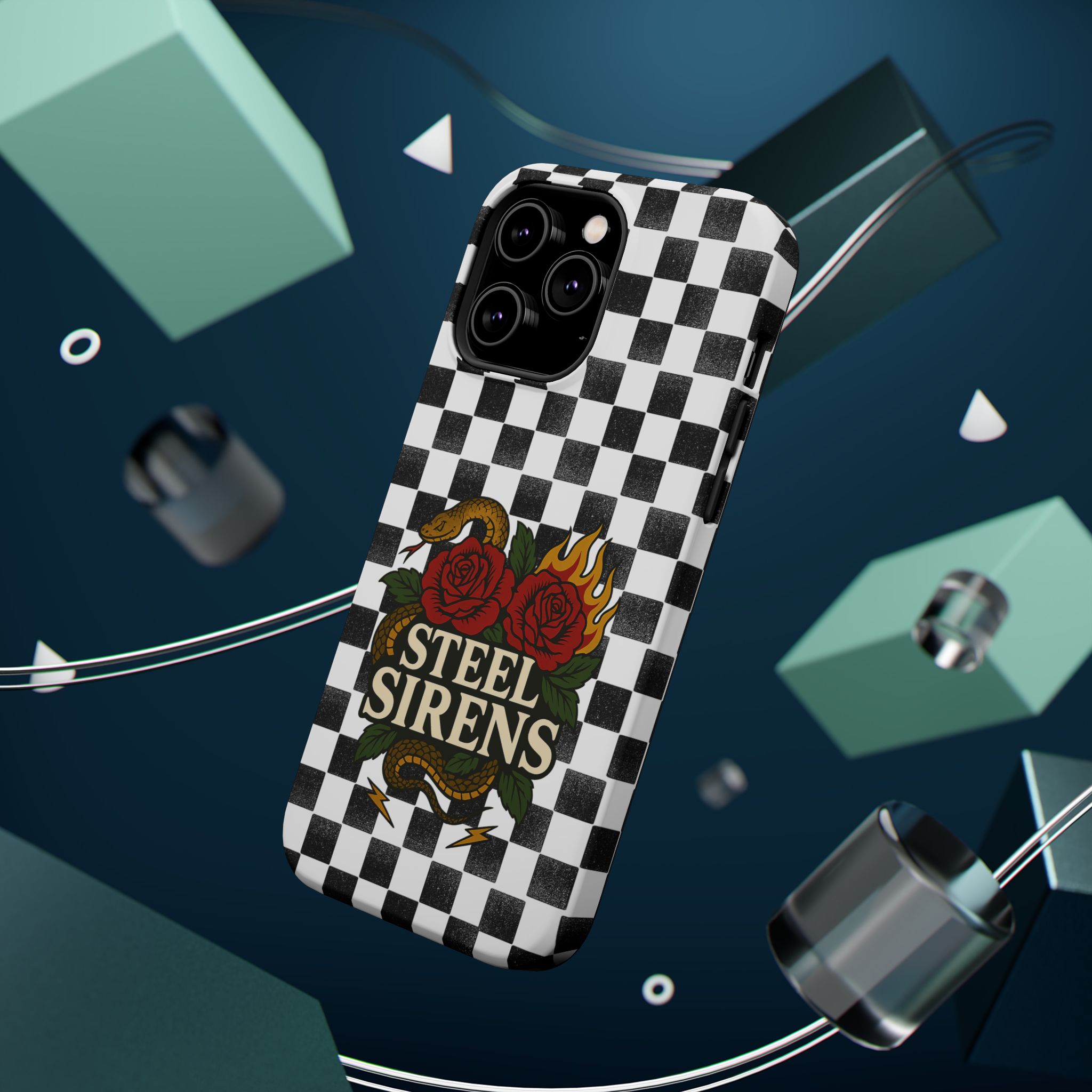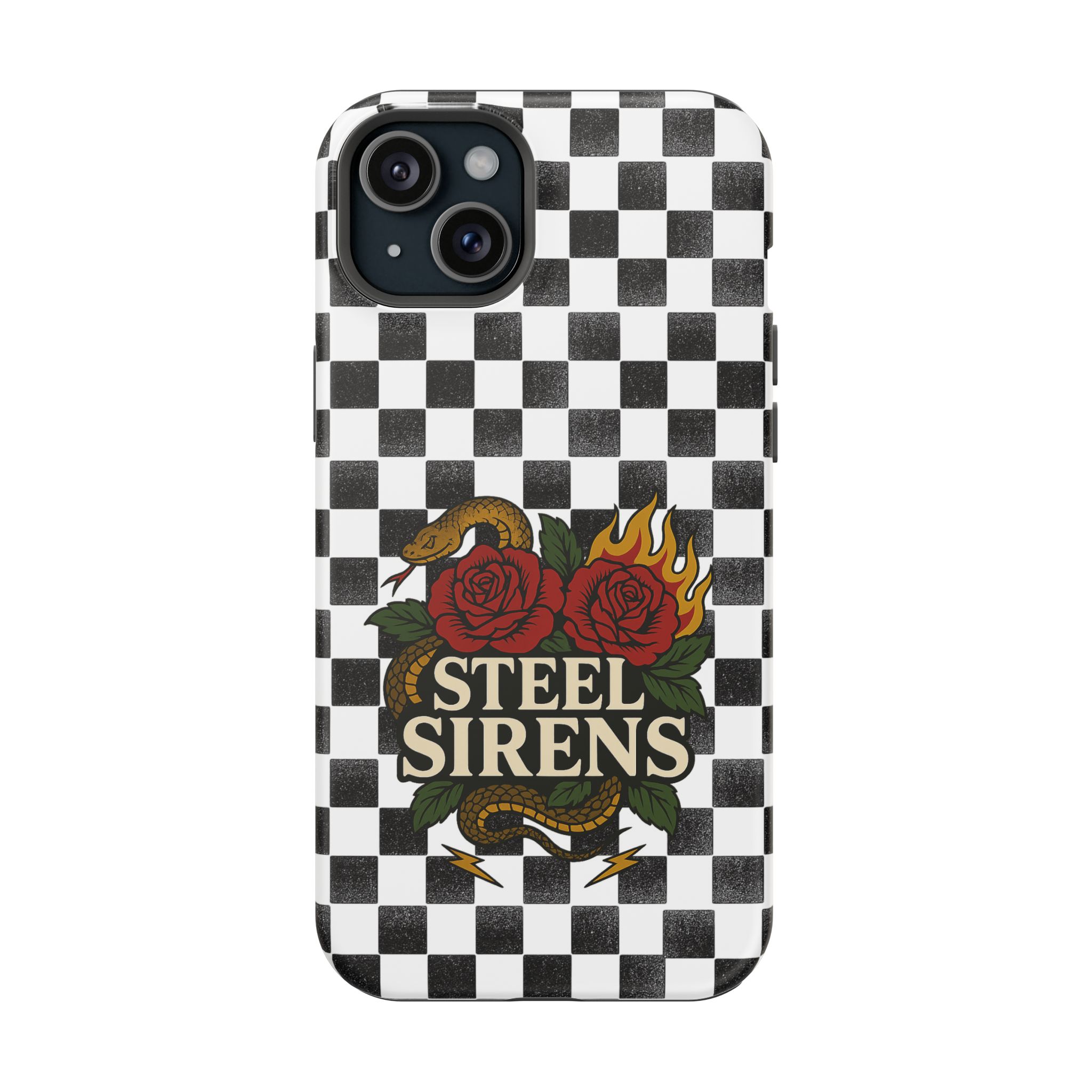 Protect your phone with attitude. The Checkered Flame Siren iPhone Case features Steel Sirens’ iconic logo set against a bold black-and-white checkerboard backdrop, finished with fiery details, roses, and a venomous edge. Built for riders, rebels, and anyone who refuses to blend in, this case doesn’t just guard your phone, it makes a statement.