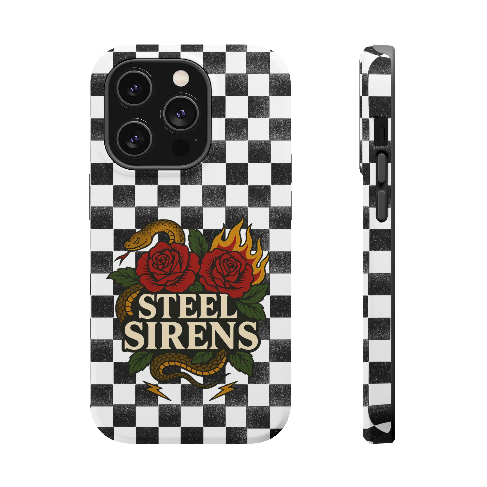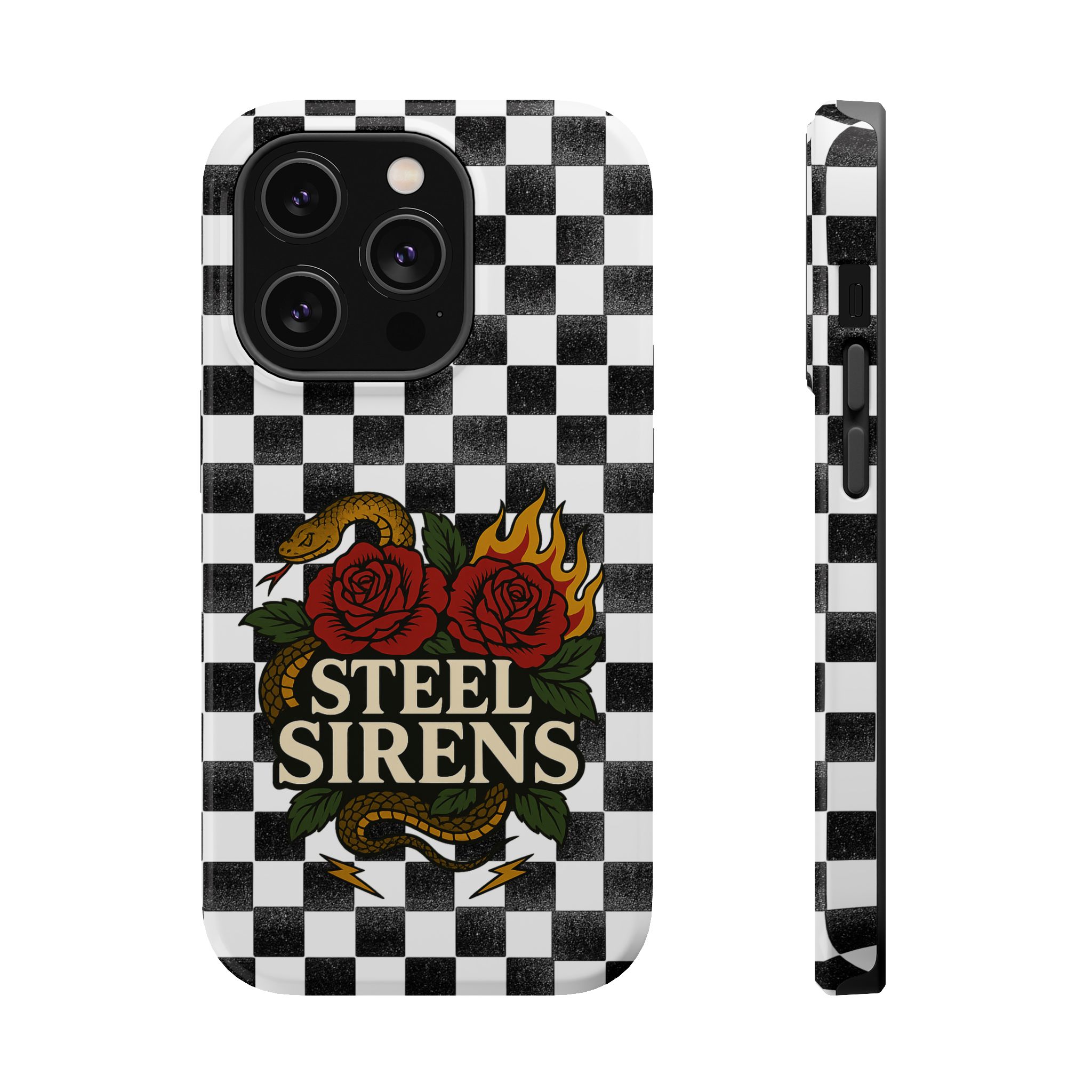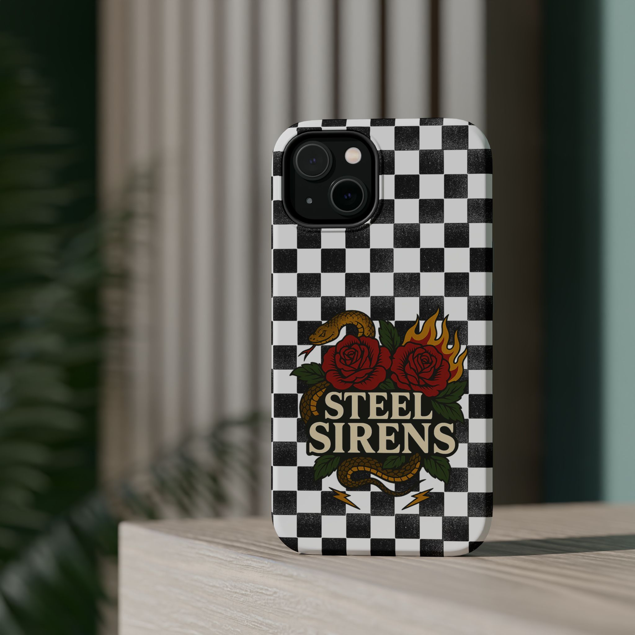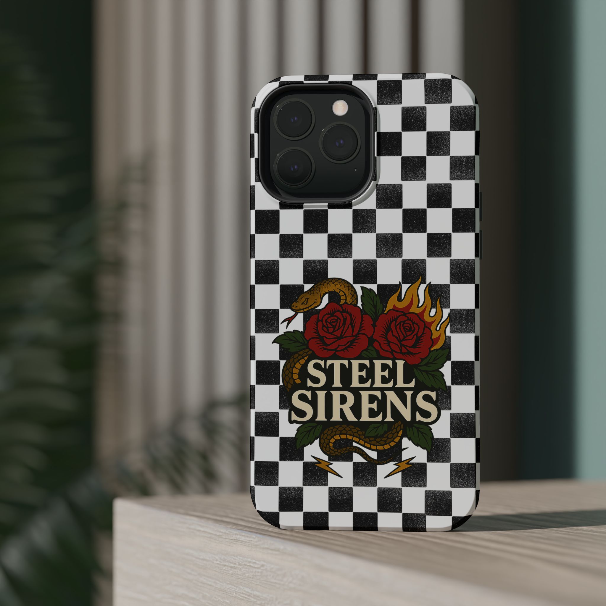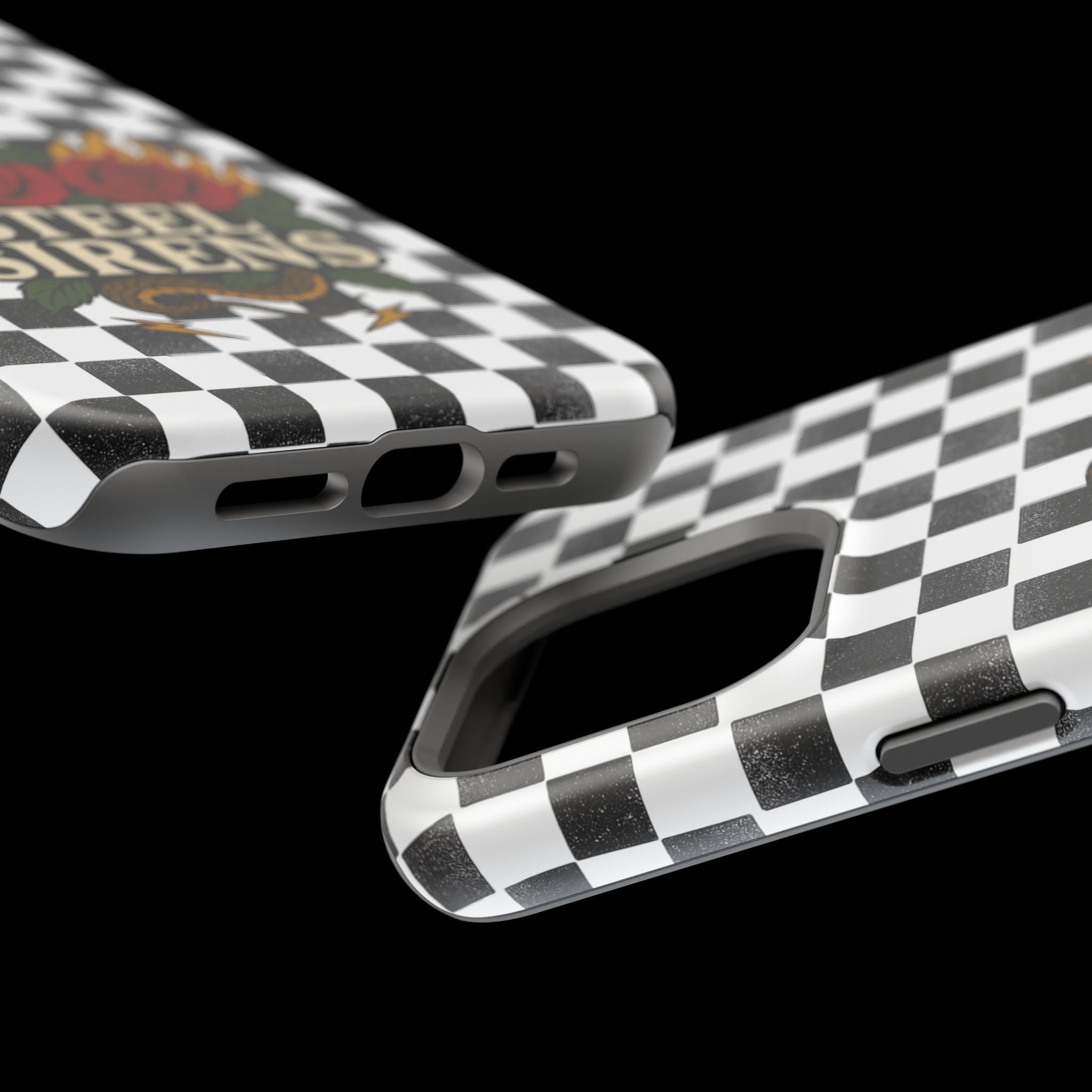 Protect your phone with attitude. The Checkered Flame Siren iPhone Case features Steel Sirens’ iconic logo set against a bold black-and-white checkerboard backdrop, finished with fiery details, roses, and a venomous edge. Built for riders, rebels, and anyone who refuses to blend in, this case doesn’t just guard your phone, it makes a statement.