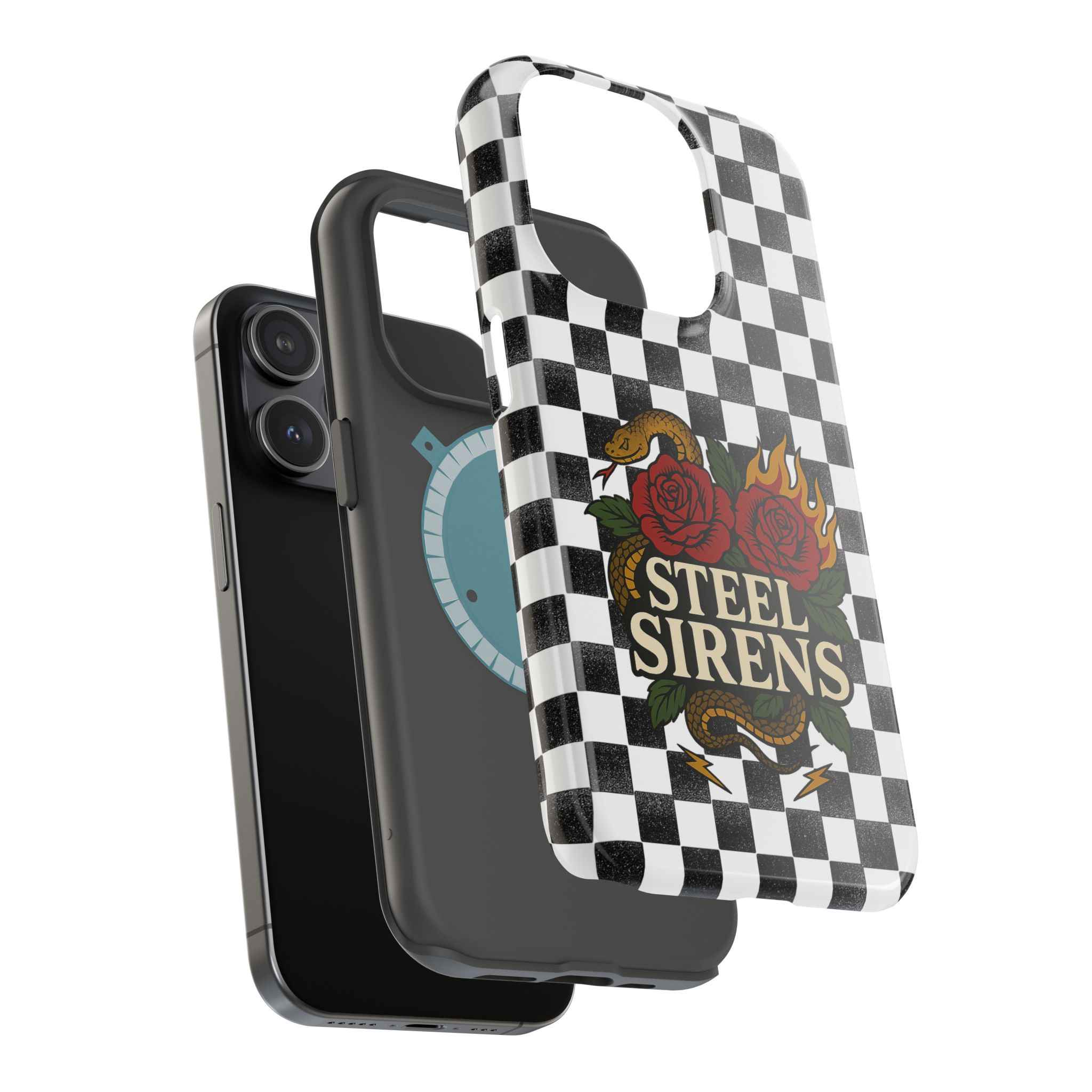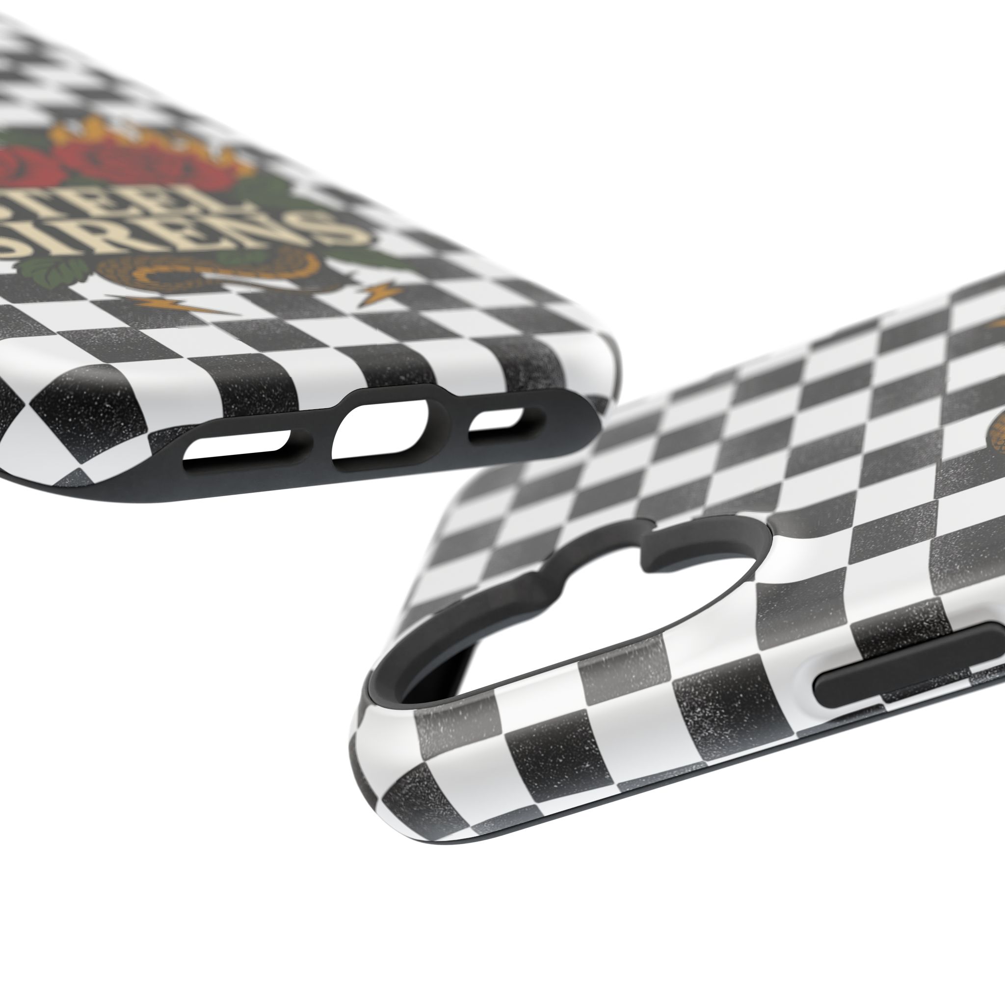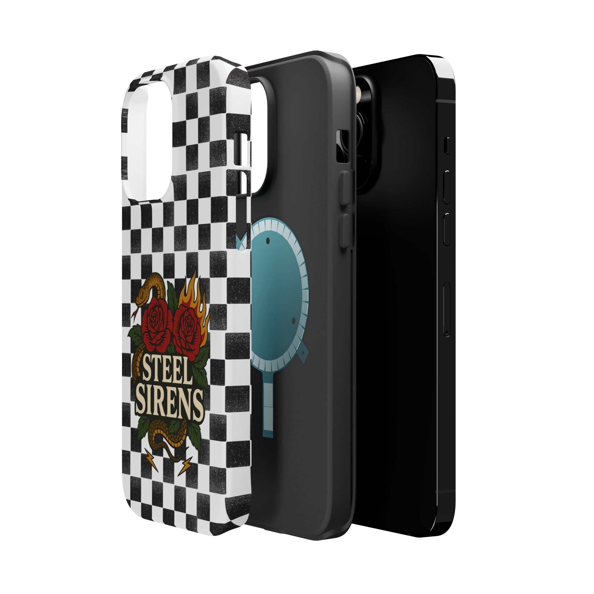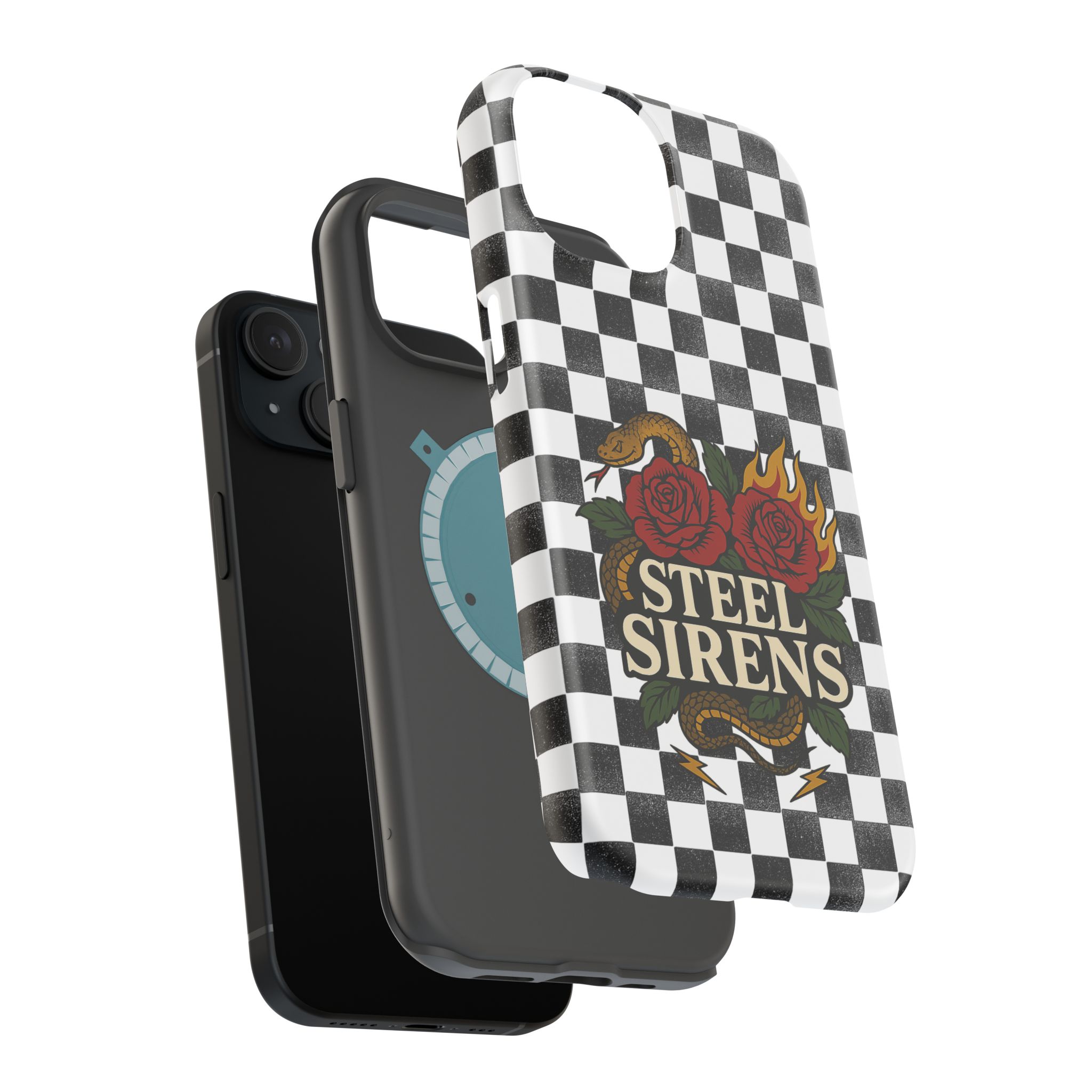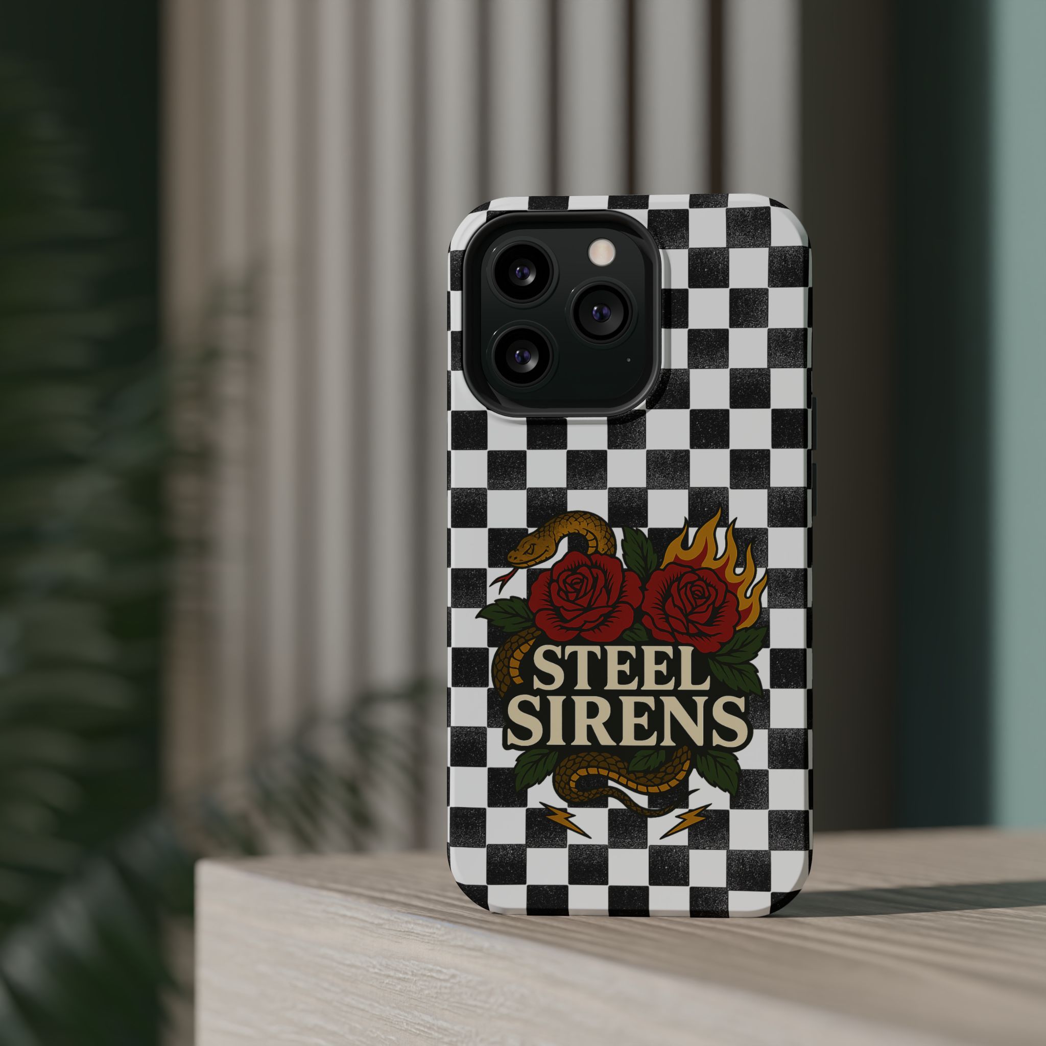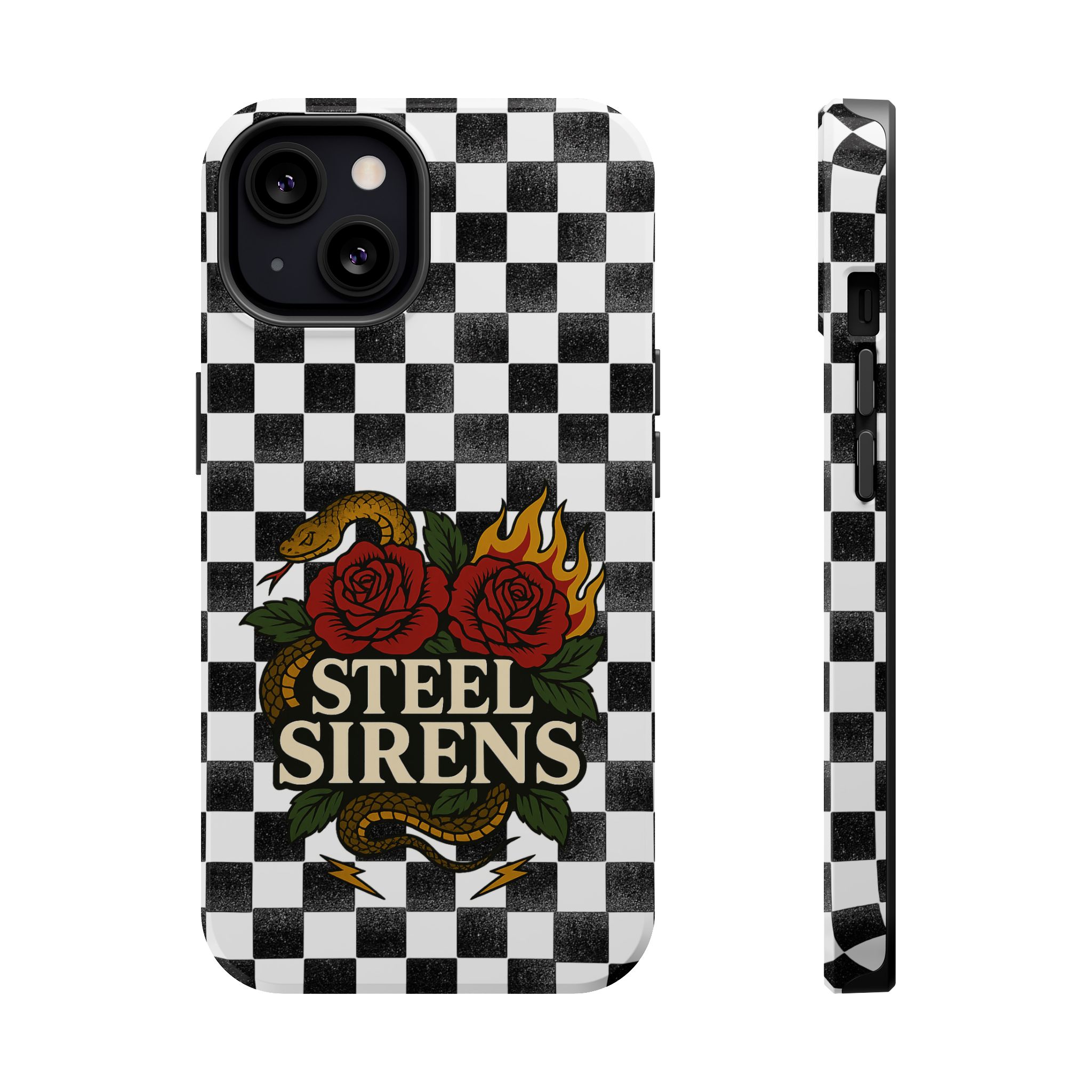 Protect your phone with attitude. The Checkered Flame Siren iPhone Case features Steel Sirens’ iconic logo set against a bold black-and-white checkerboard backdrop, finished with fiery details, roses, and a venomous edge. Built for riders, rebels, and anyone who refuses to blend in, this case doesn’t just guard your phone, it makes a statement.
