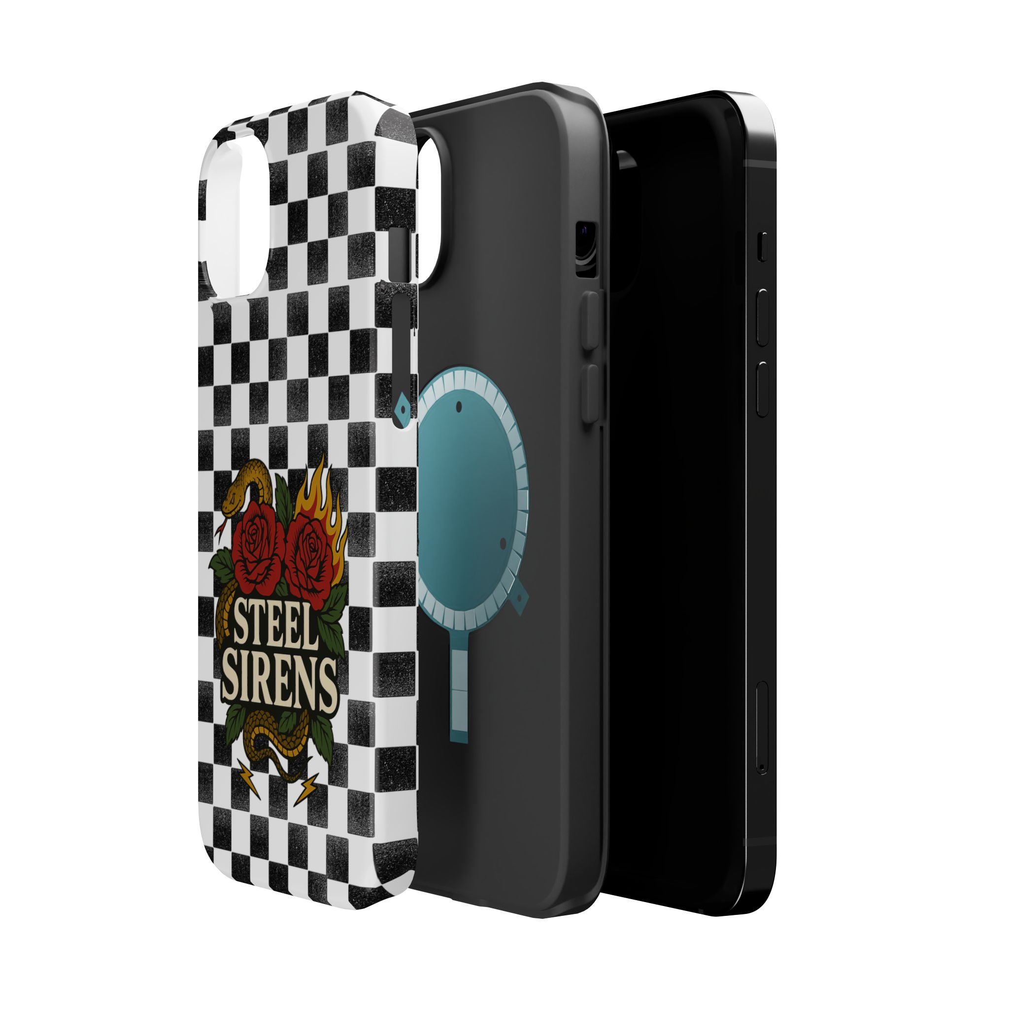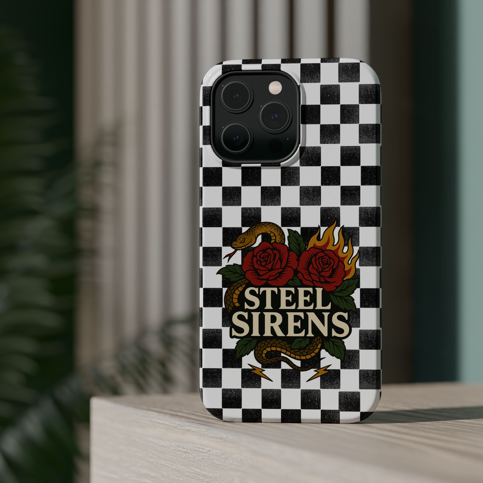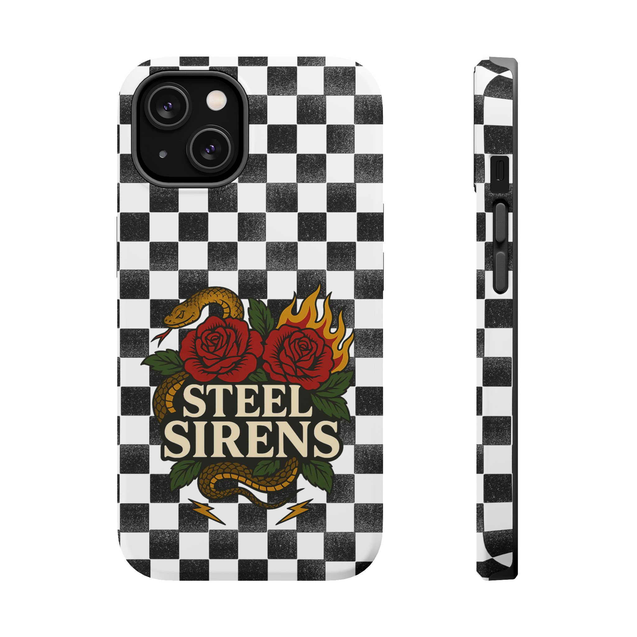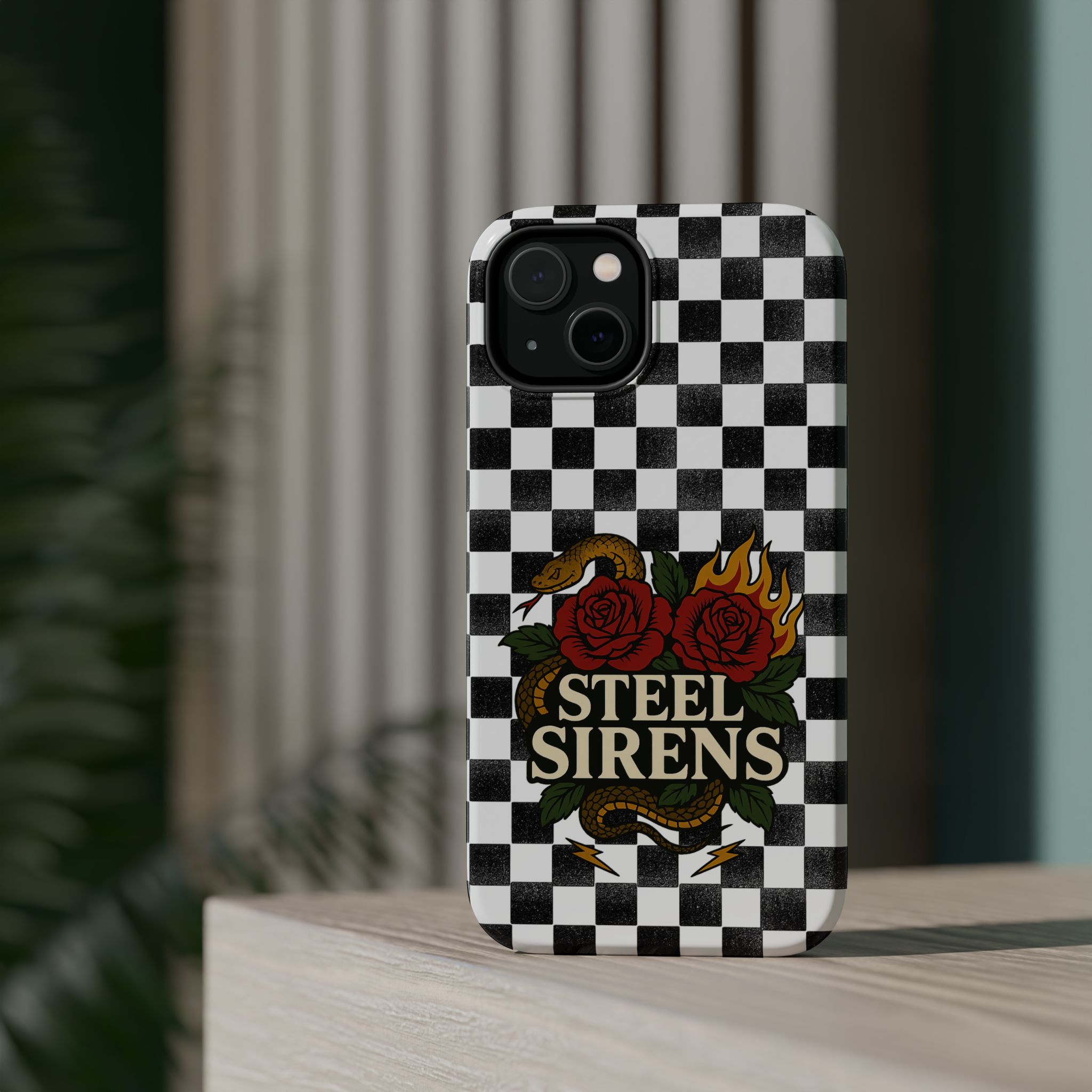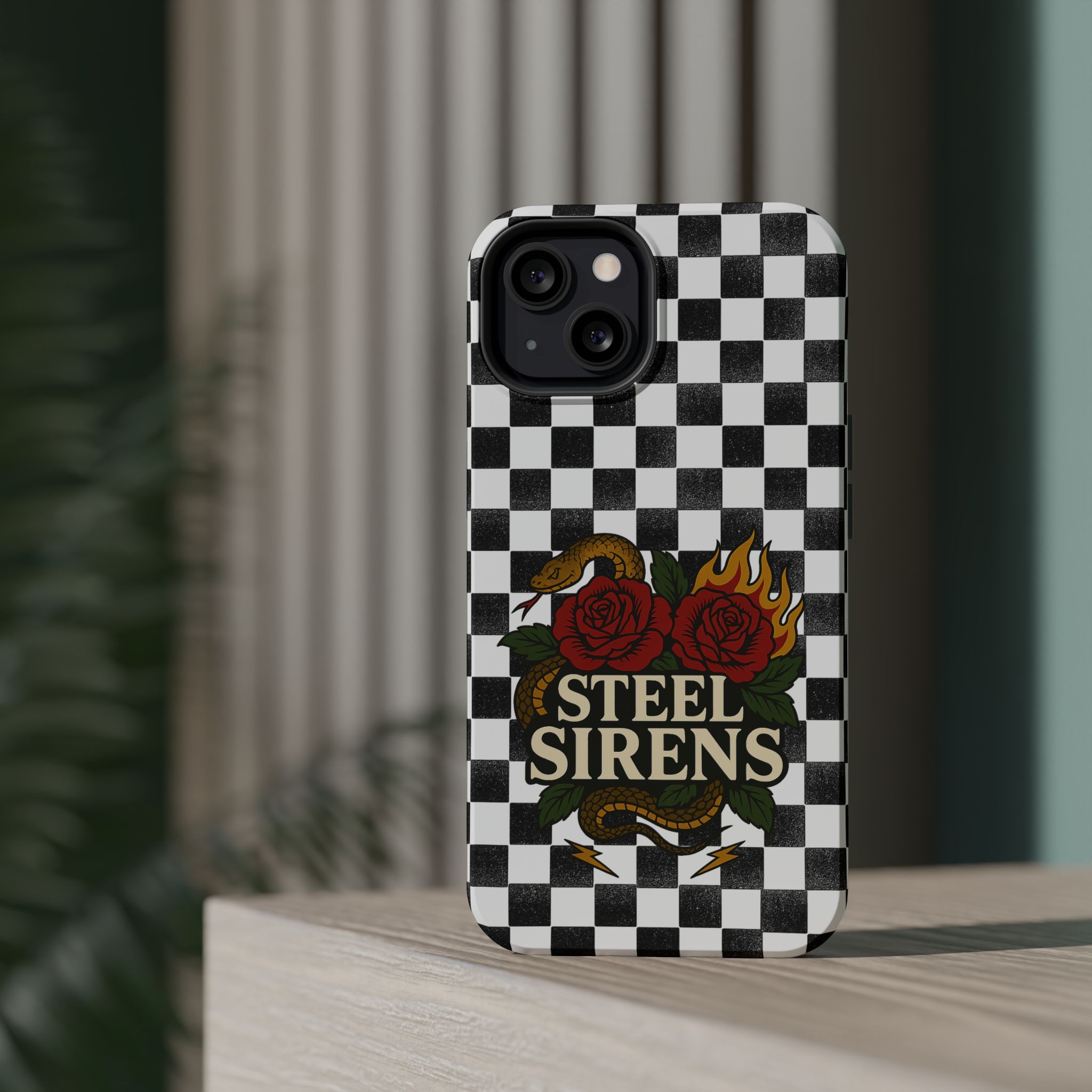 Protect your phone with attitude. The Checkered Flame Siren iPhone Case features Steel Sirens’ iconic logo set against a bold black-and-white checkerboard backdrop, finished with fiery details, roses, and a venomous edge. Built for riders, rebels, and anyone who refuses to blend in, this case doesn’t just guard your phone, it makes a statement.