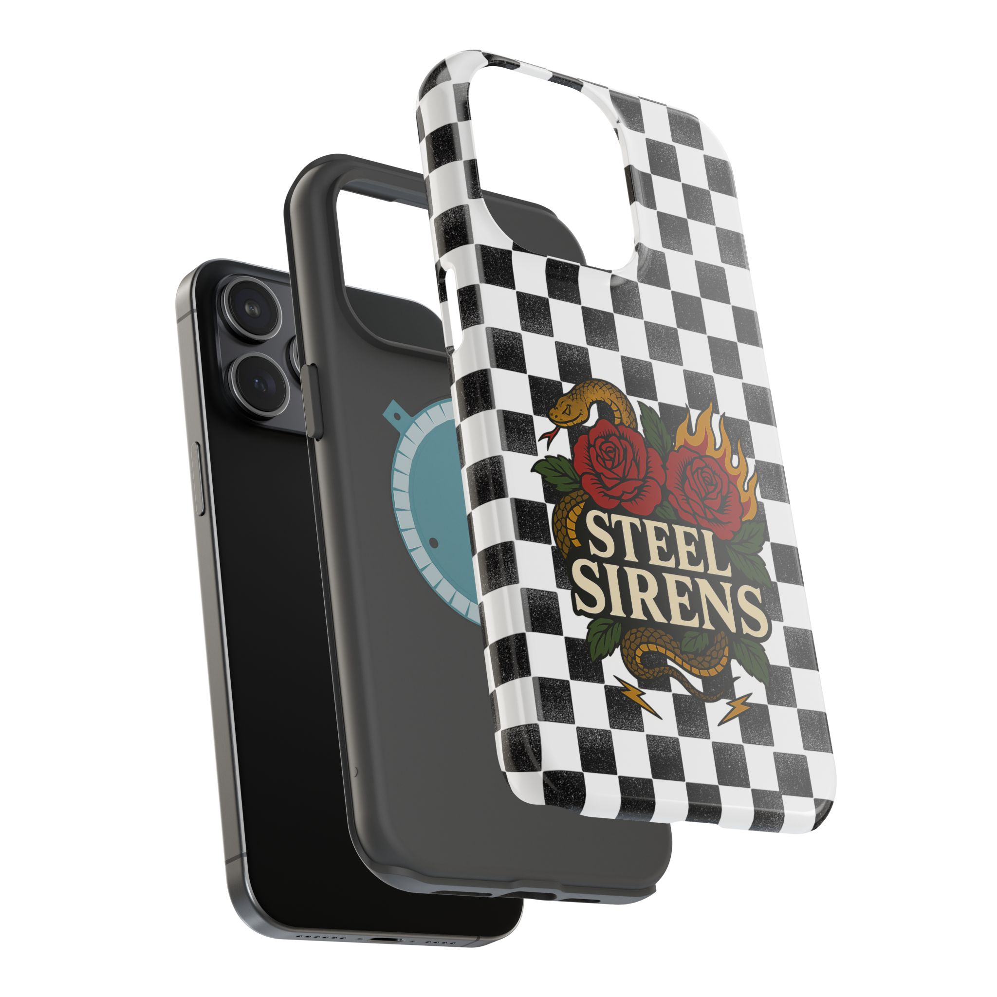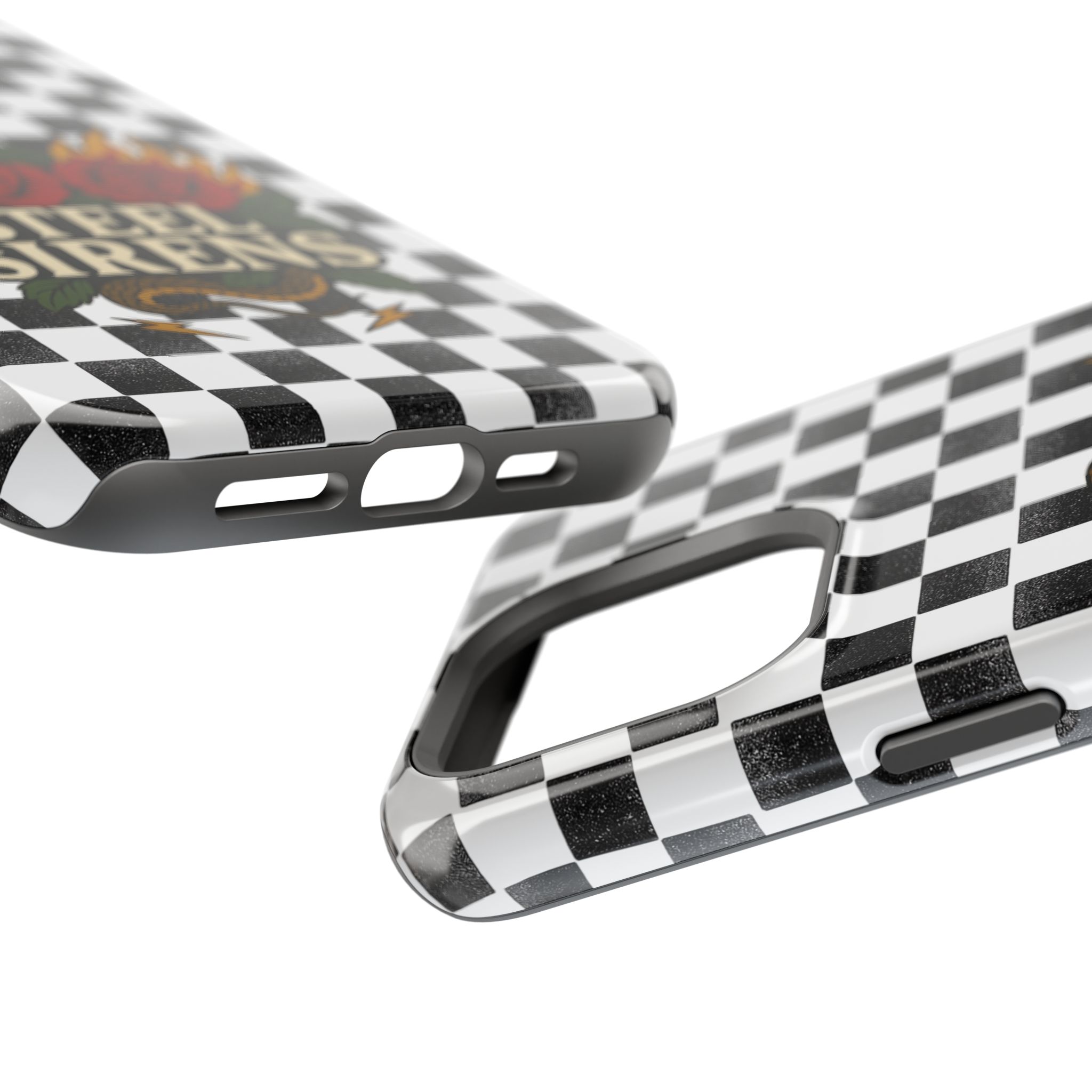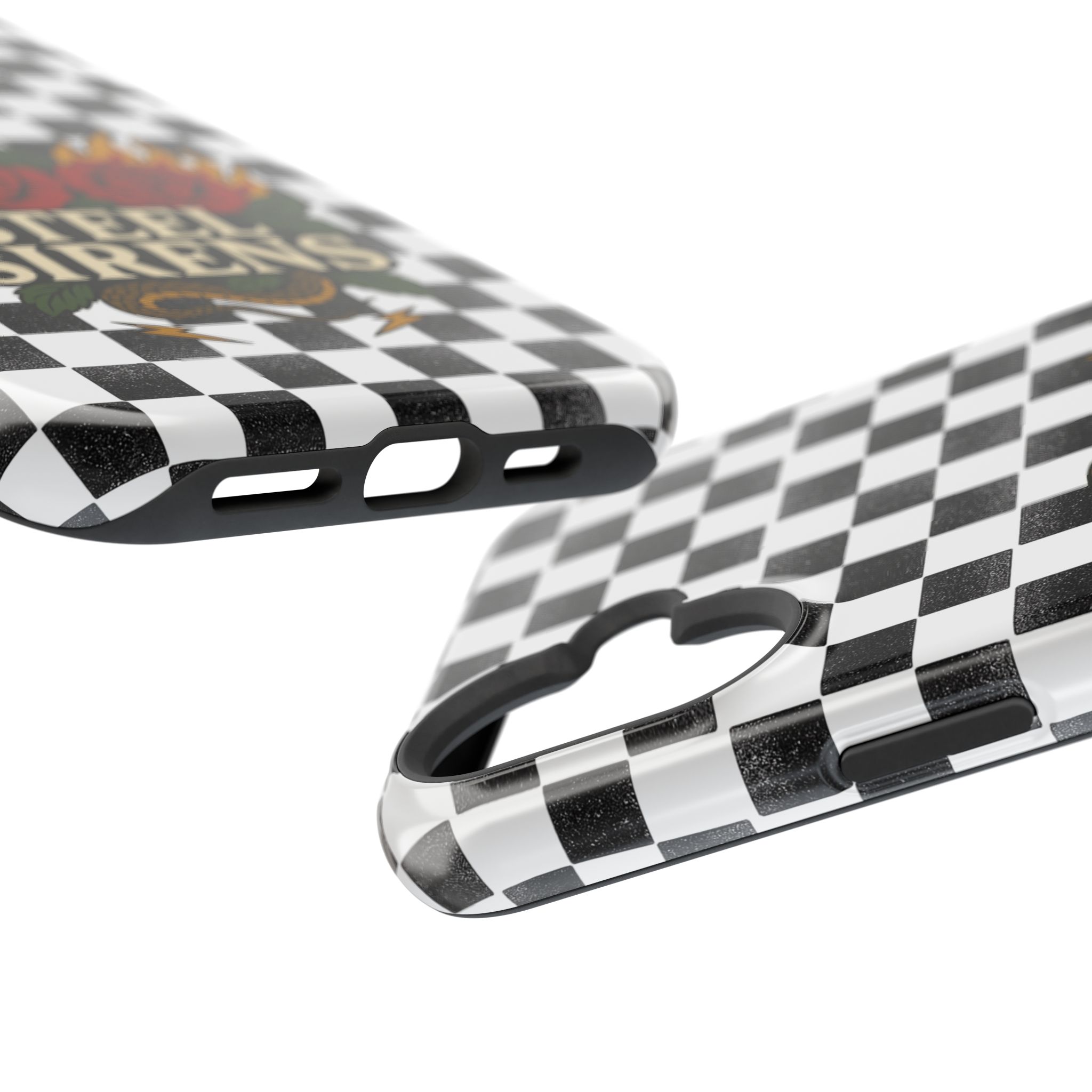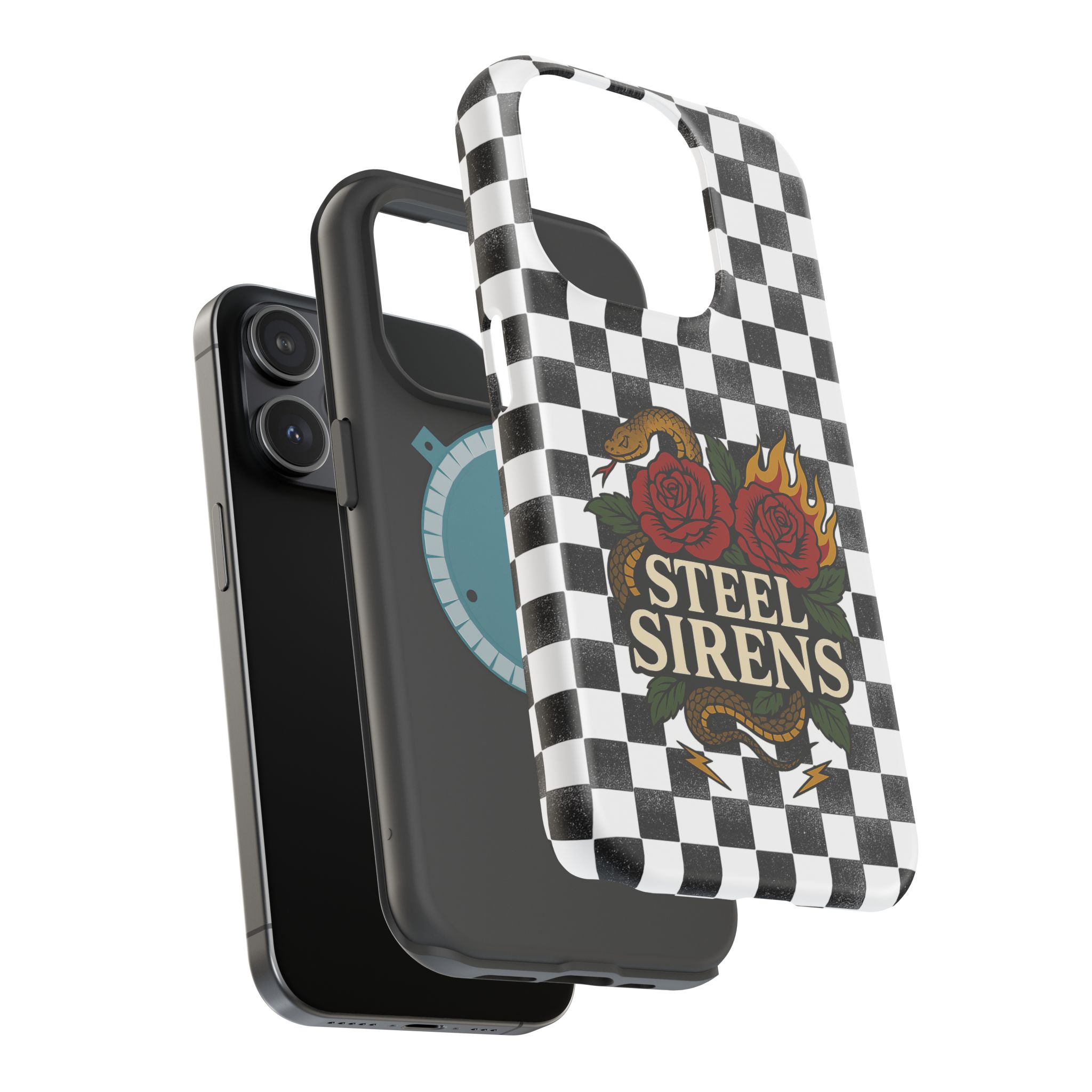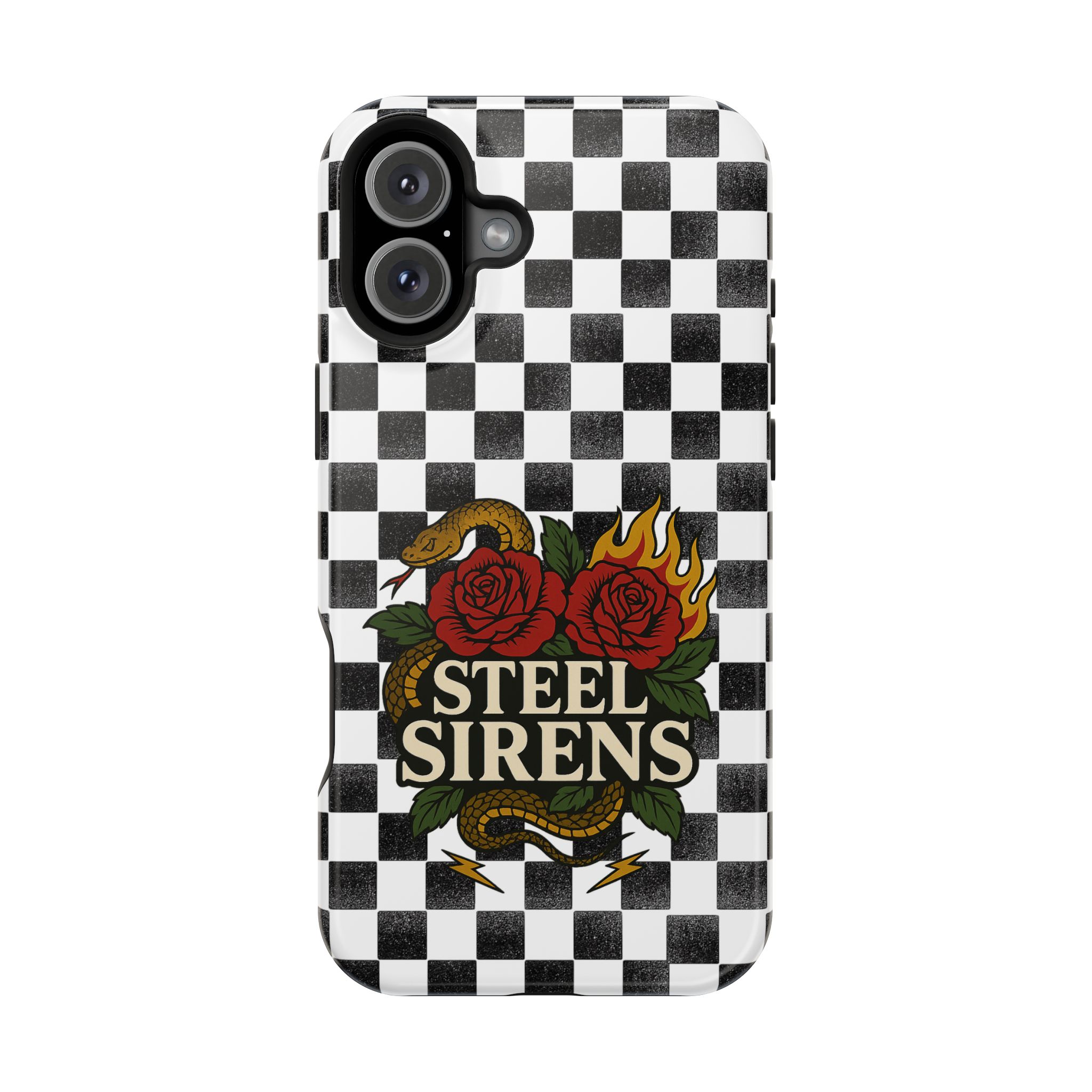 Protect your phone with attitude. The Checkered Flame Siren iPhone Case features Steel Sirens’ iconic logo set against a bold black-and-white checkerboard backdrop, finished with fiery details, roses, and a venomous edge. Built for riders, rebels, and anyone who refuses to blend in, this case doesn’t just guard your phone, it makes a statement.