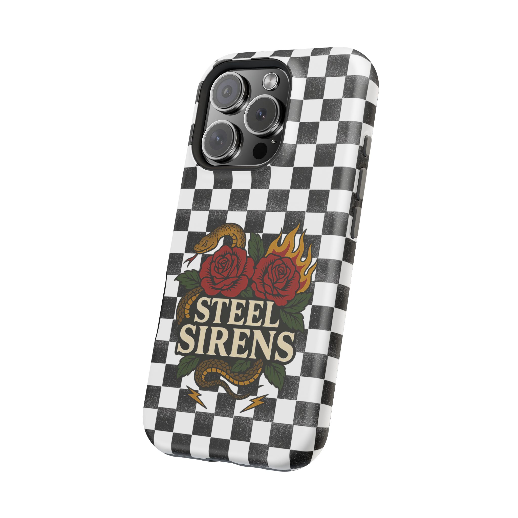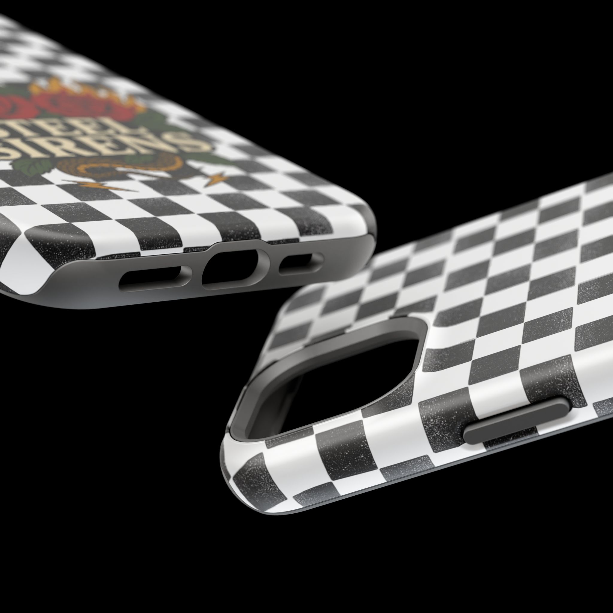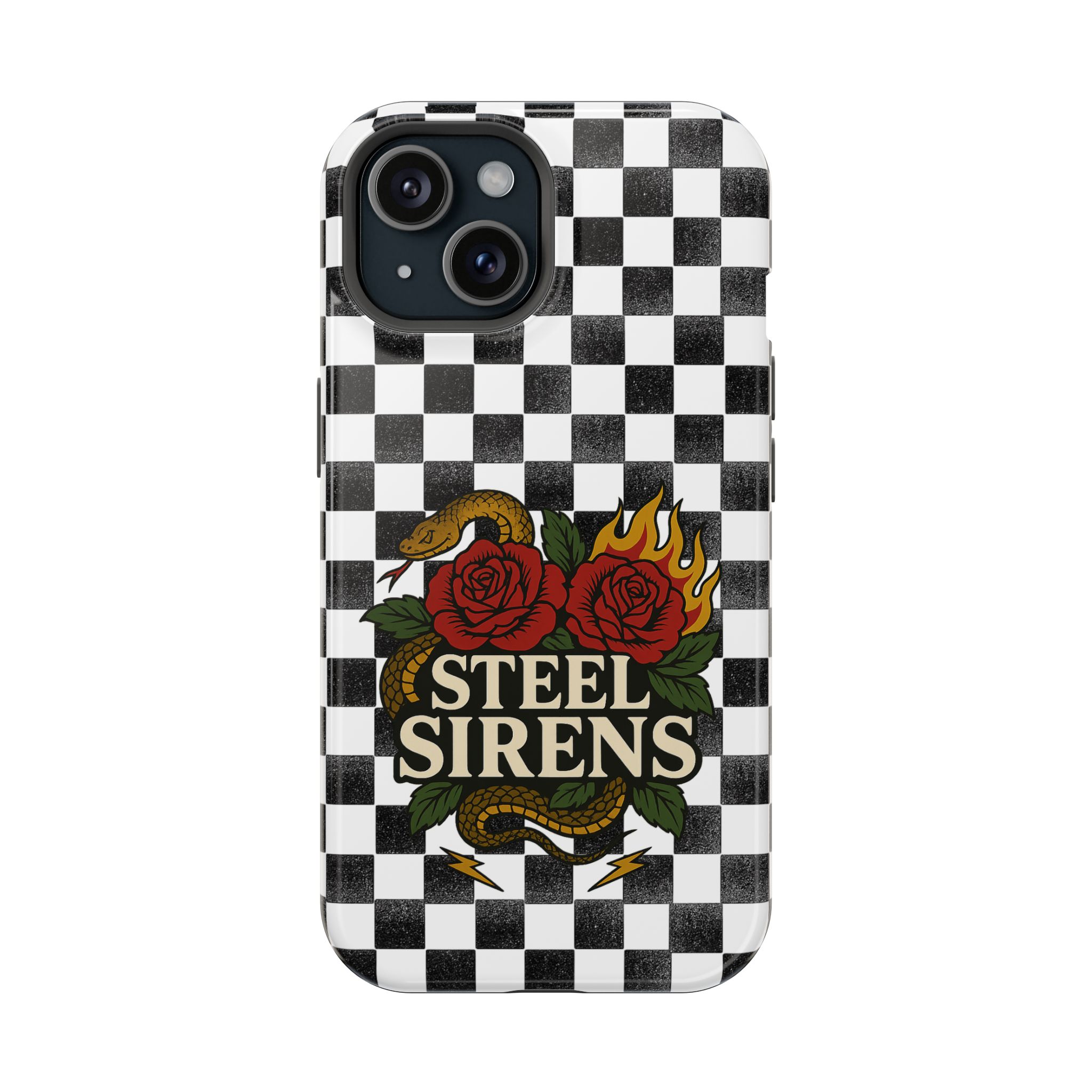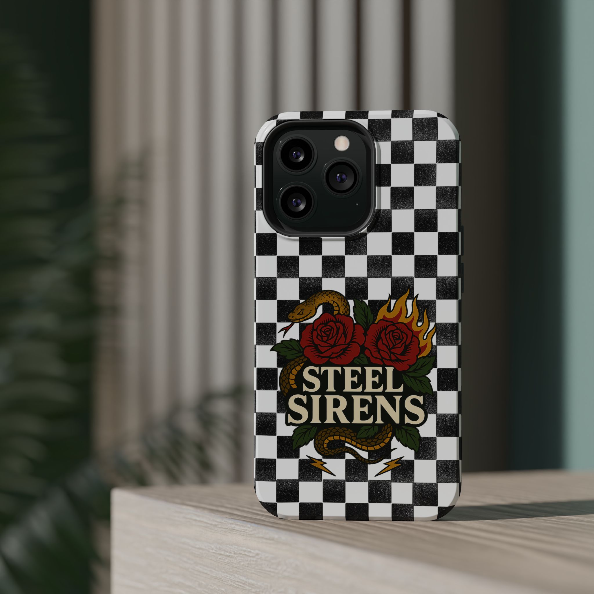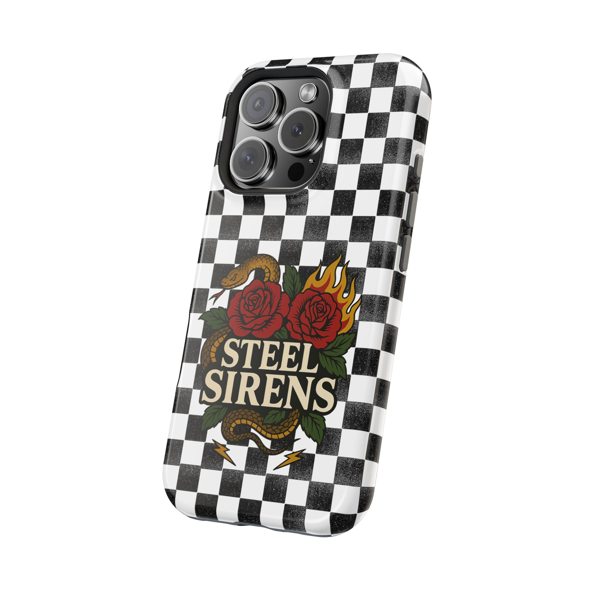 Protect your phone with attitude. The Checkered Flame Siren iPhone Case features Steel Sirens’ iconic logo set against a bold black-and-white checkerboard backdrop, finished with fiery details, roses, and a venomous edge. Built for riders, rebels, and anyone who refuses to blend in, this case doesn’t just guard your phone, it makes a statement.