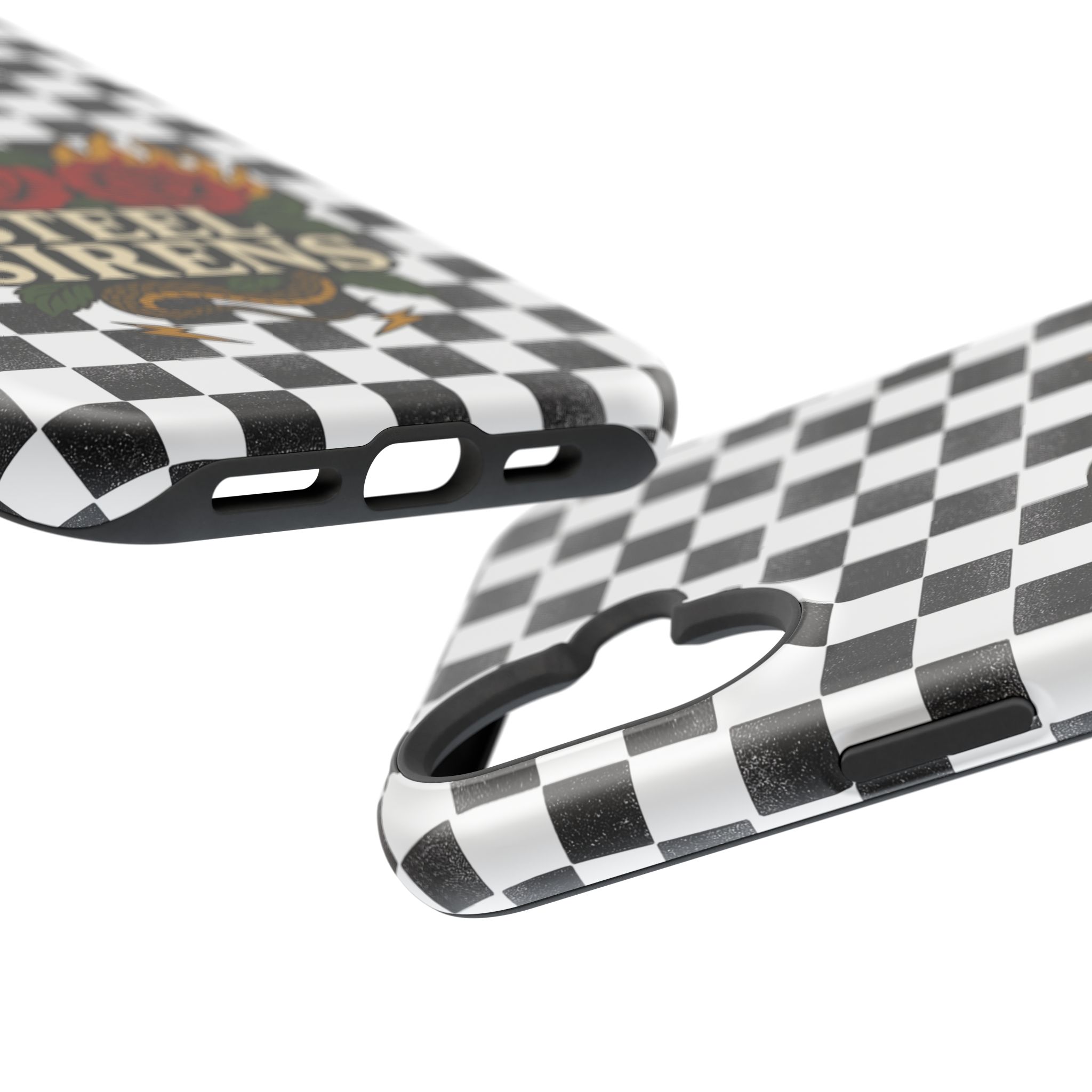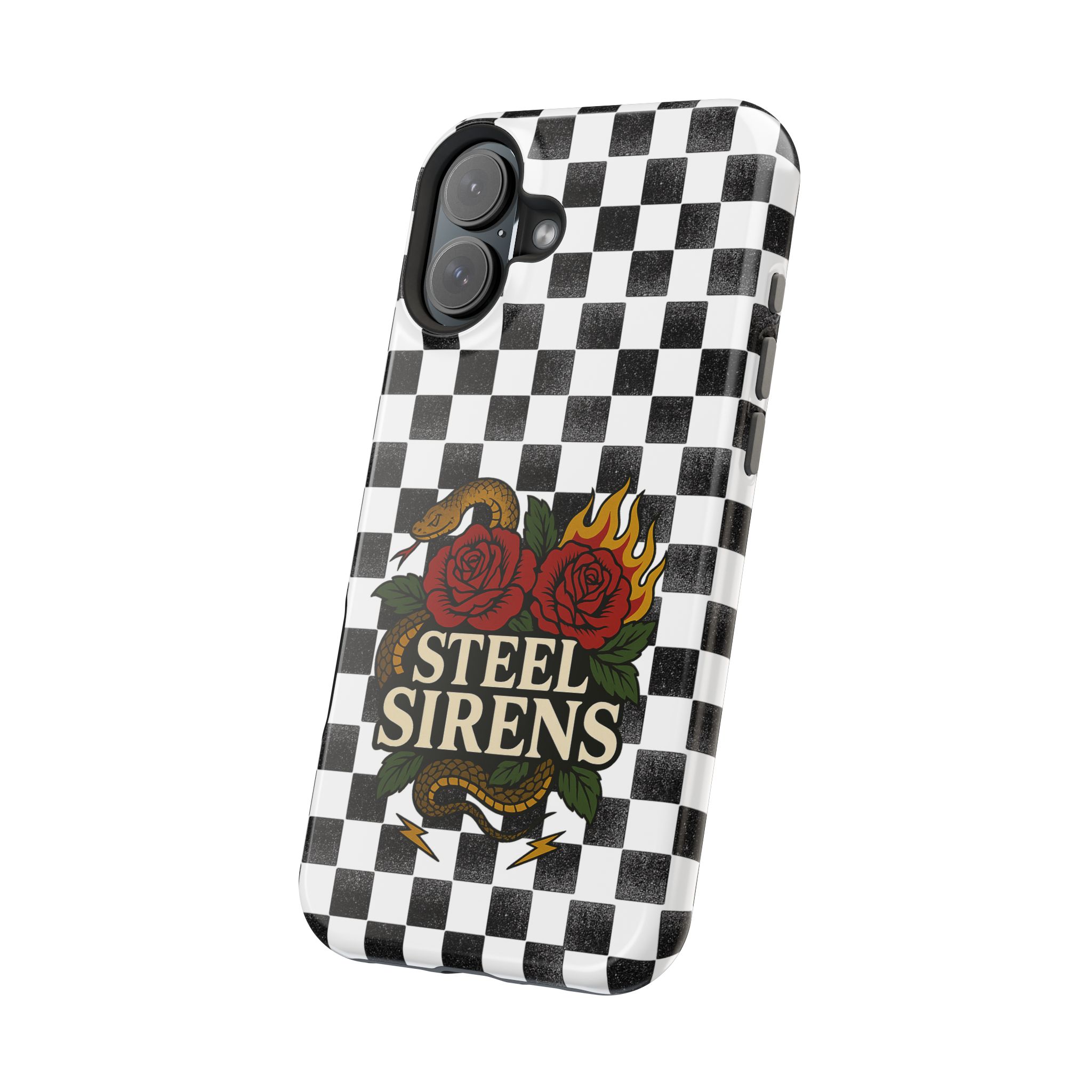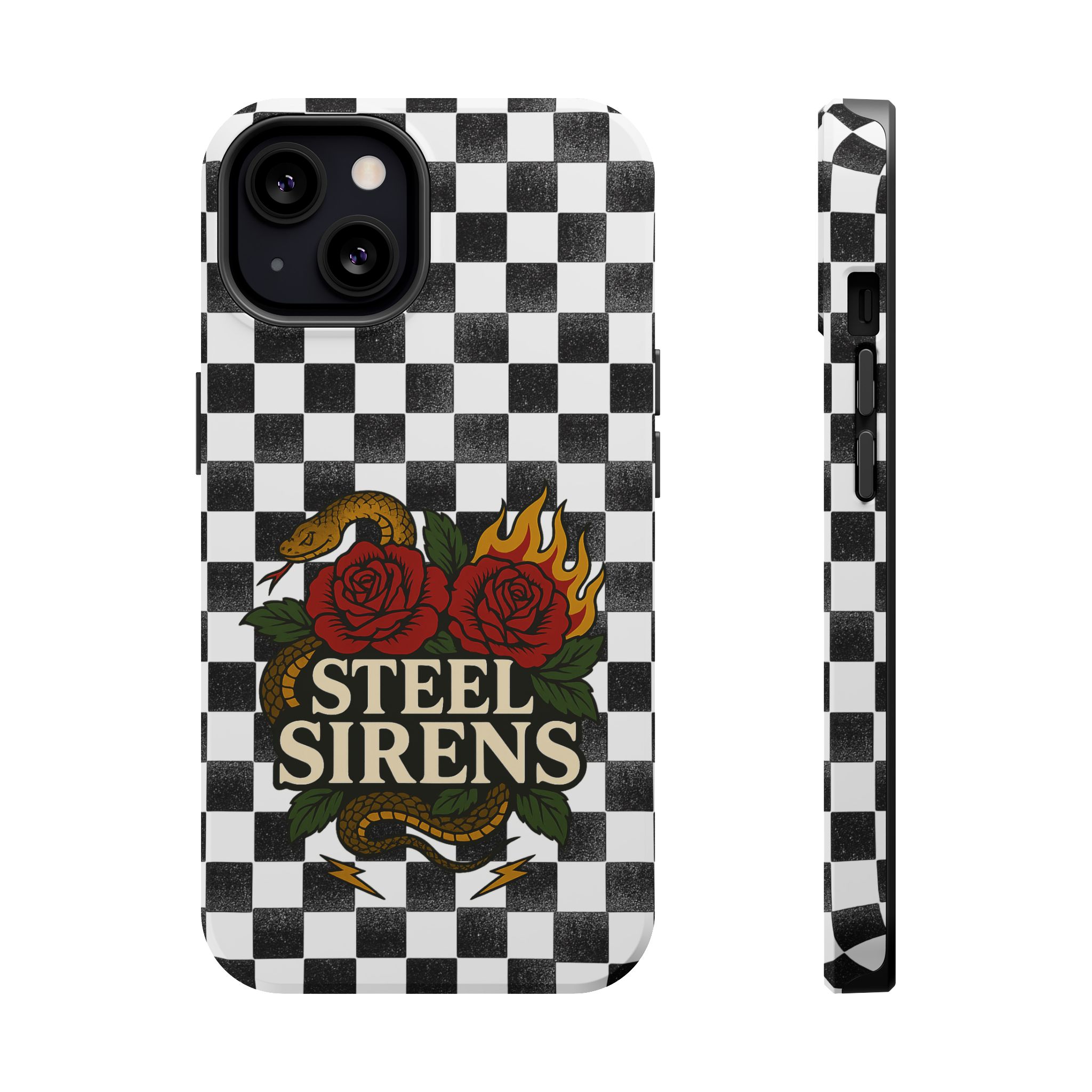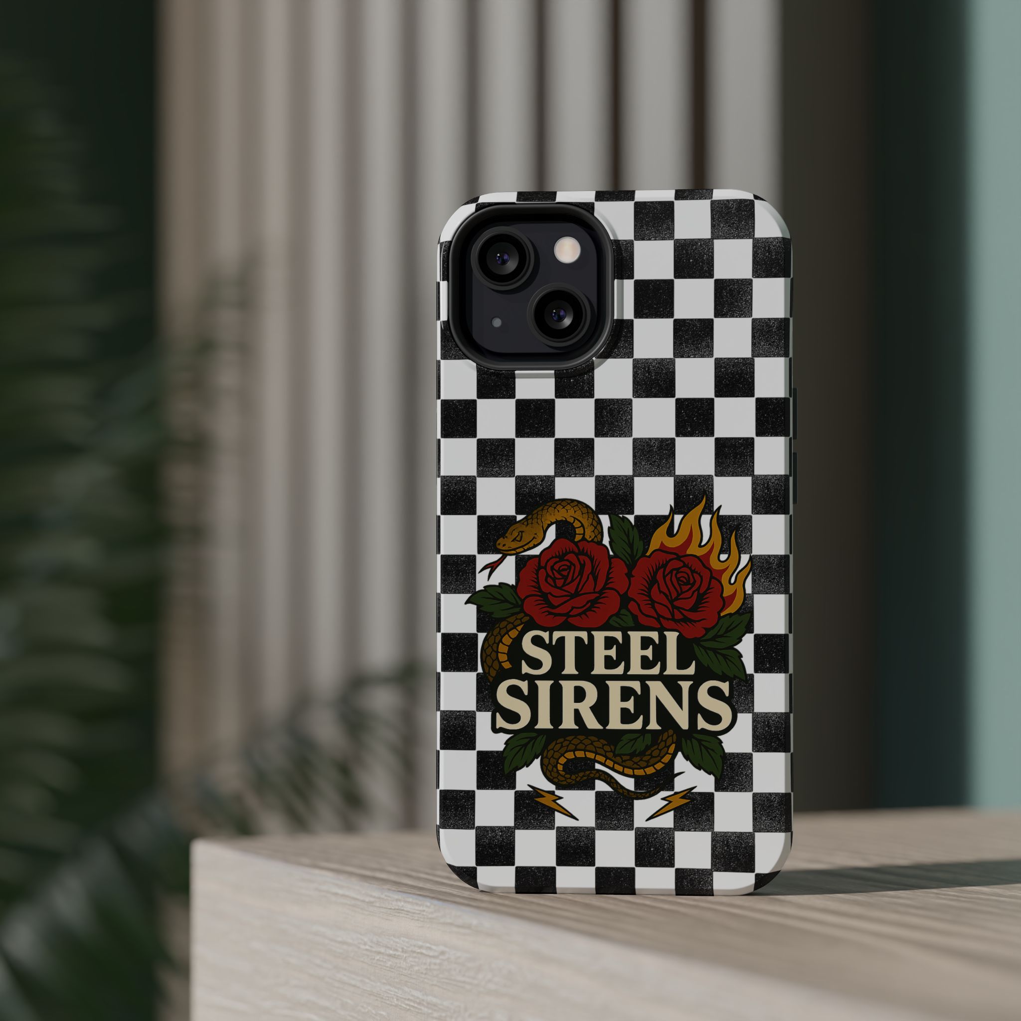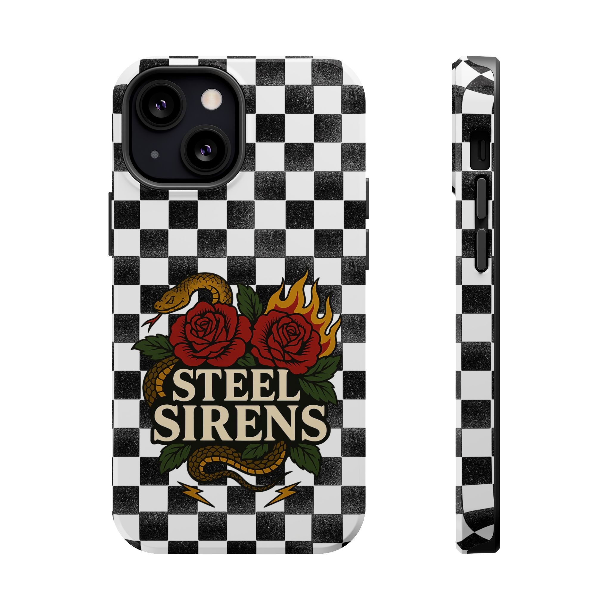 Protect your phone with attitude. The Checkered Flame Siren iPhone Case features Steel Sirens’ iconic logo set against a bold black-and-white checkerboard backdrop, finished with fiery details, roses, and a venomous edge. Built for riders, rebels, and anyone who refuses to blend in, this case doesn’t just guard your phone, it makes a statement.