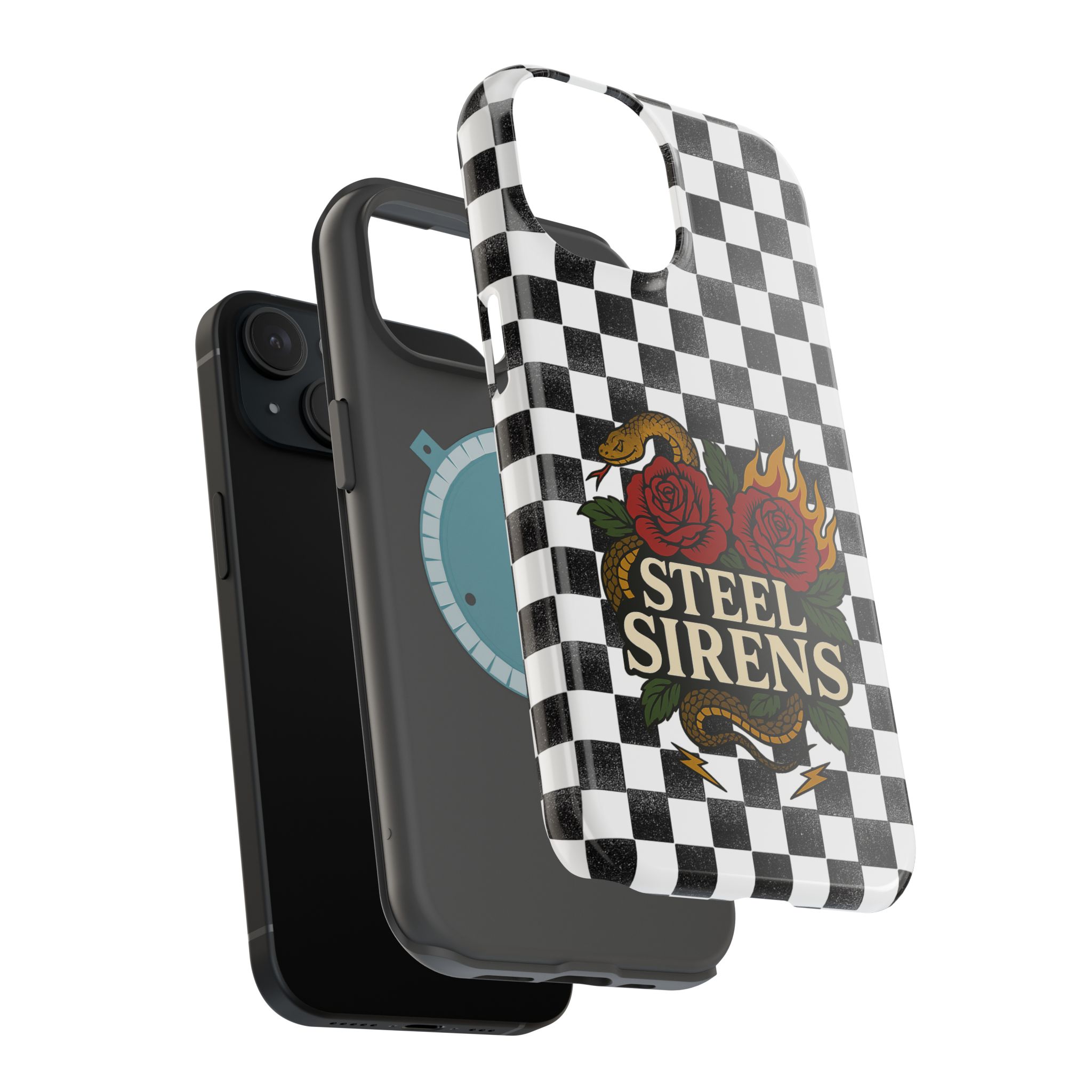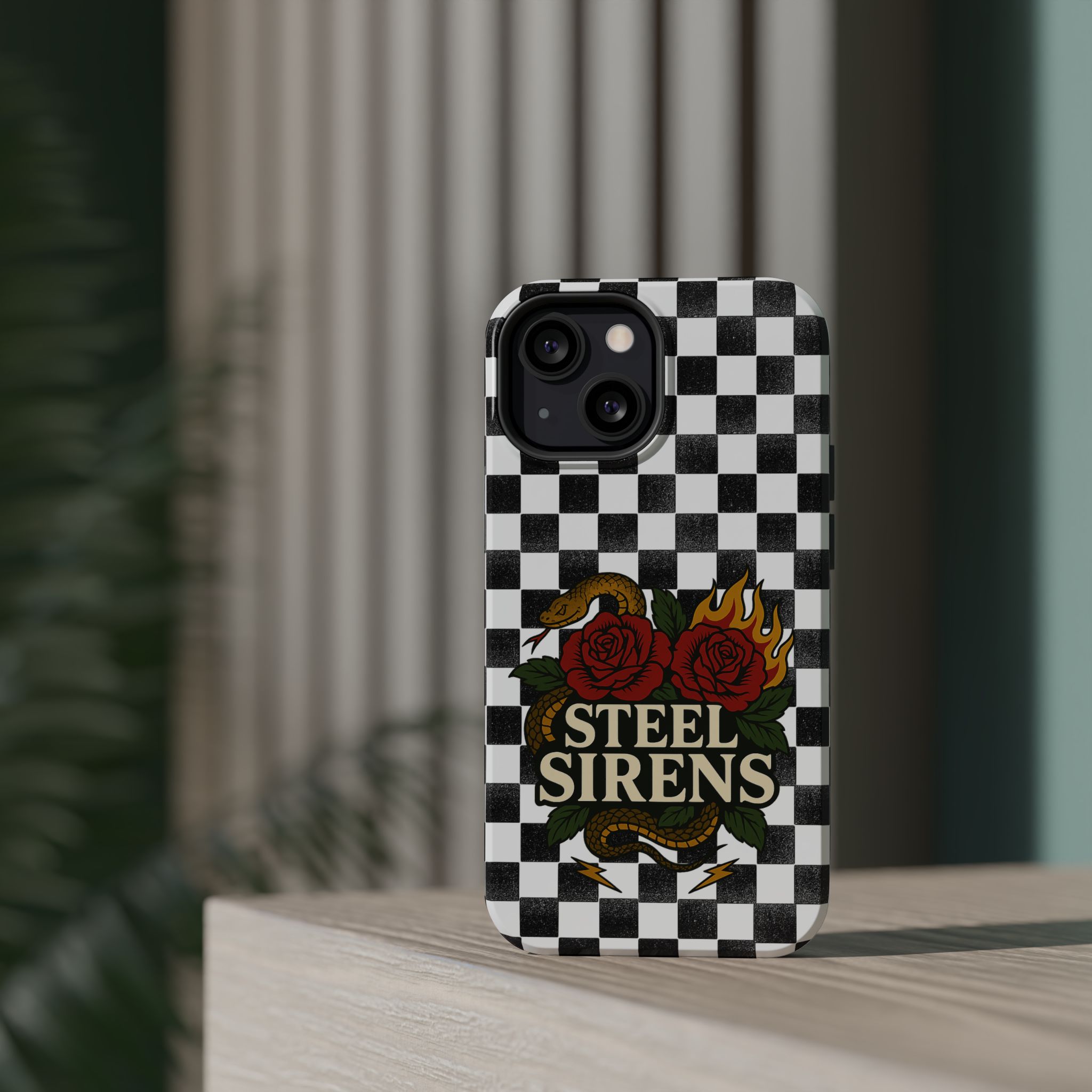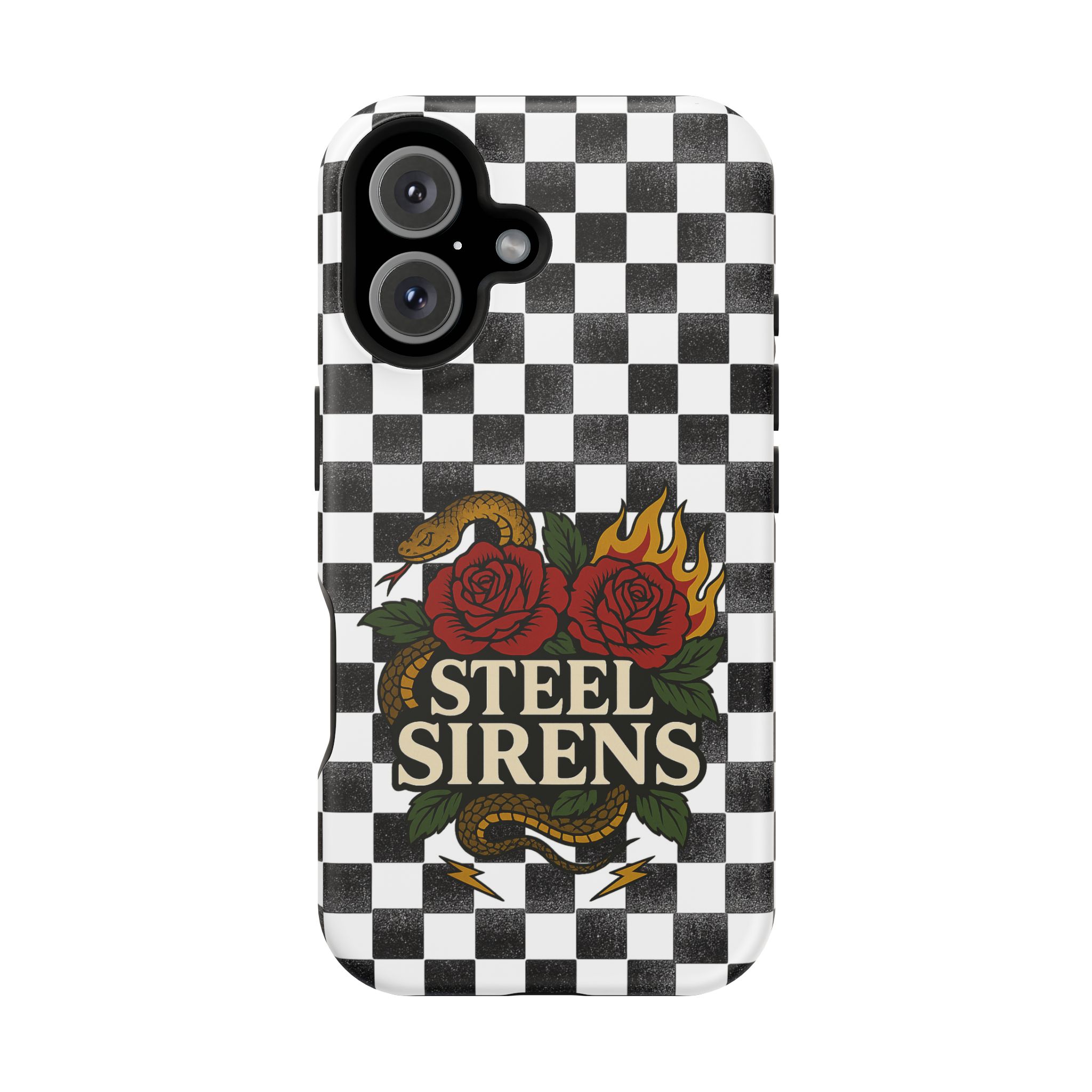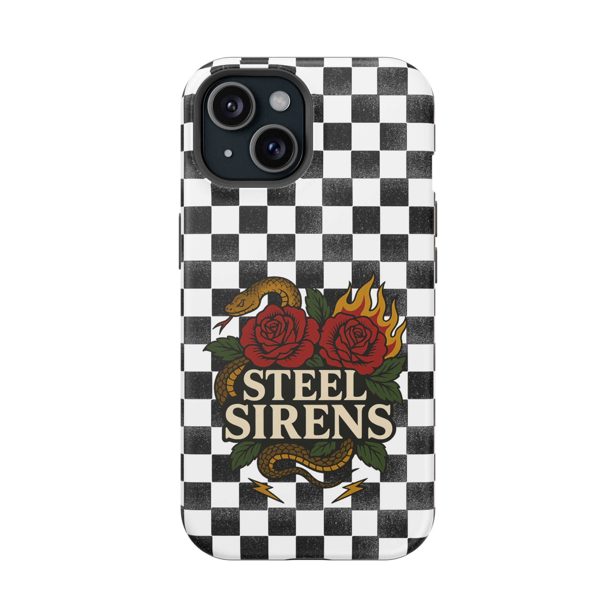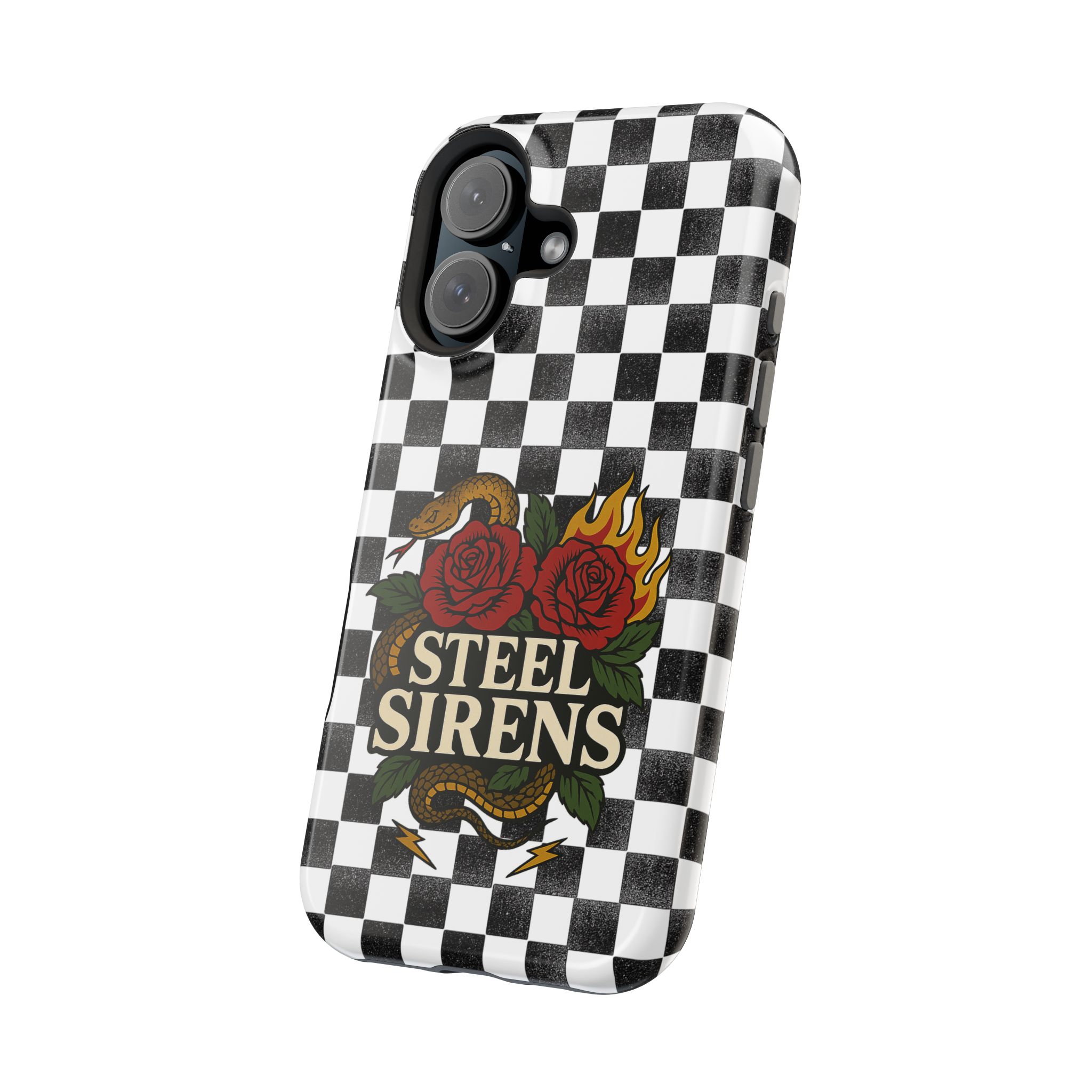 Protect your phone with attitude. The Checkered Flame Siren iPhone Case features Steel Sirens’ iconic logo set against a bold black-and-white checkerboard backdrop, finished with fiery details, roses, and a venomous edge. Built for riders, rebels, and anyone who refuses to blend in, this case doesn’t just guard your phone, it makes a statement.