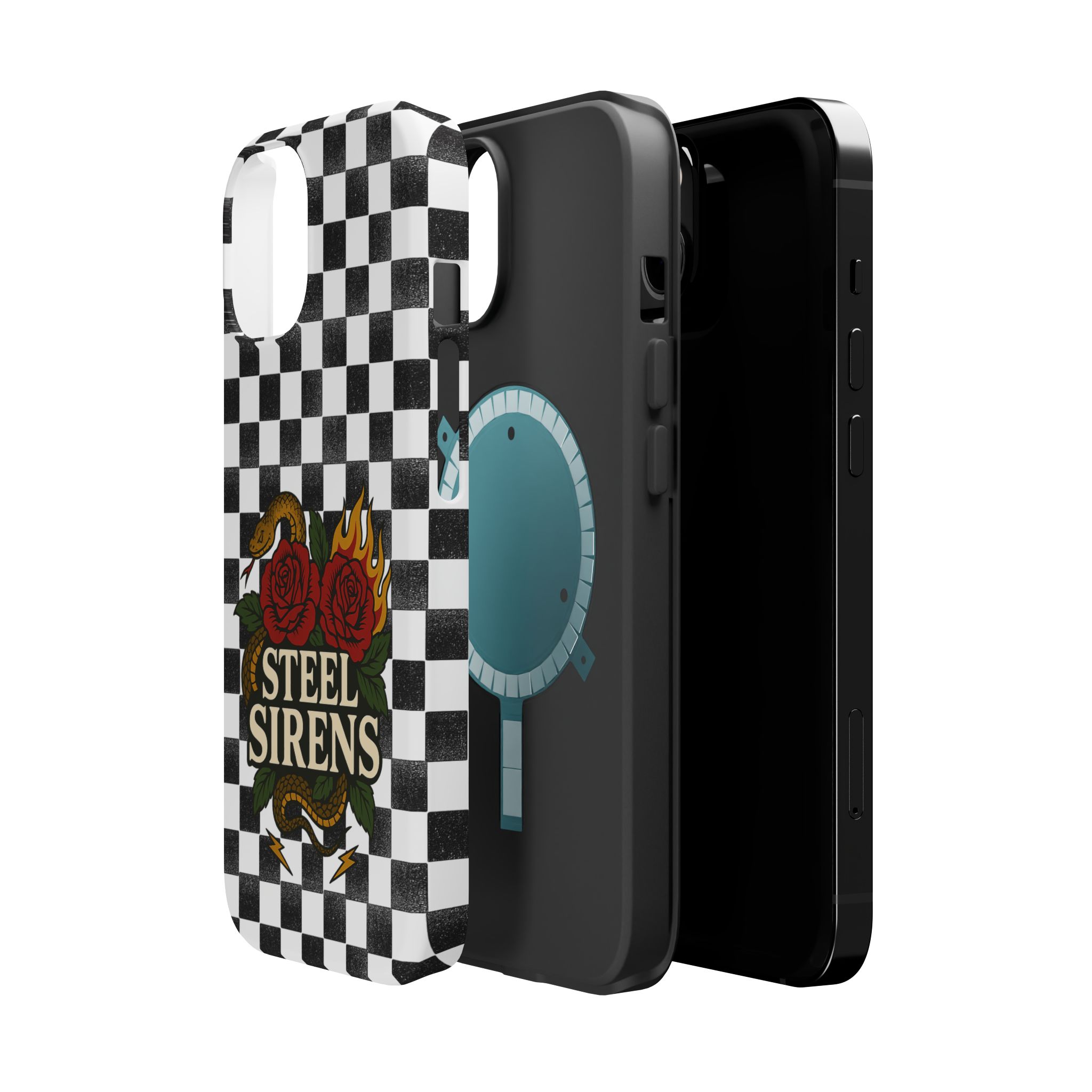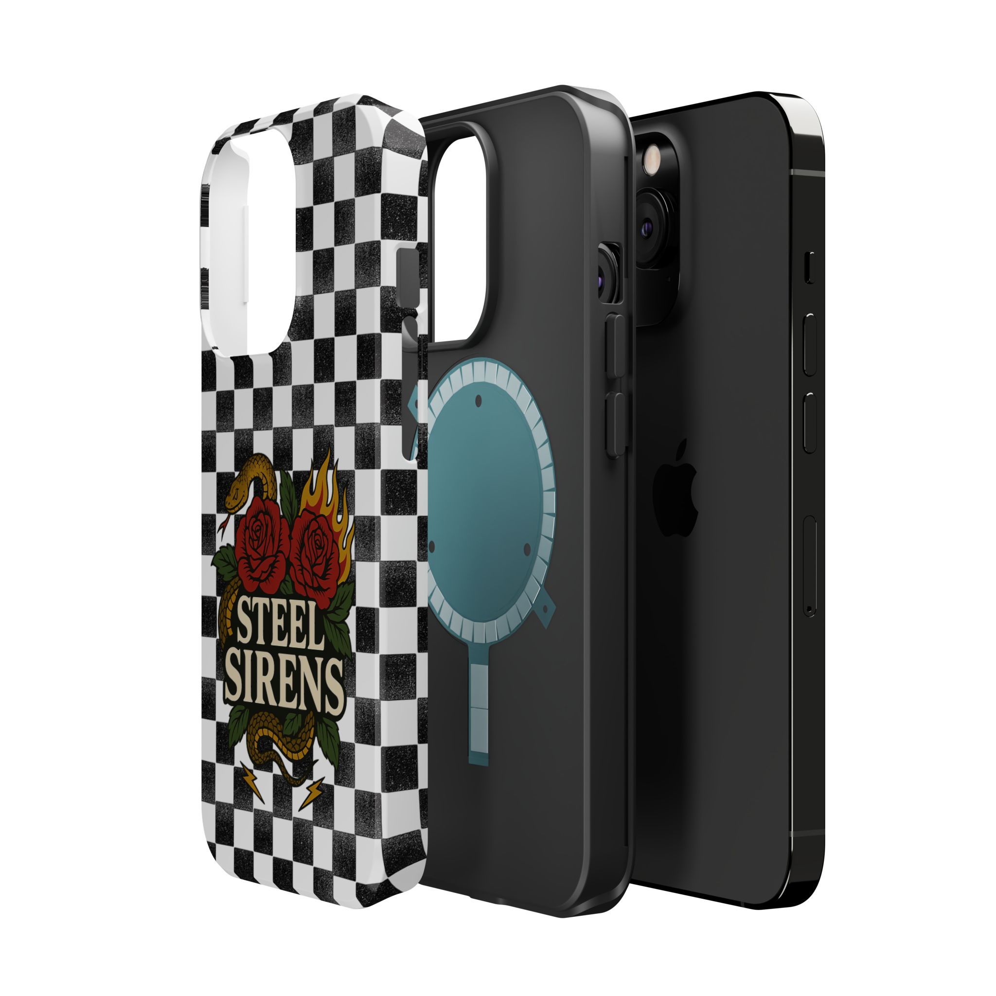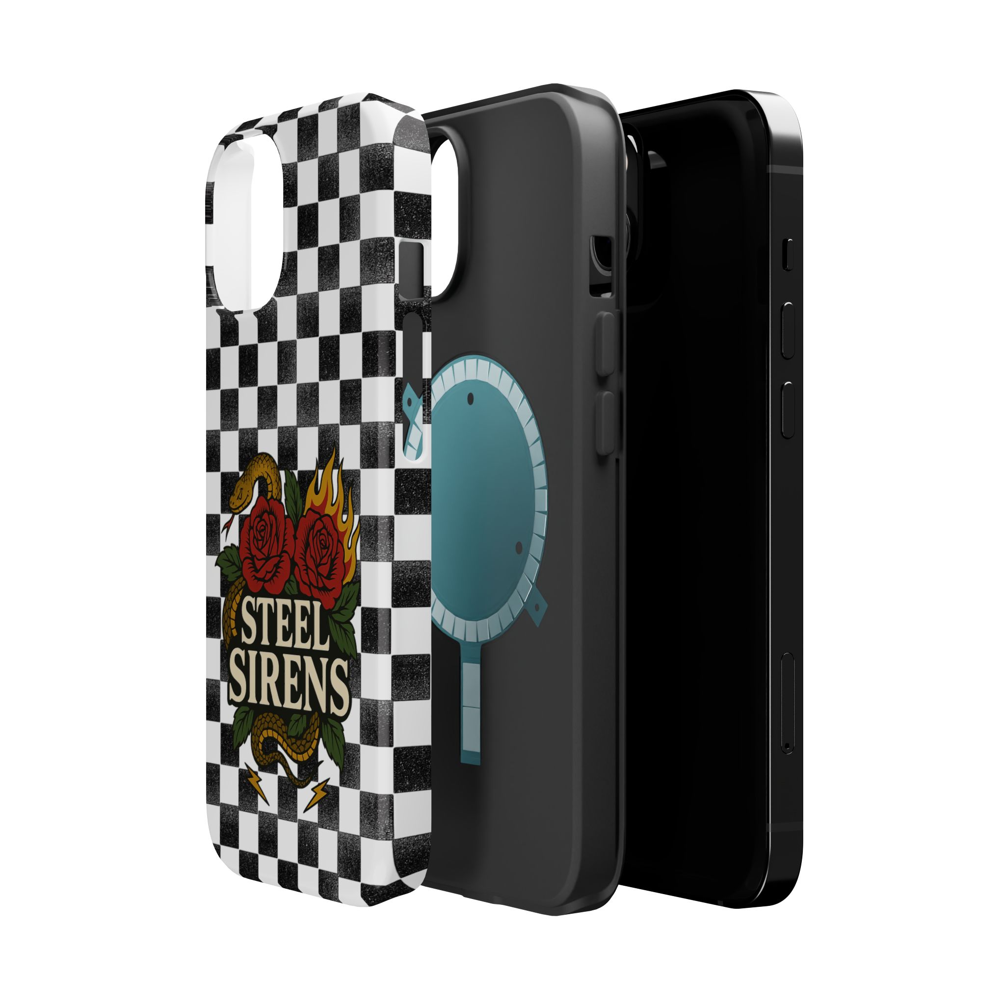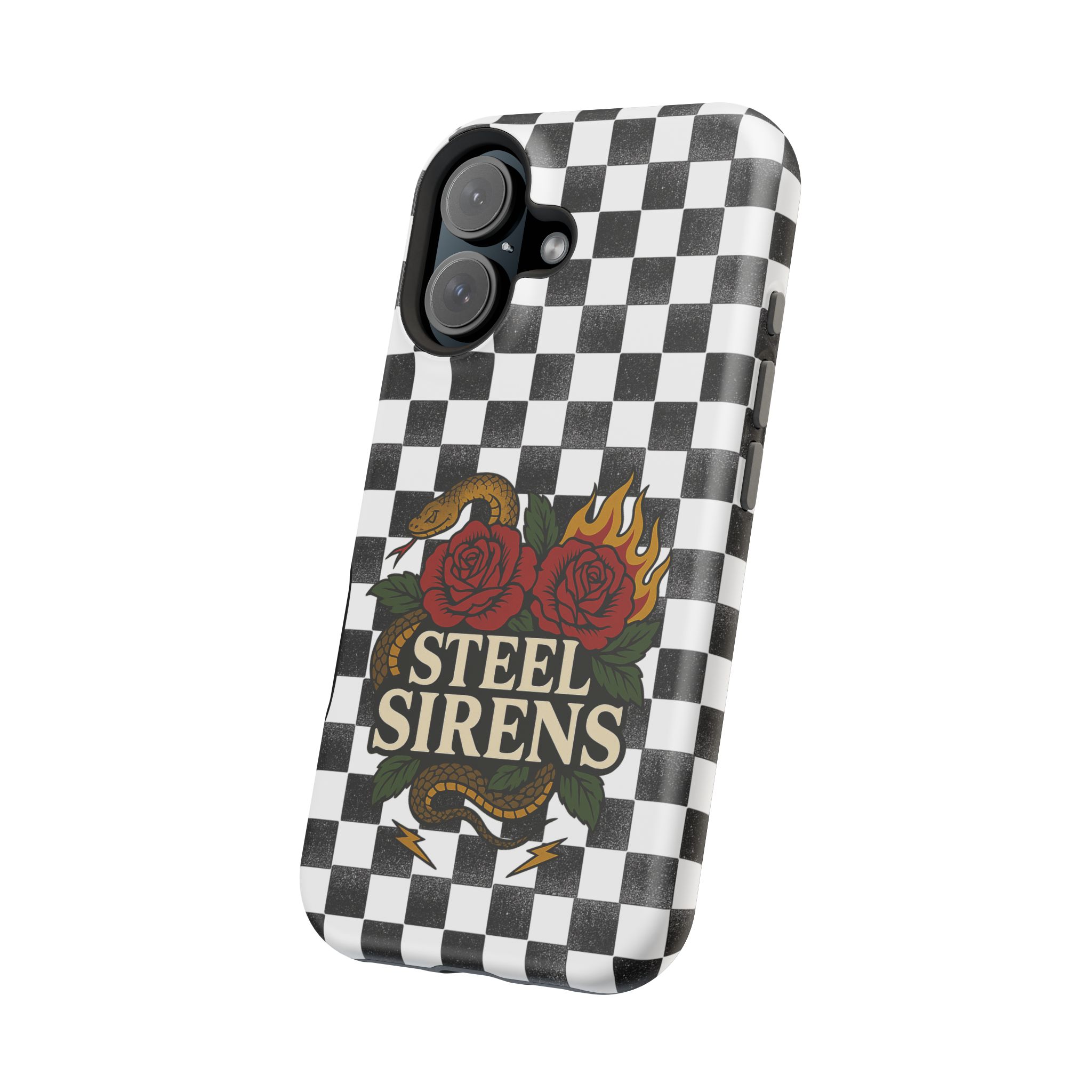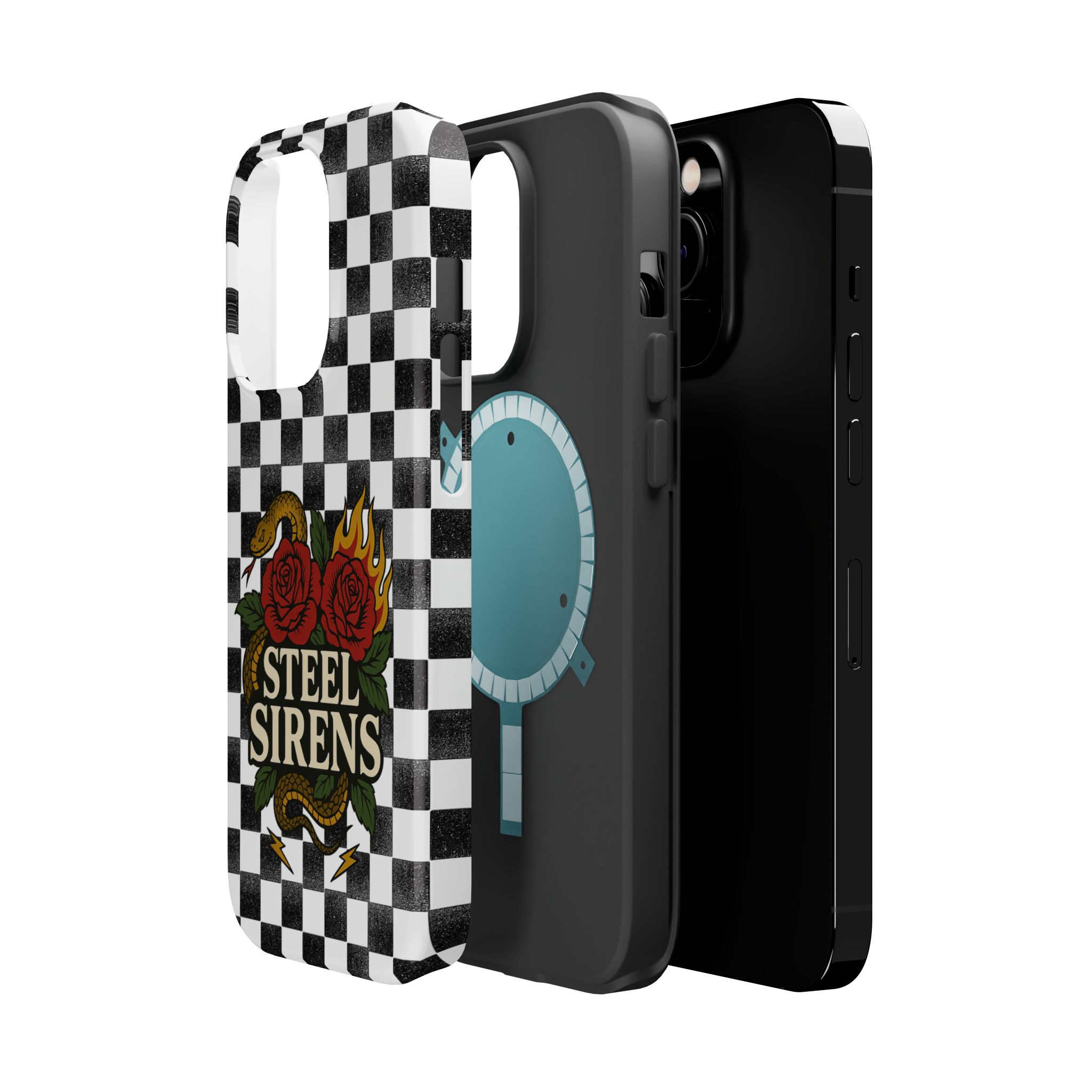 Protect your phone with attitude. The Checkered Flame Siren iPhone Case features Steel Sirens’ iconic logo set against a bold black-and-white checkerboard backdrop, finished with fiery details, roses, and a venomous edge. Built for riders, rebels, and anyone who refuses to blend in, this case doesn’t just guard your phone, it makes a statement.