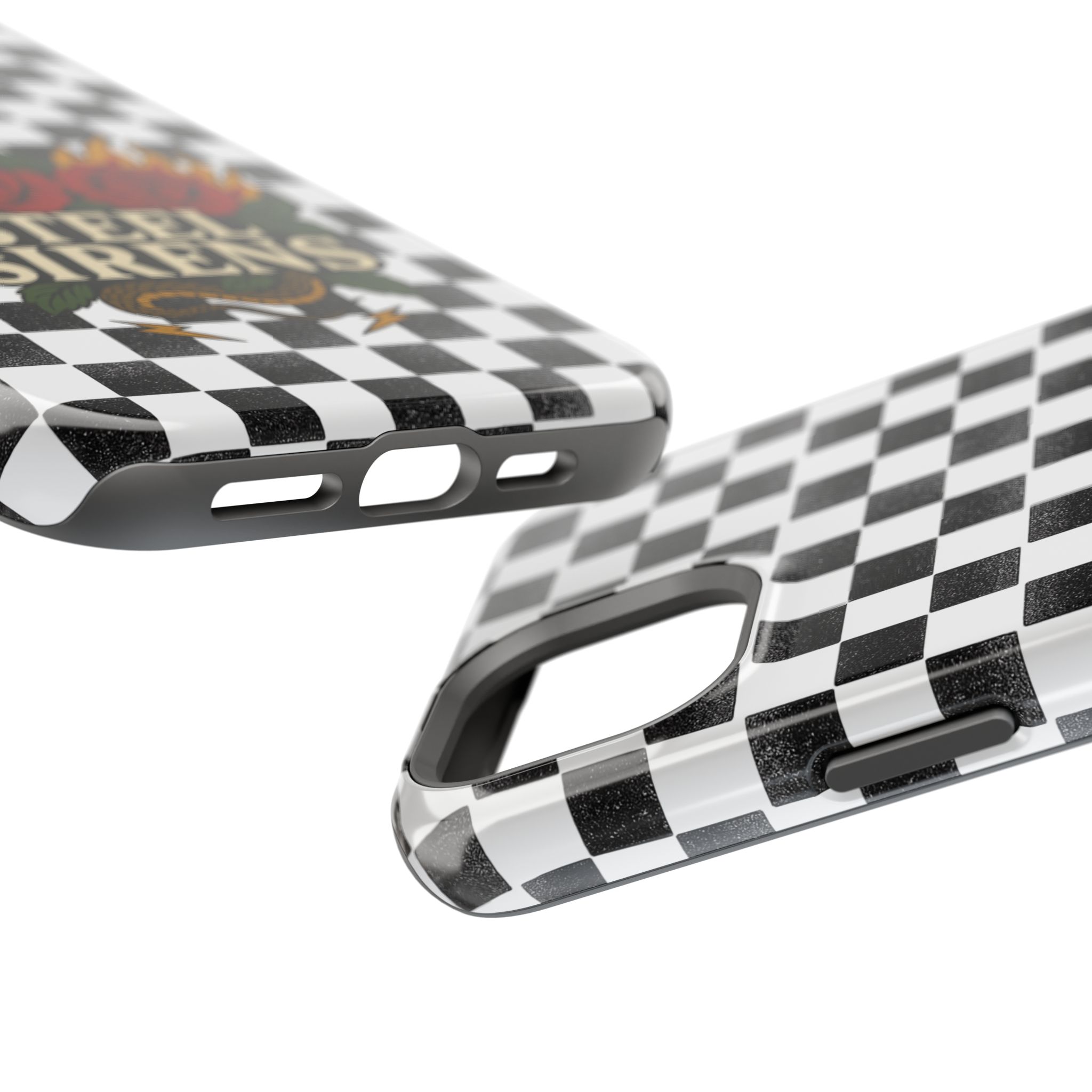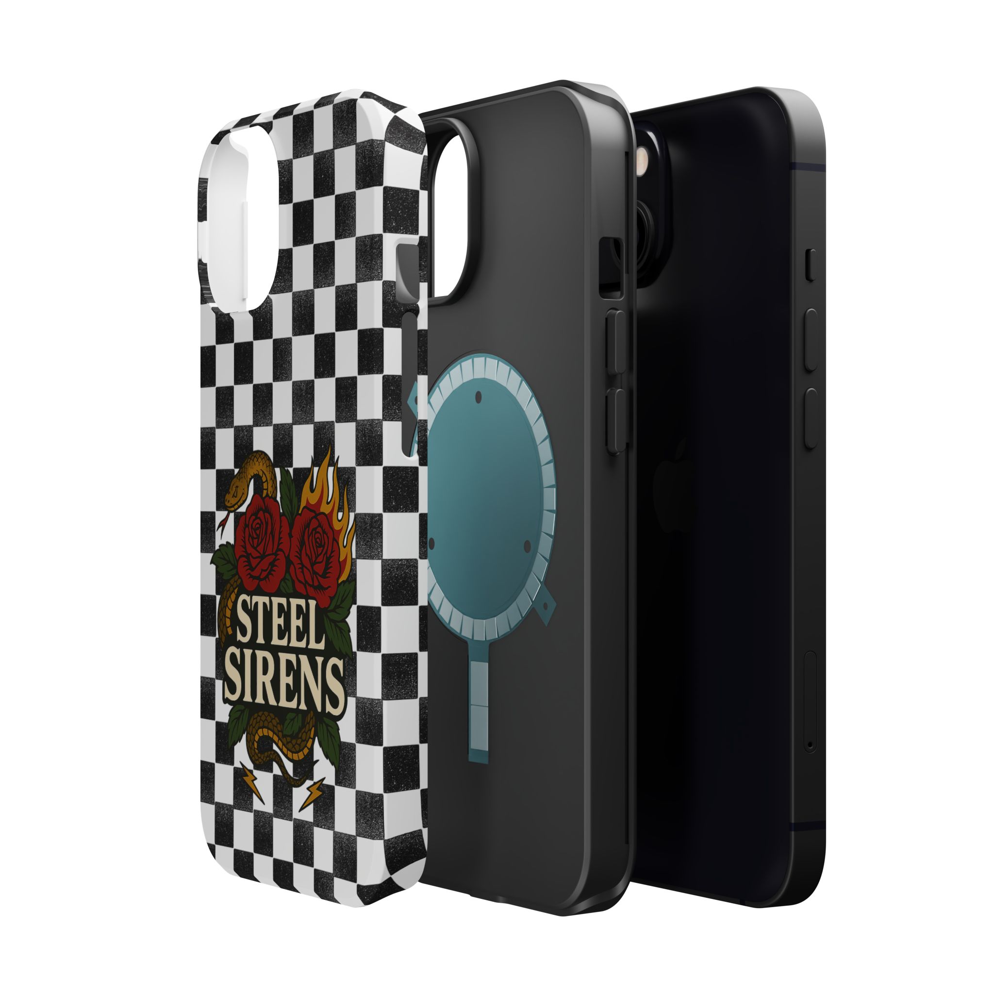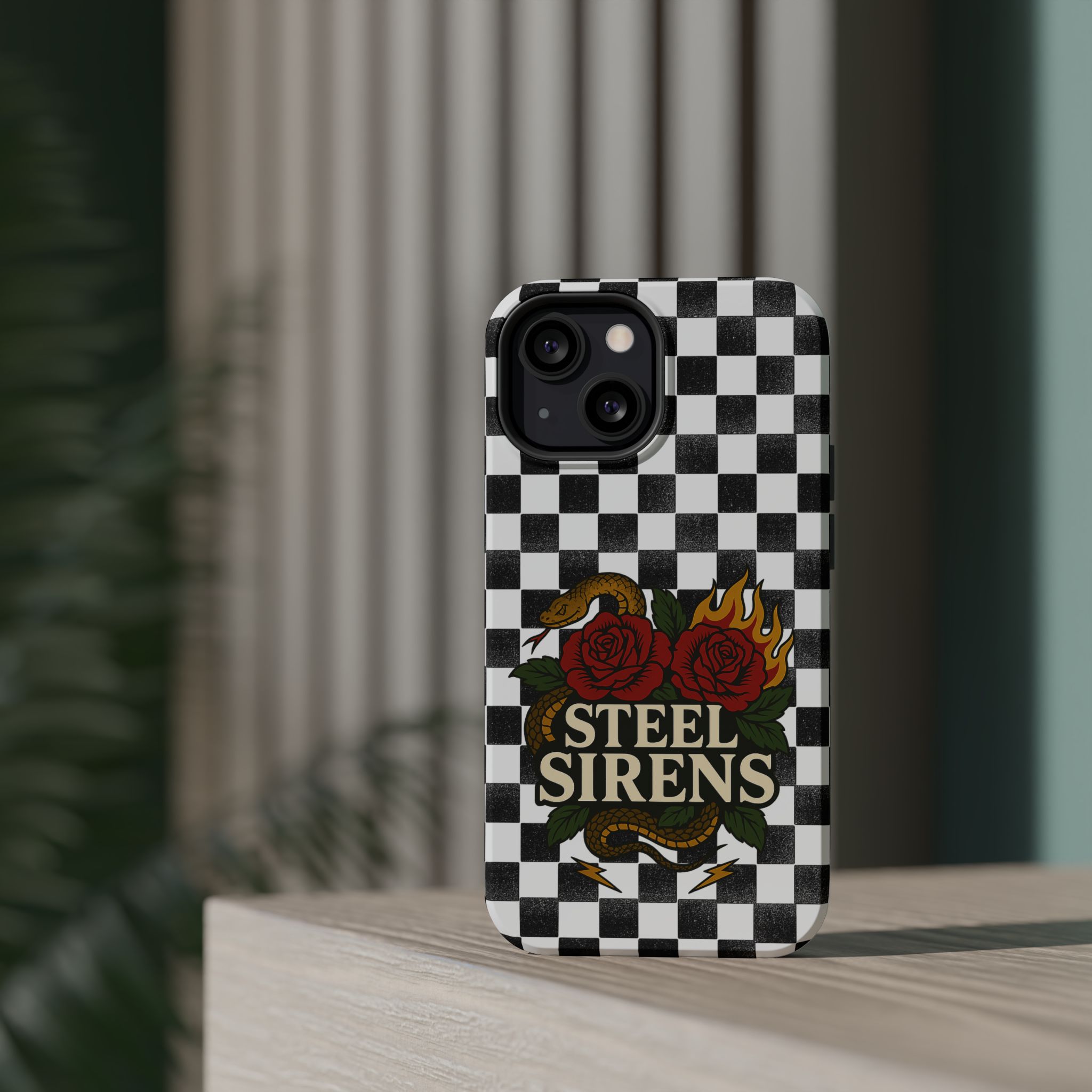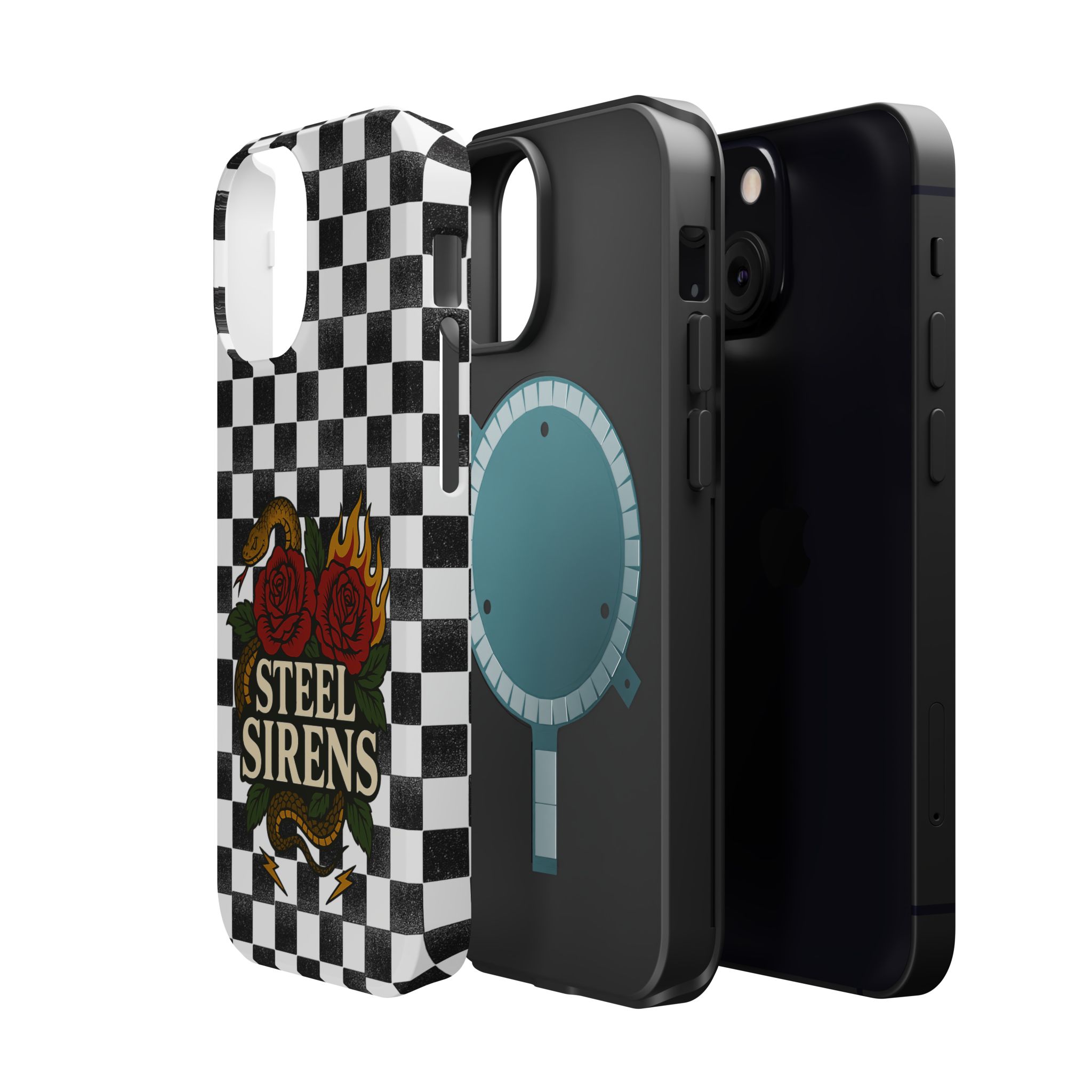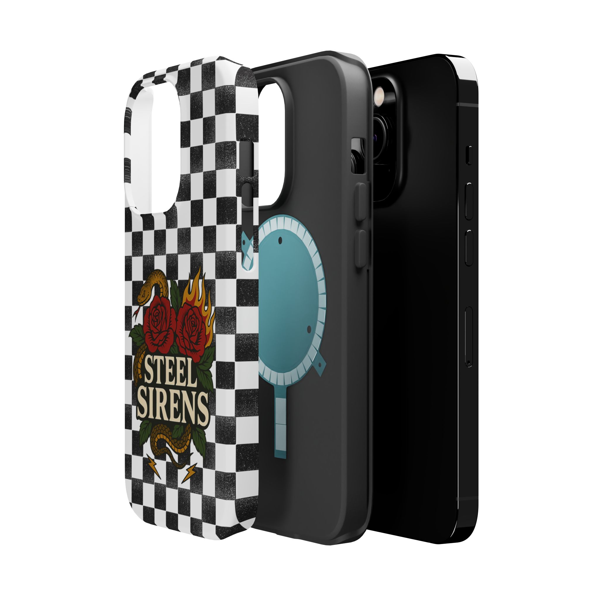 Protect your phone with attitude. The Checkered Flame Siren iPhone Case features Steel Sirens’ iconic logo set against a bold black-and-white checkerboard backdrop, finished with fiery details, roses, and a venomous edge. Built for riders, rebels, and anyone who refuses to blend in, this case doesn’t just guard your phone, it makes a statement.