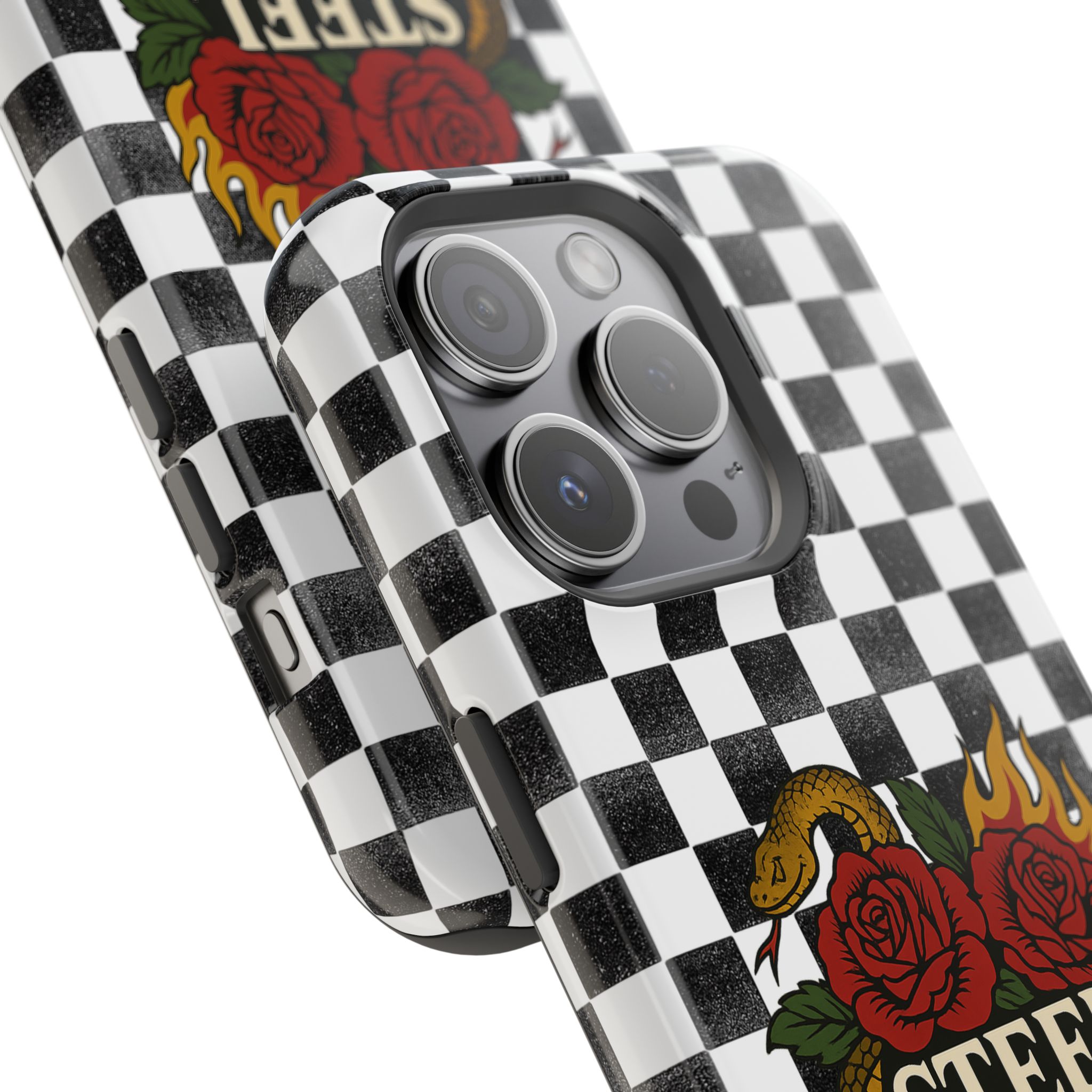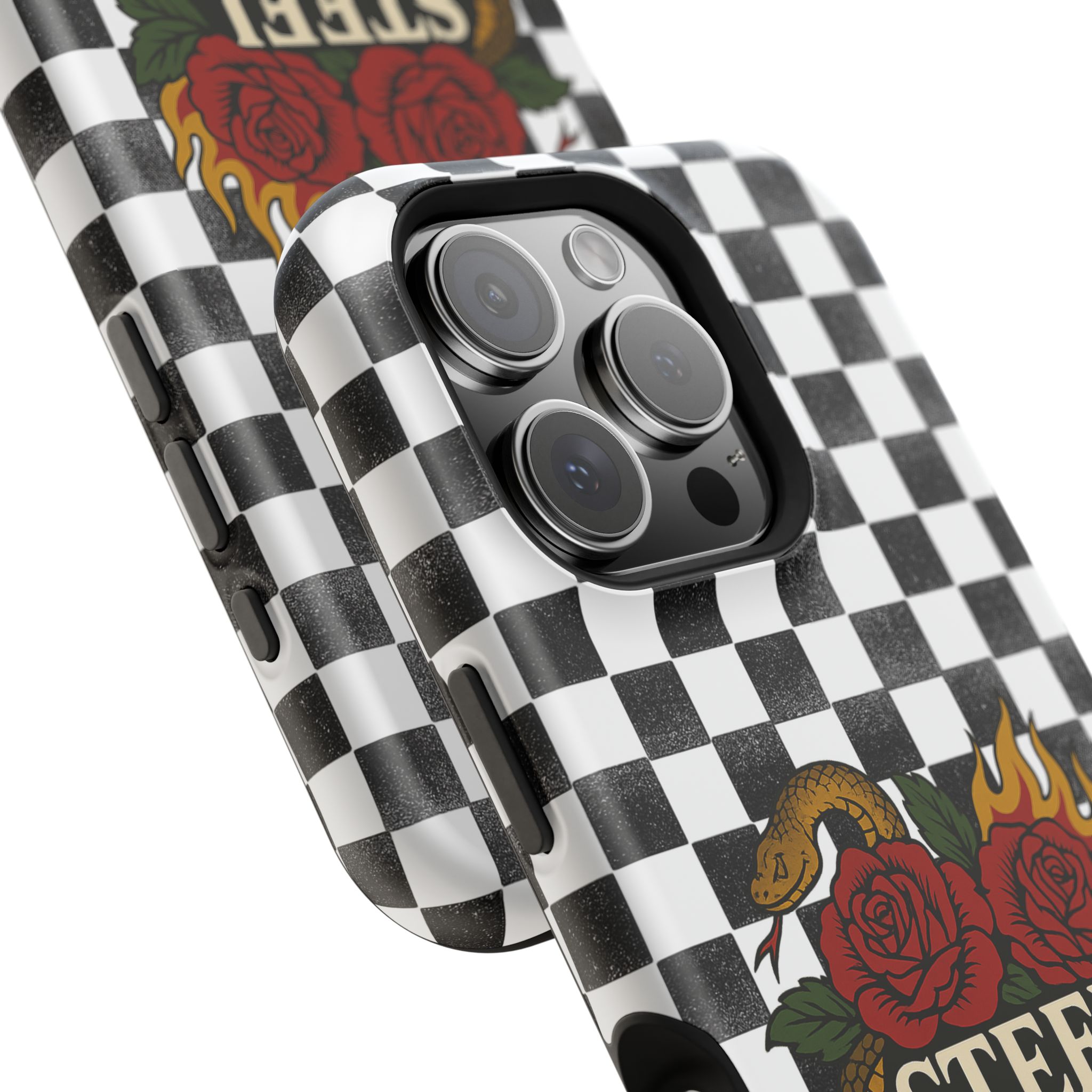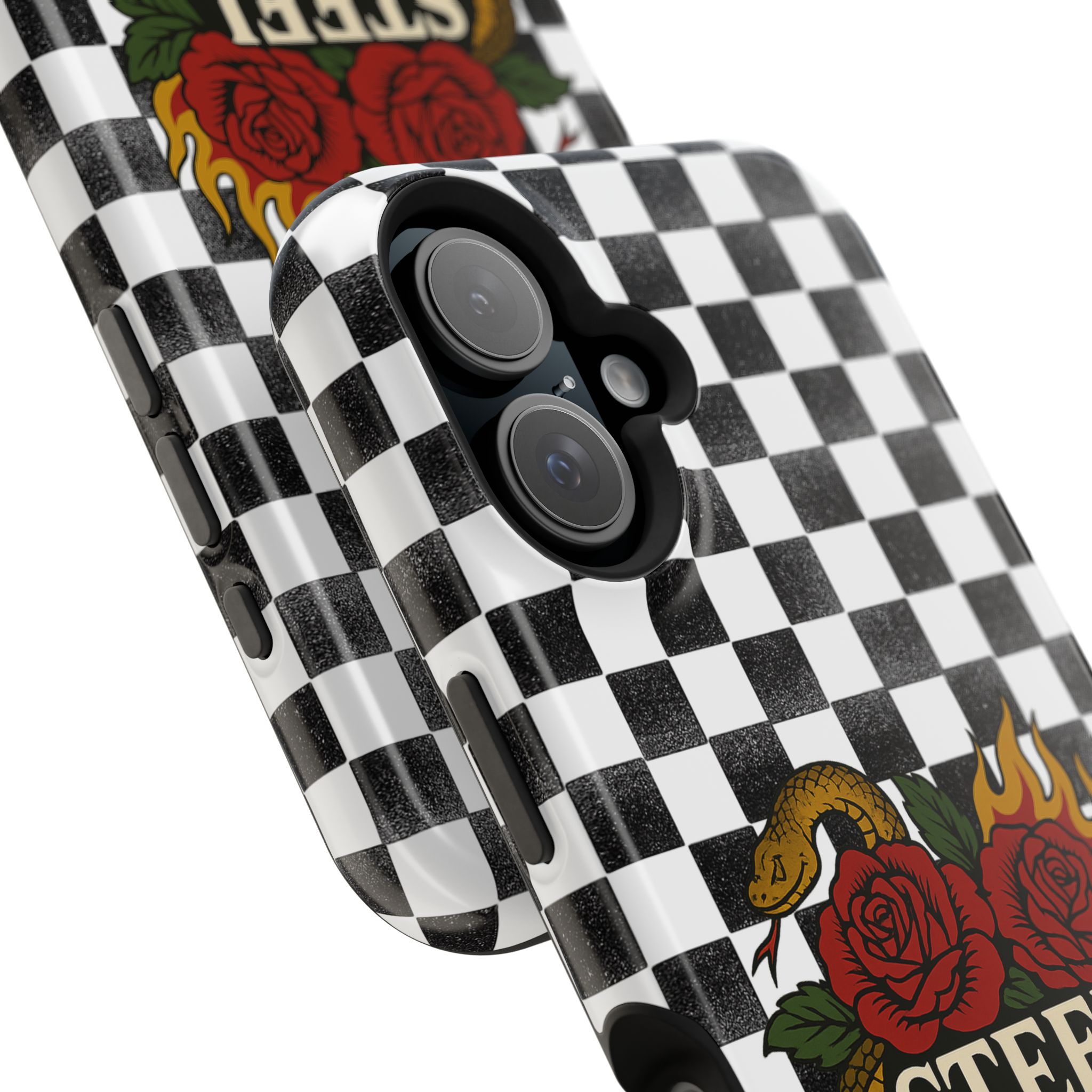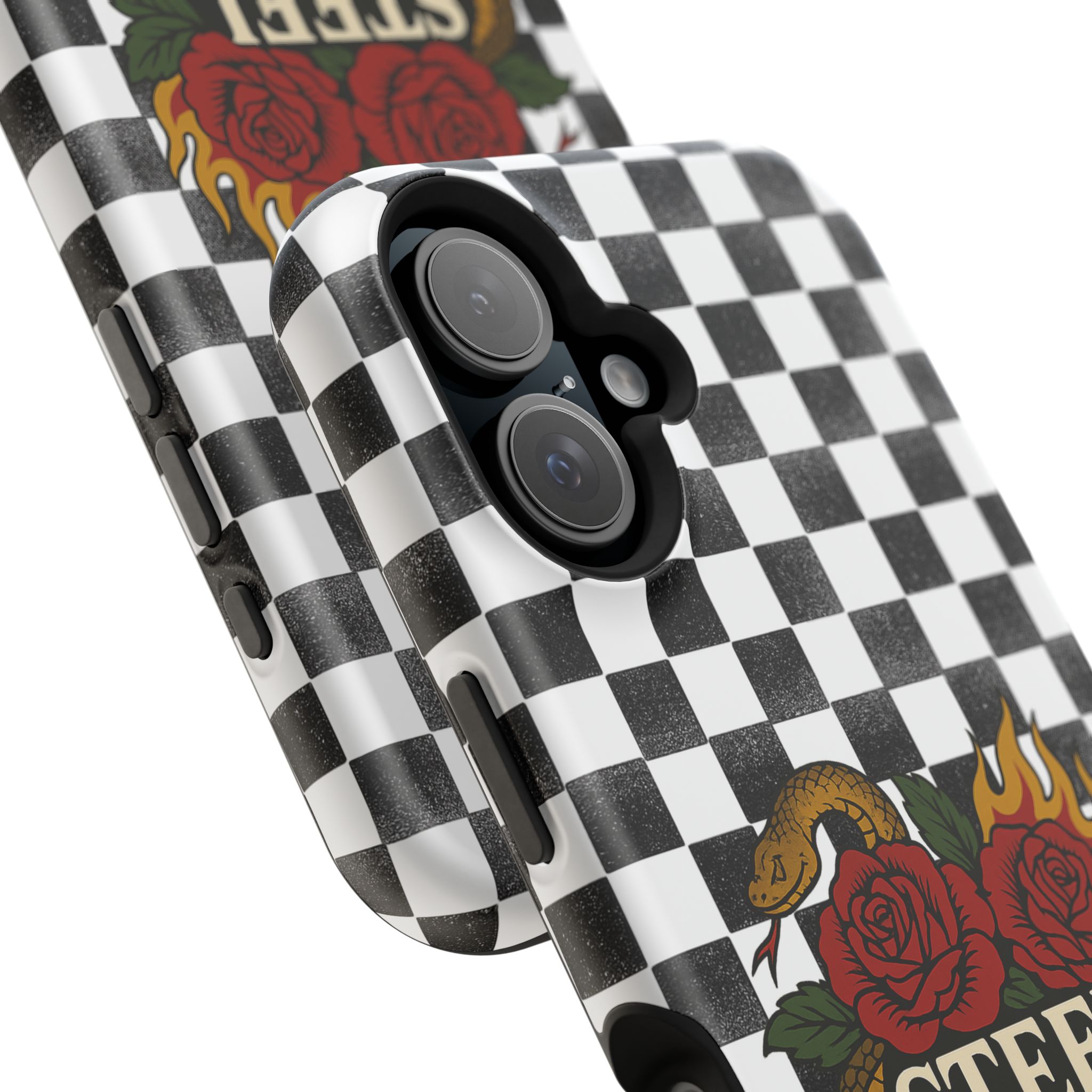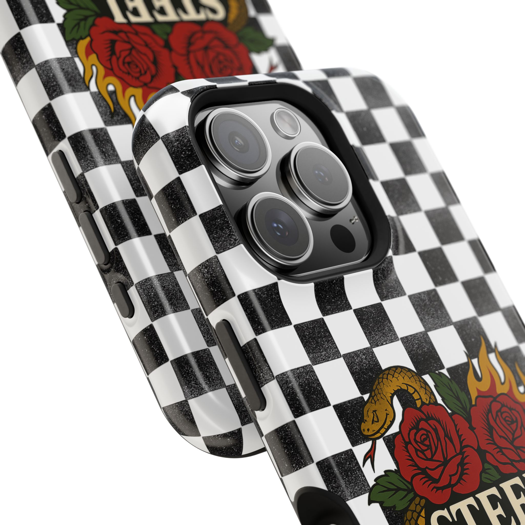 Protect your phone with attitude. The Rose Flame Phone Case features Steel Sirens’ iconic logo set against a bold black-and-white checkerboard backdrop, finished with fiery details, roses, and a venomous edge. Built for riders, rebels, and anyone who refuses to blend in, this case doesn’t just guard your phone, it makes a statement.