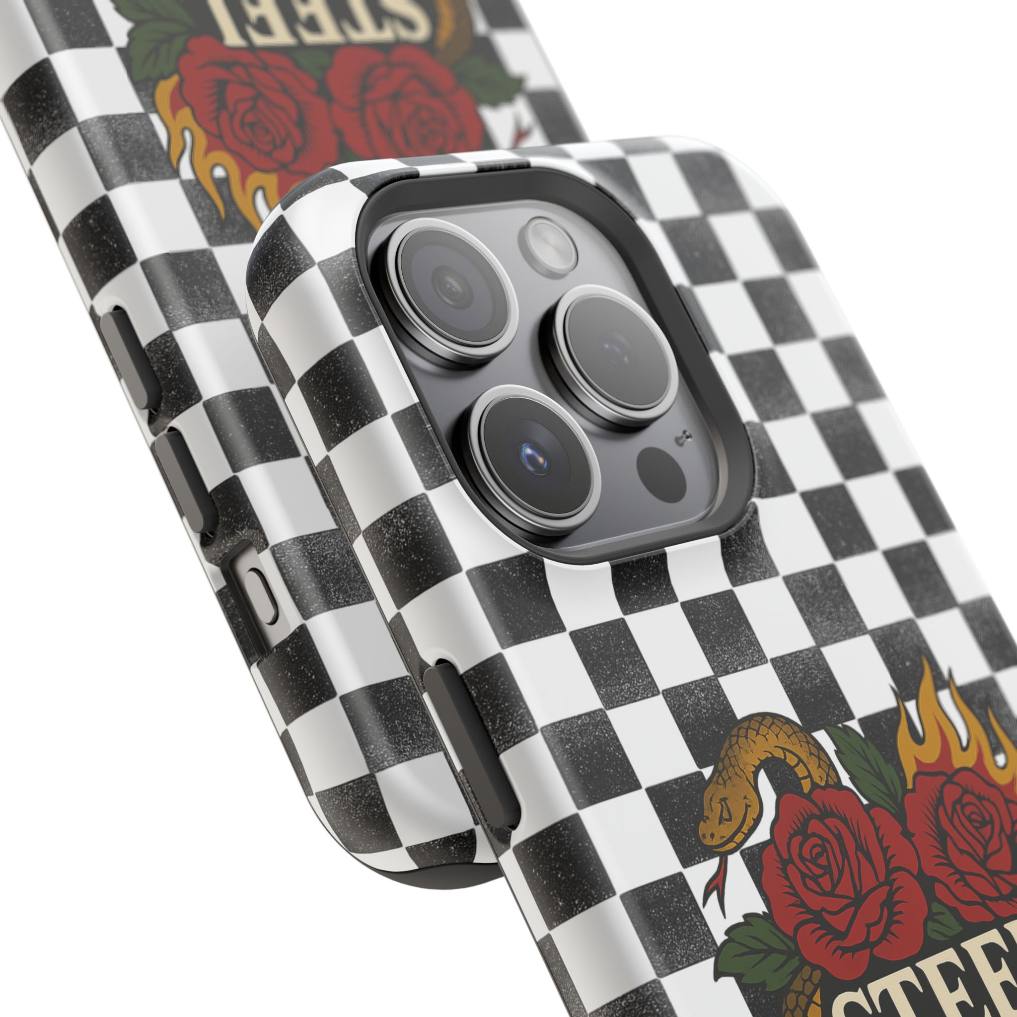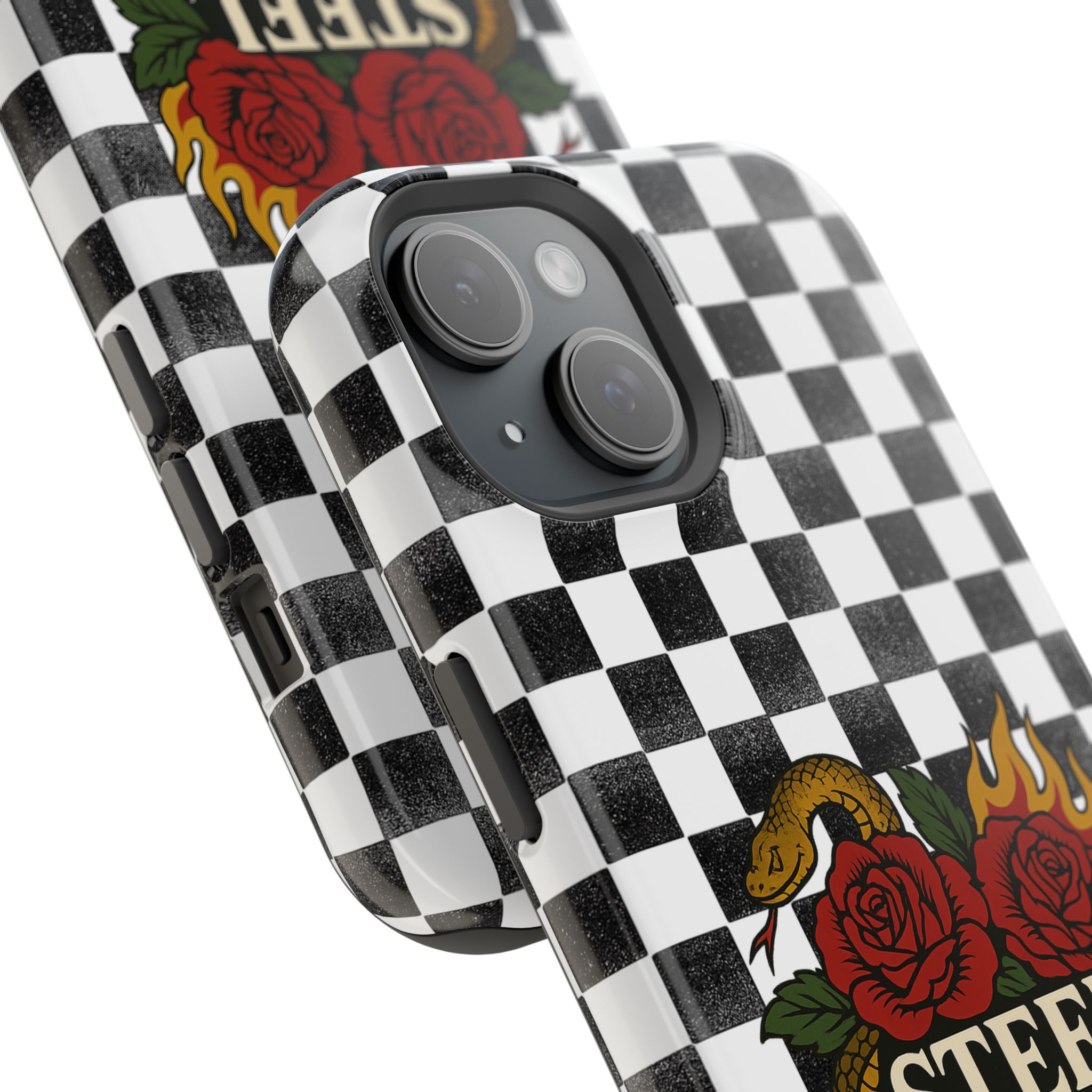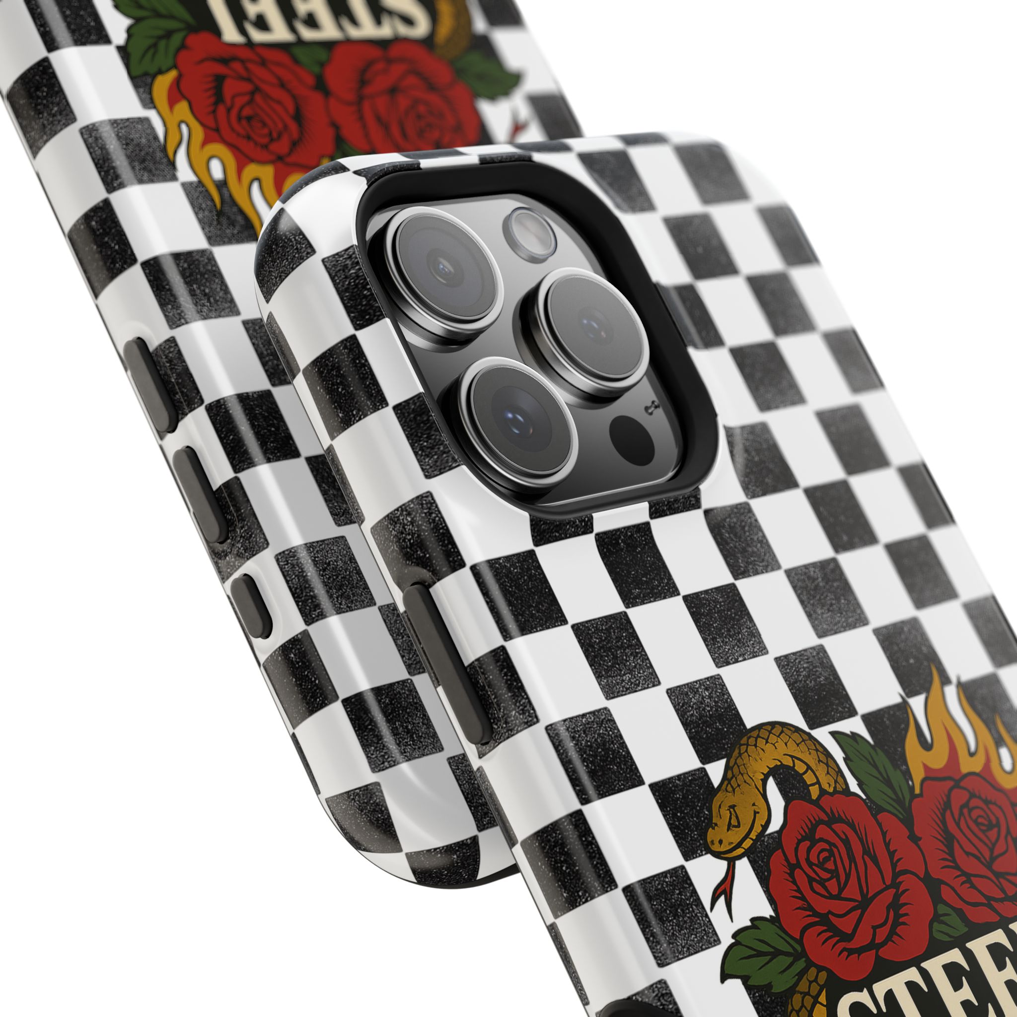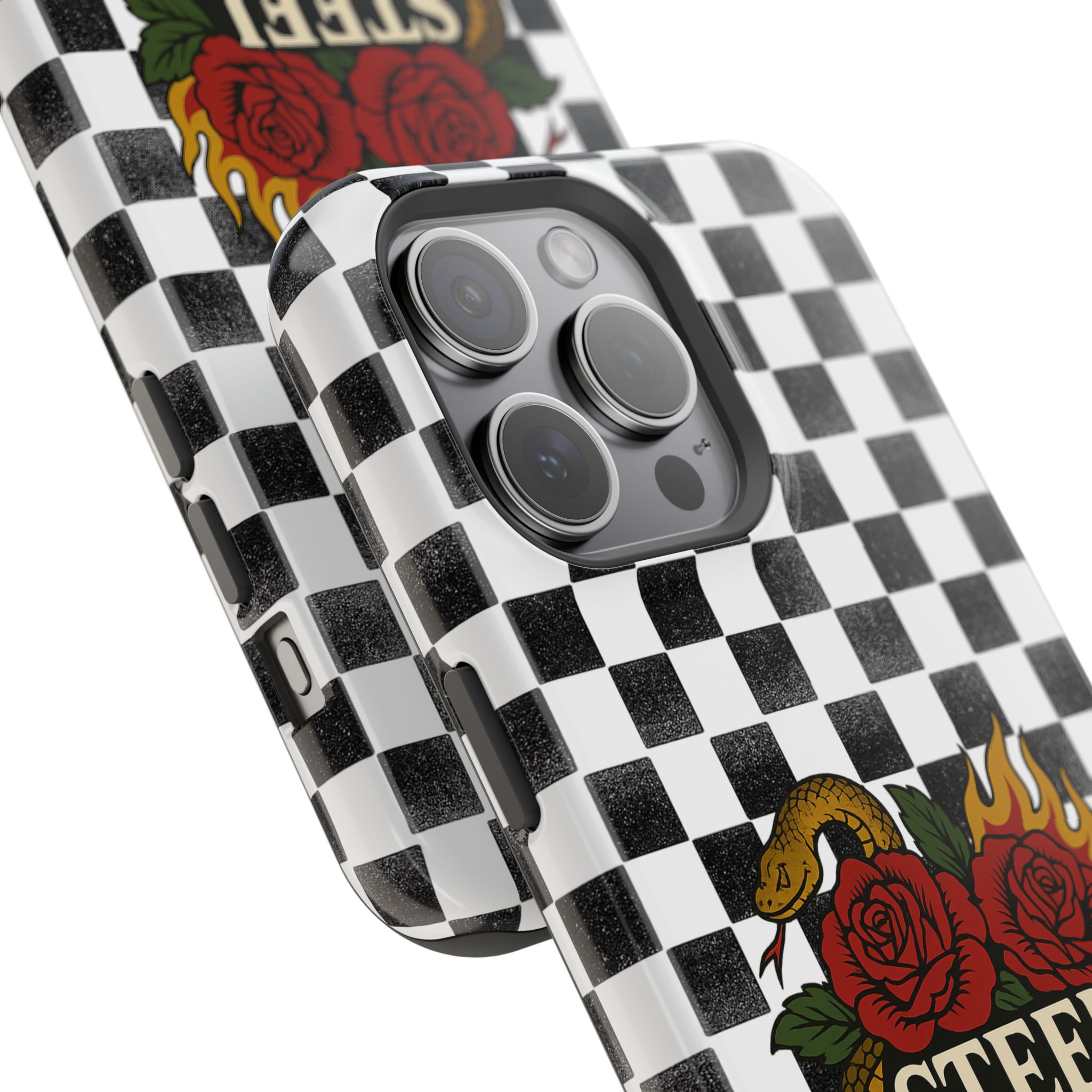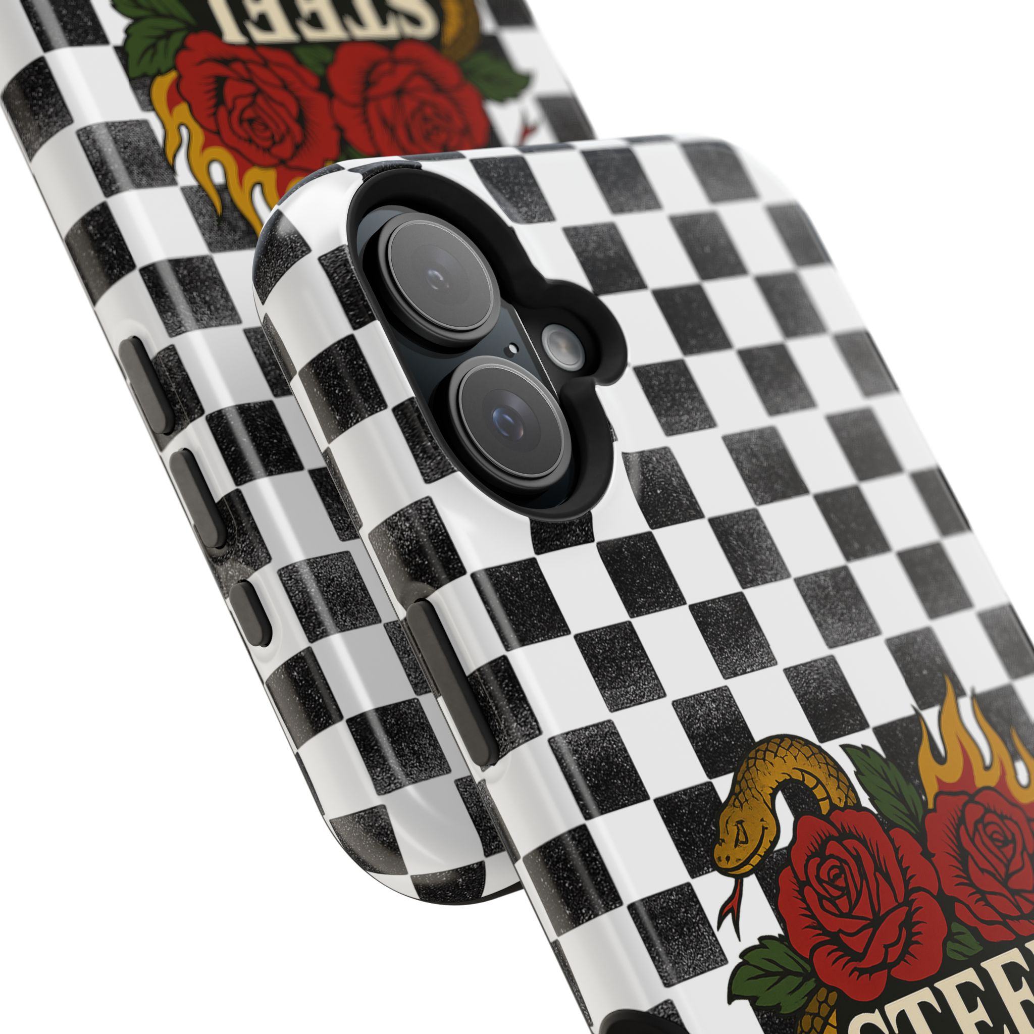 Protect your phone with attitude. The Rose Flame Phone Case features Steel Sirens’ iconic logo set against a bold black-and-white checkerboard backdrop, finished with fiery details, roses, and a venomous edge. Built for riders, rebels, and anyone who refuses to blend in, this case doesn’t just guard your phone, it makes a statement.