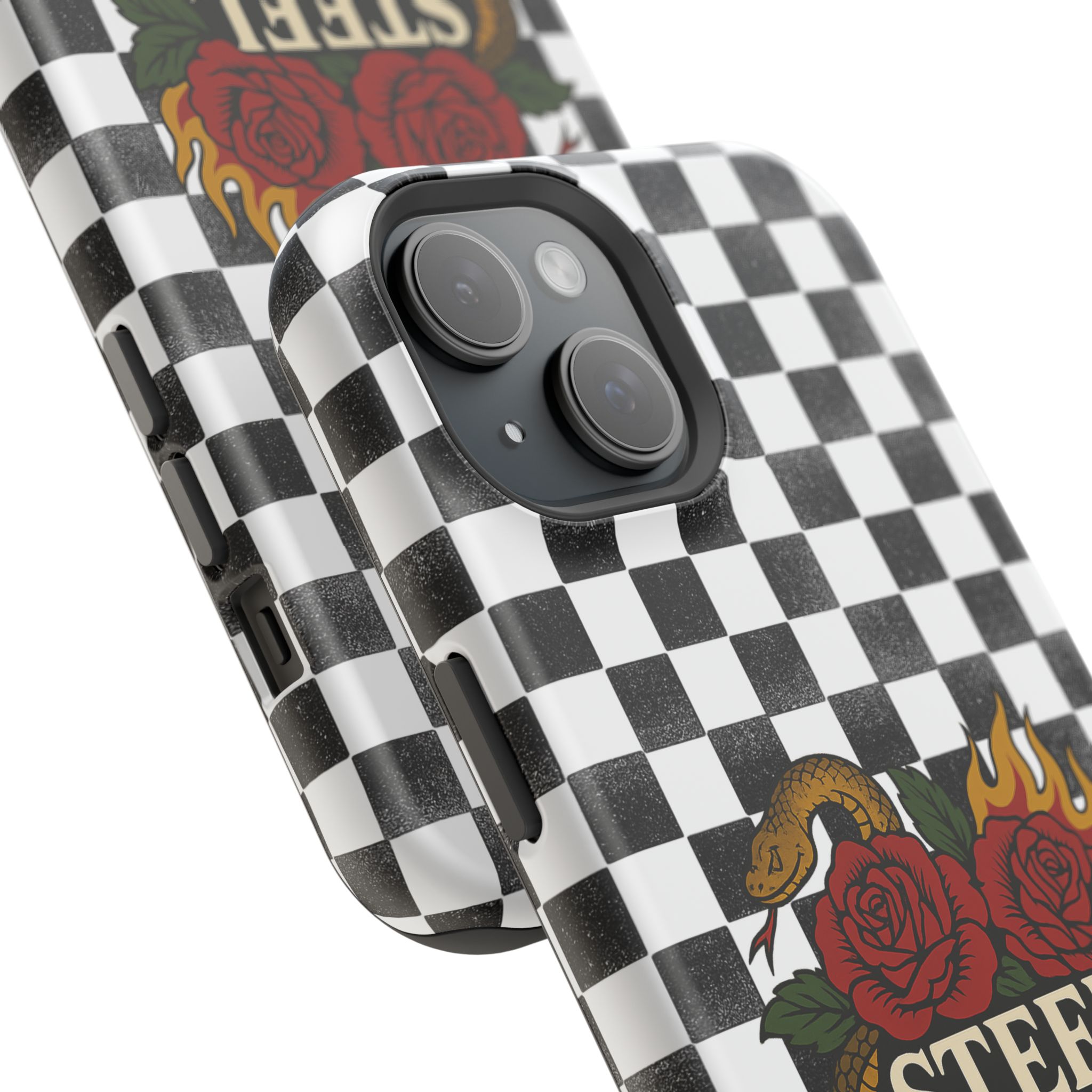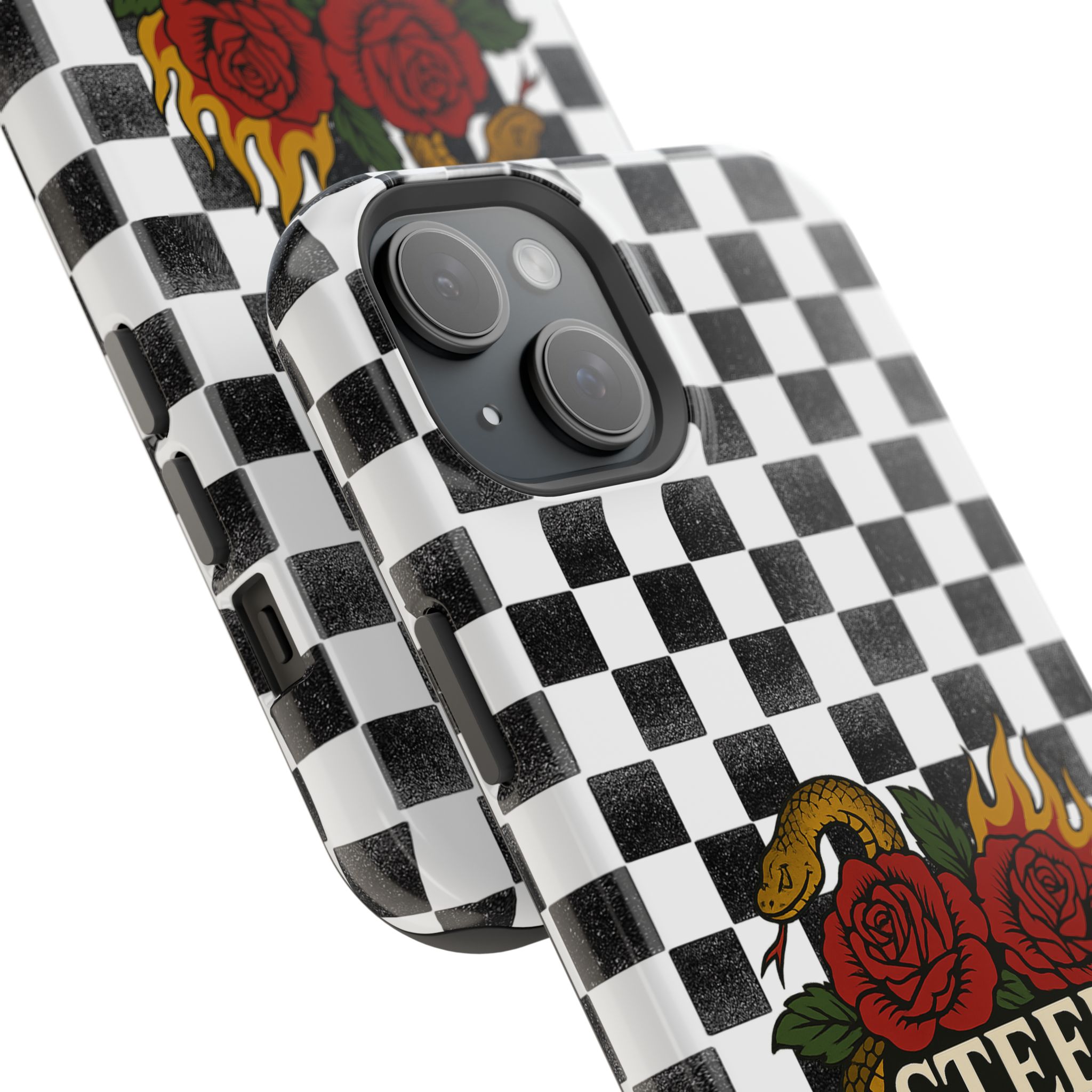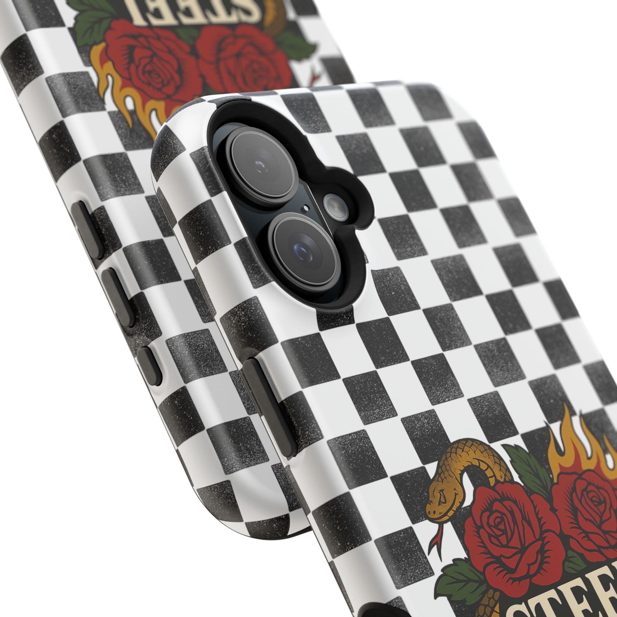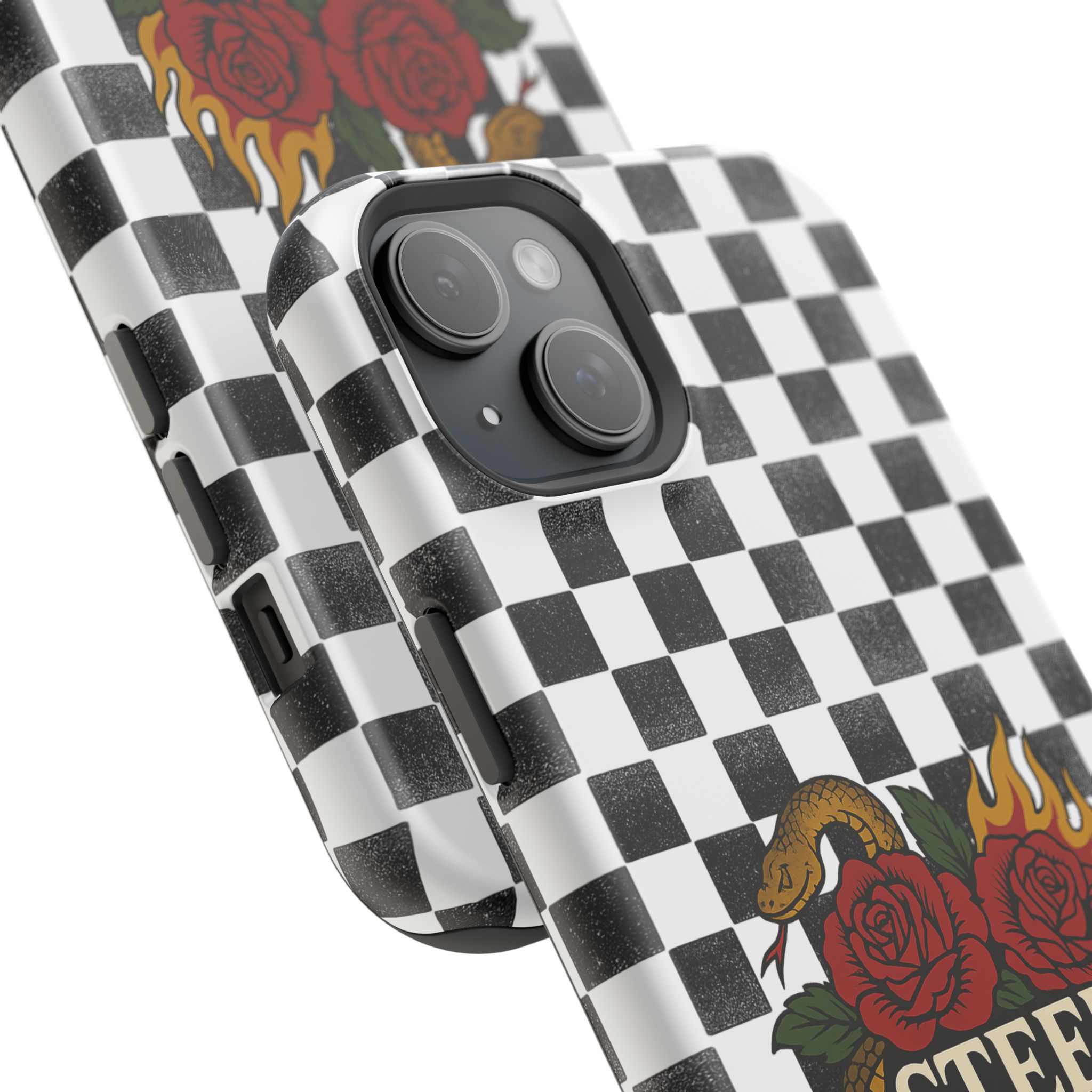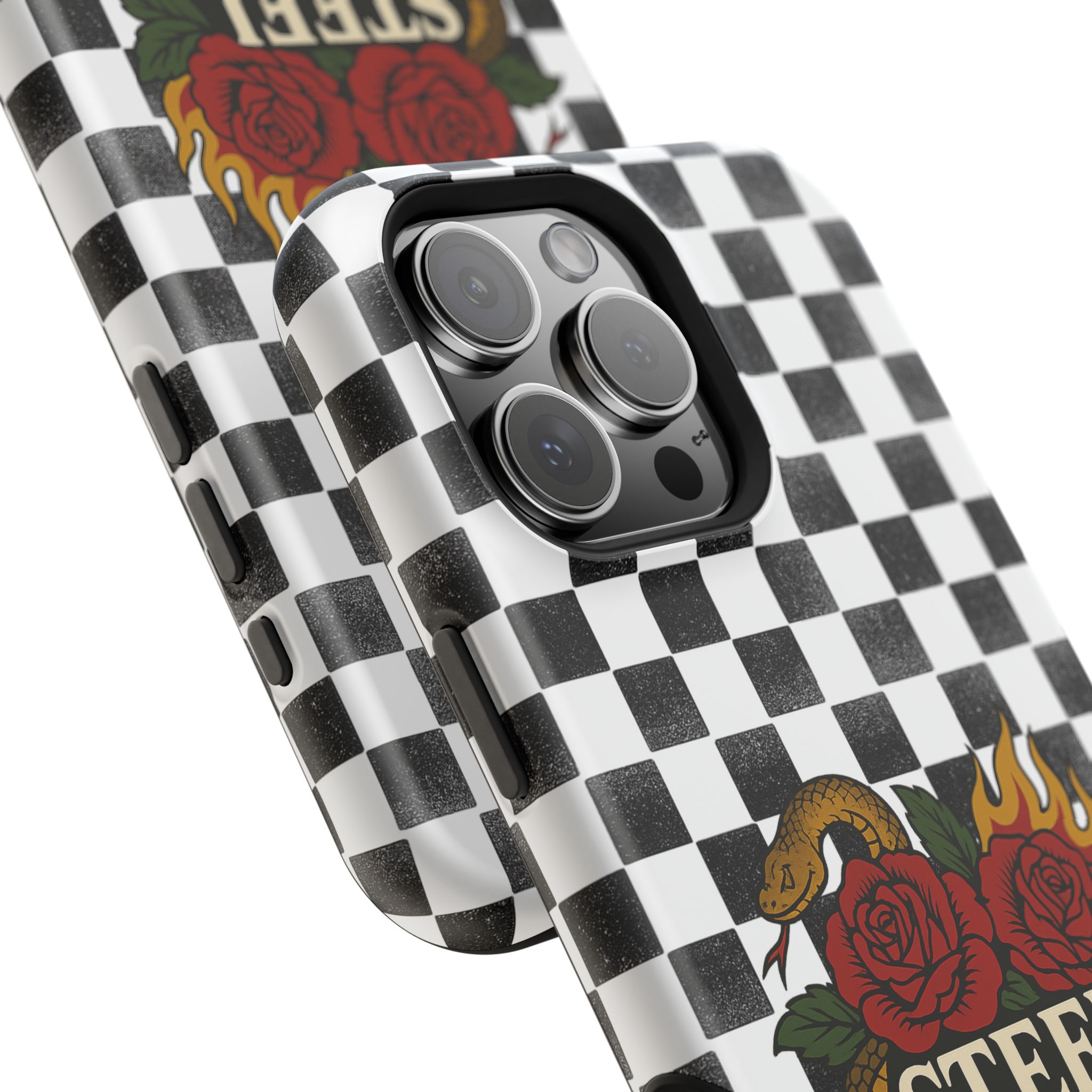 Protect your phone with attitude. The Rose Flame Phone Case features Steel Sirens’ iconic logo set against a bold black-and-white checkerboard backdrop, finished with fiery details, roses, and a venomous edge. Built for riders, rebels, and anyone who refuses to blend in, this case doesn’t just guard your phone, it makes a statement.