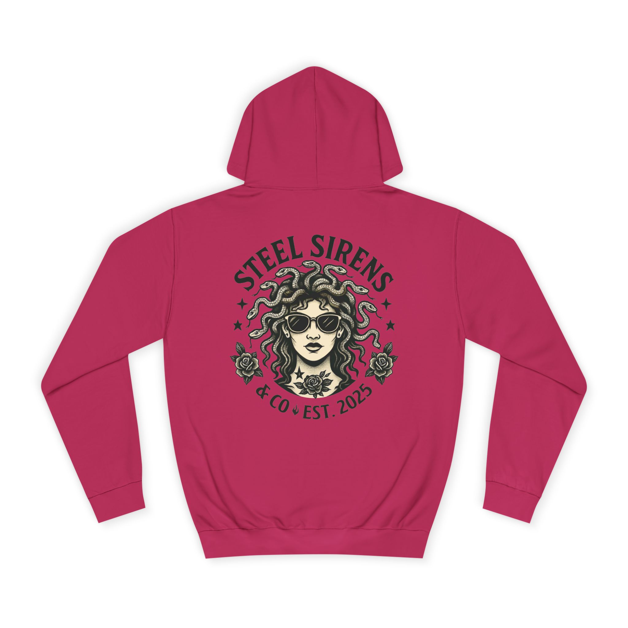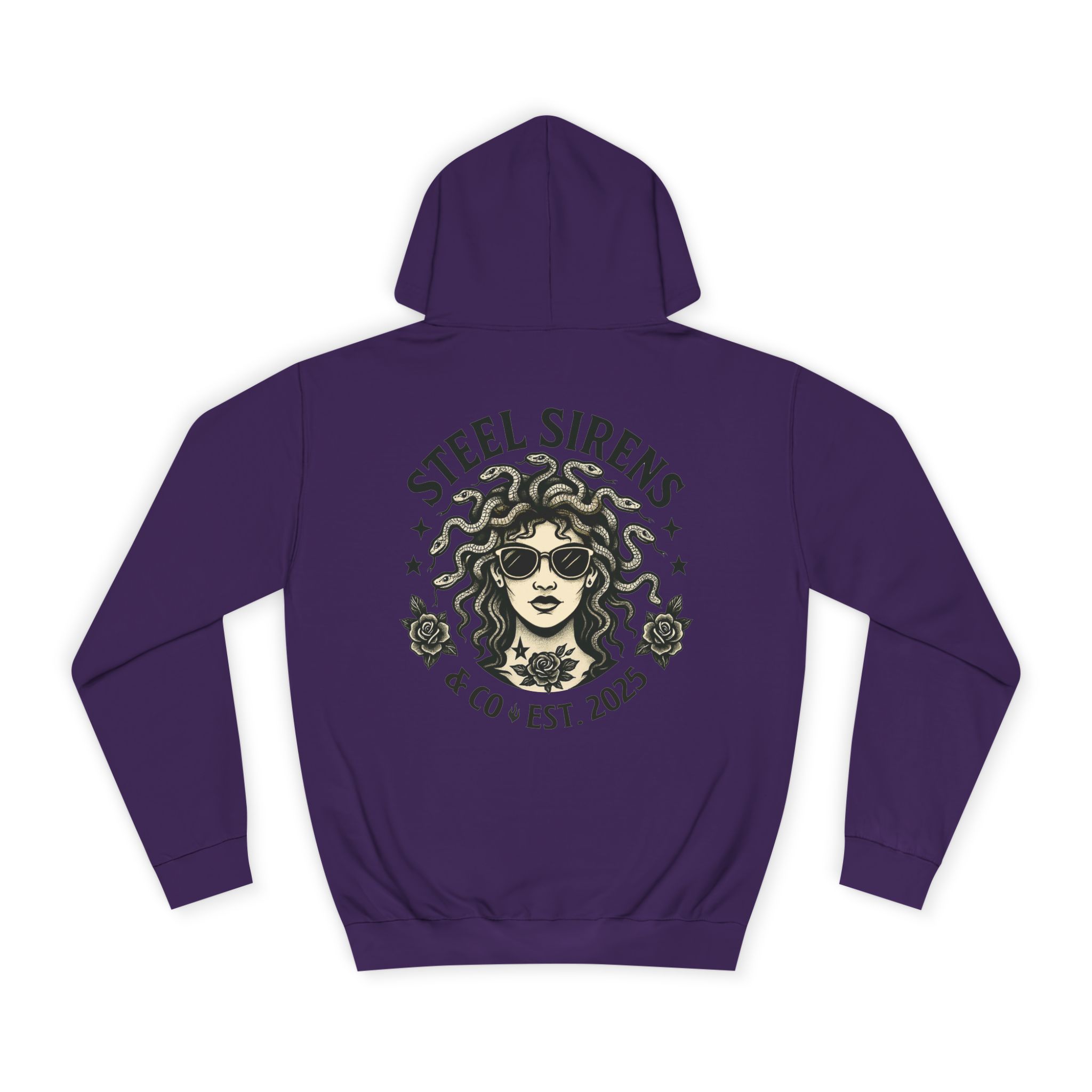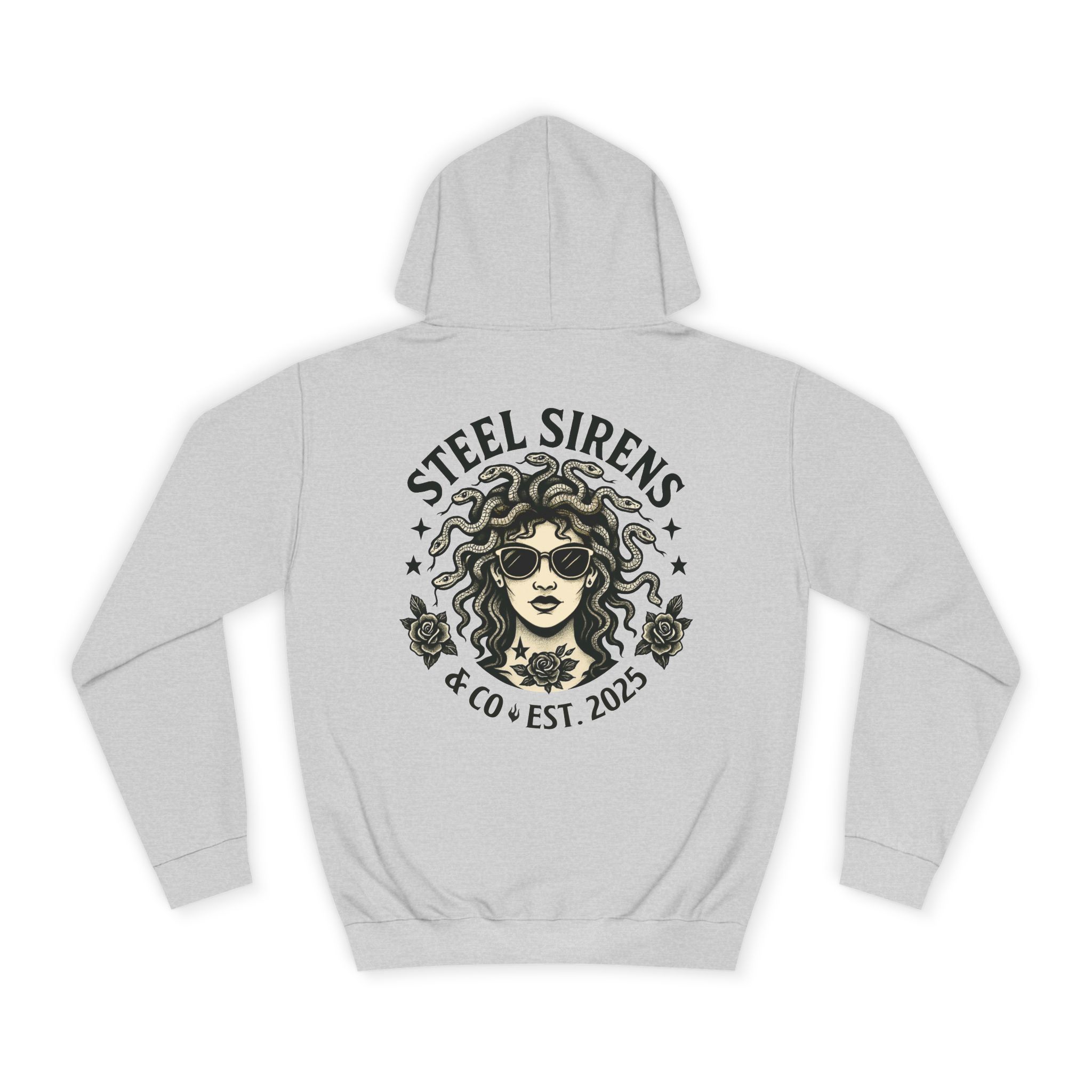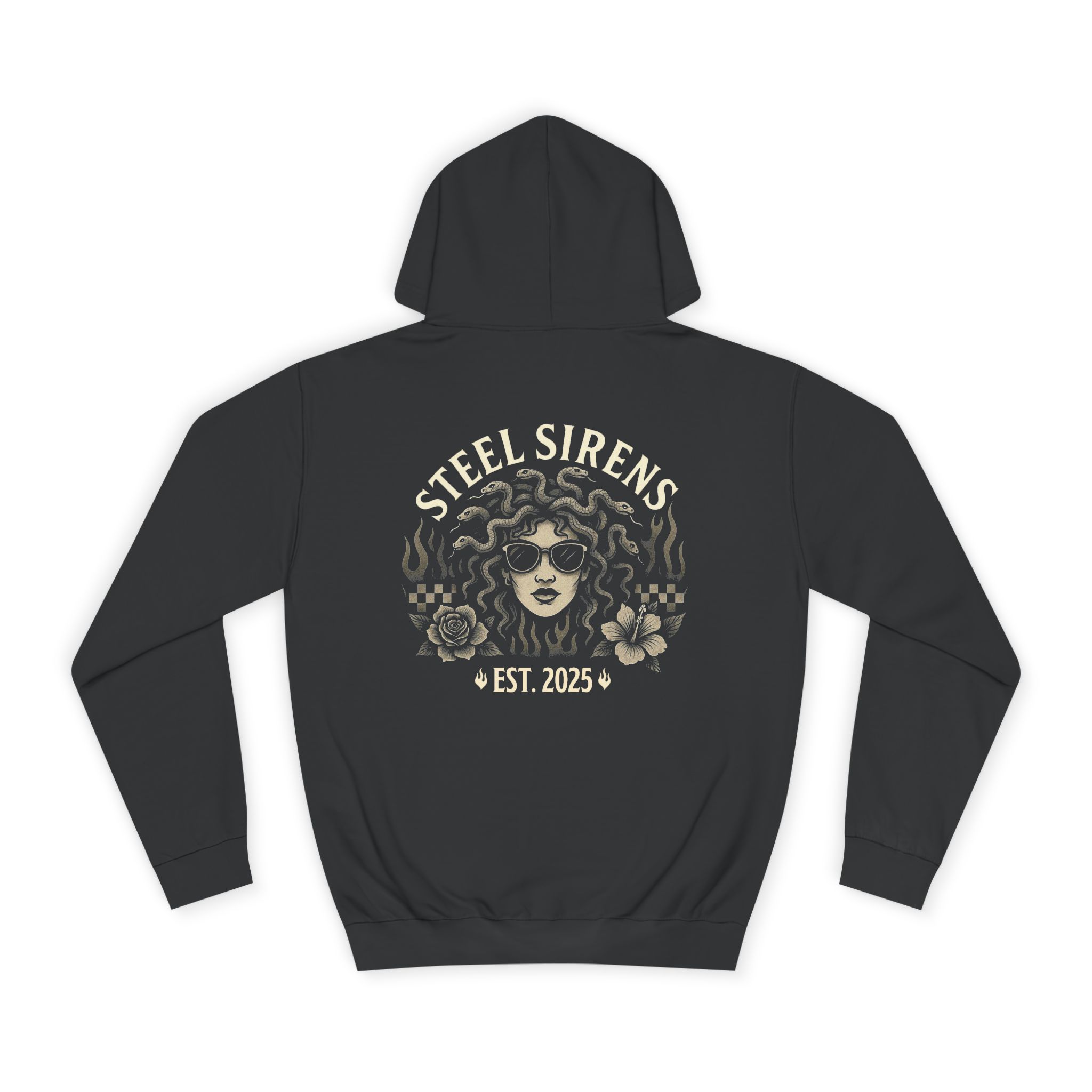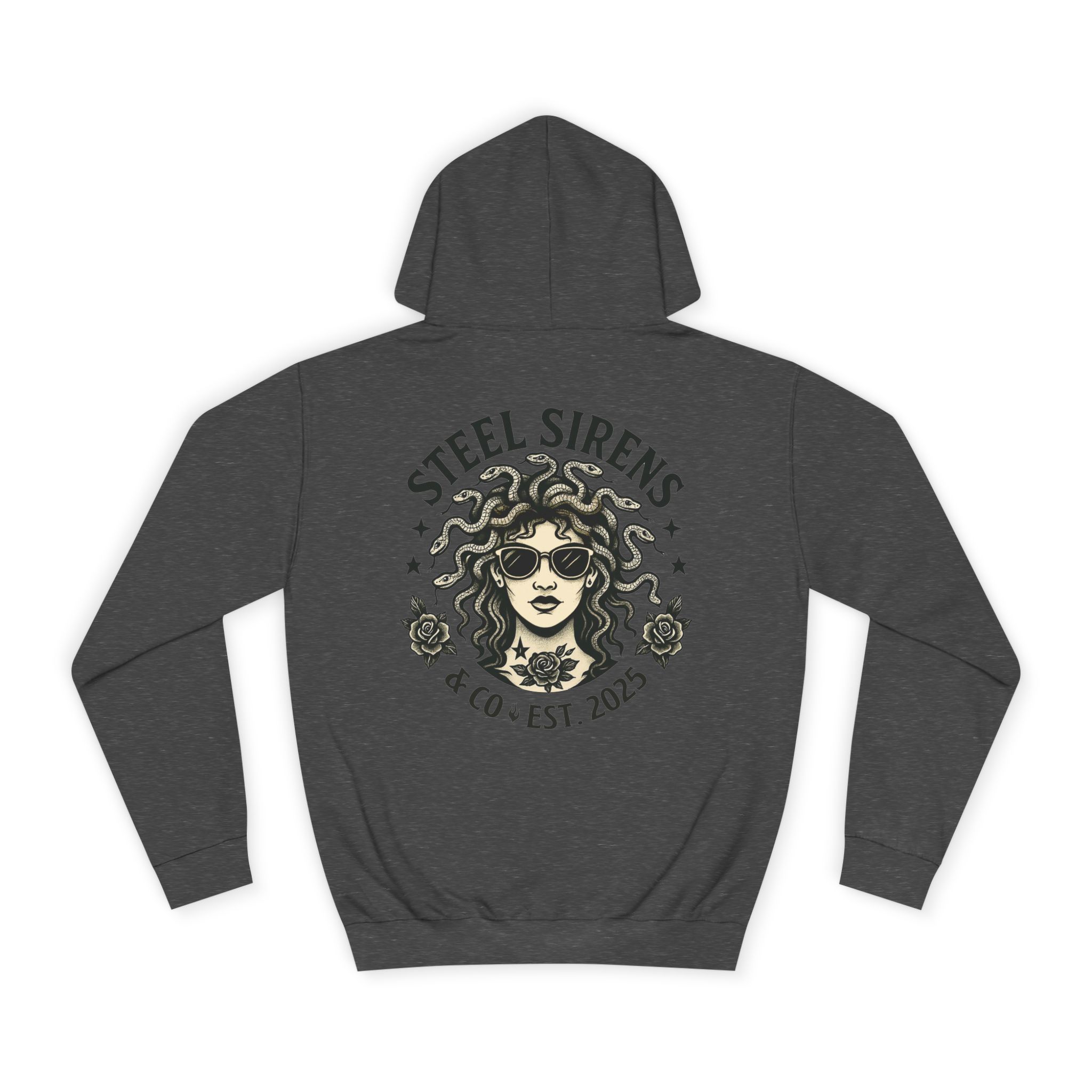 Stay warm, wild, and unapologetically bold in the Steel Sirens Moto Hoodie. Featuring our signature Medusa-inspired emblem on the back and minimalist chest logo on the front, this hoodie is designed for the women who ride hard, live louder, and lead with fearless energy.