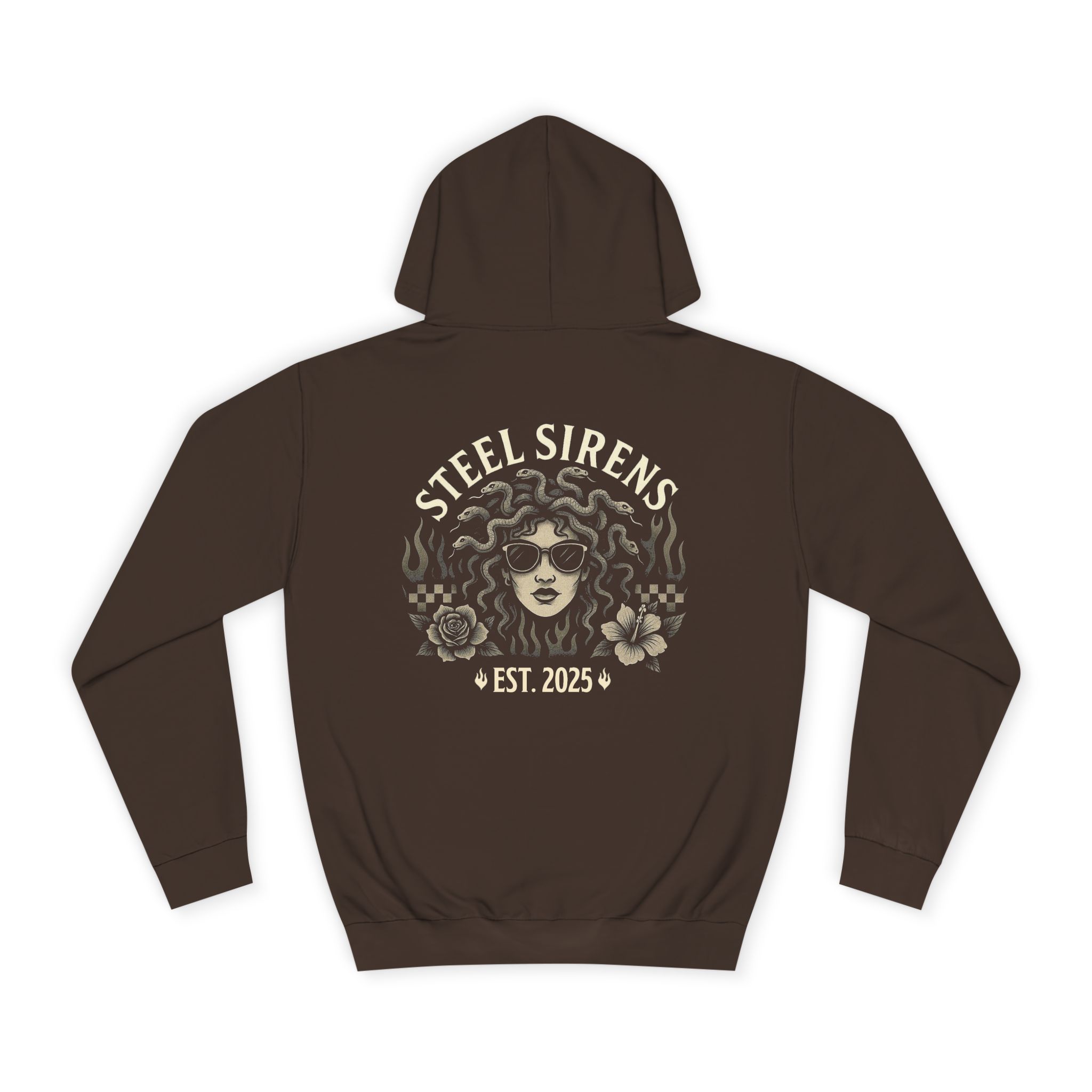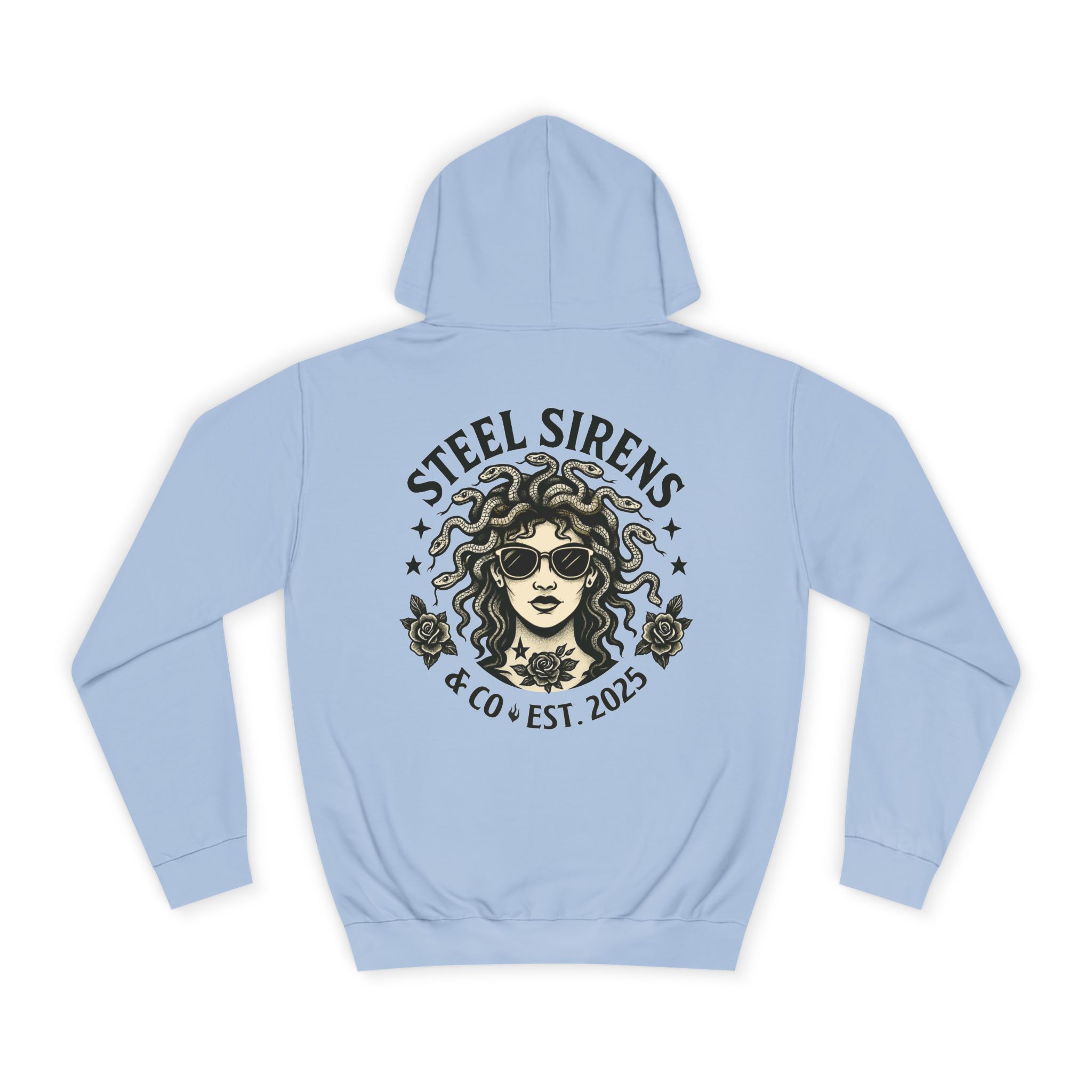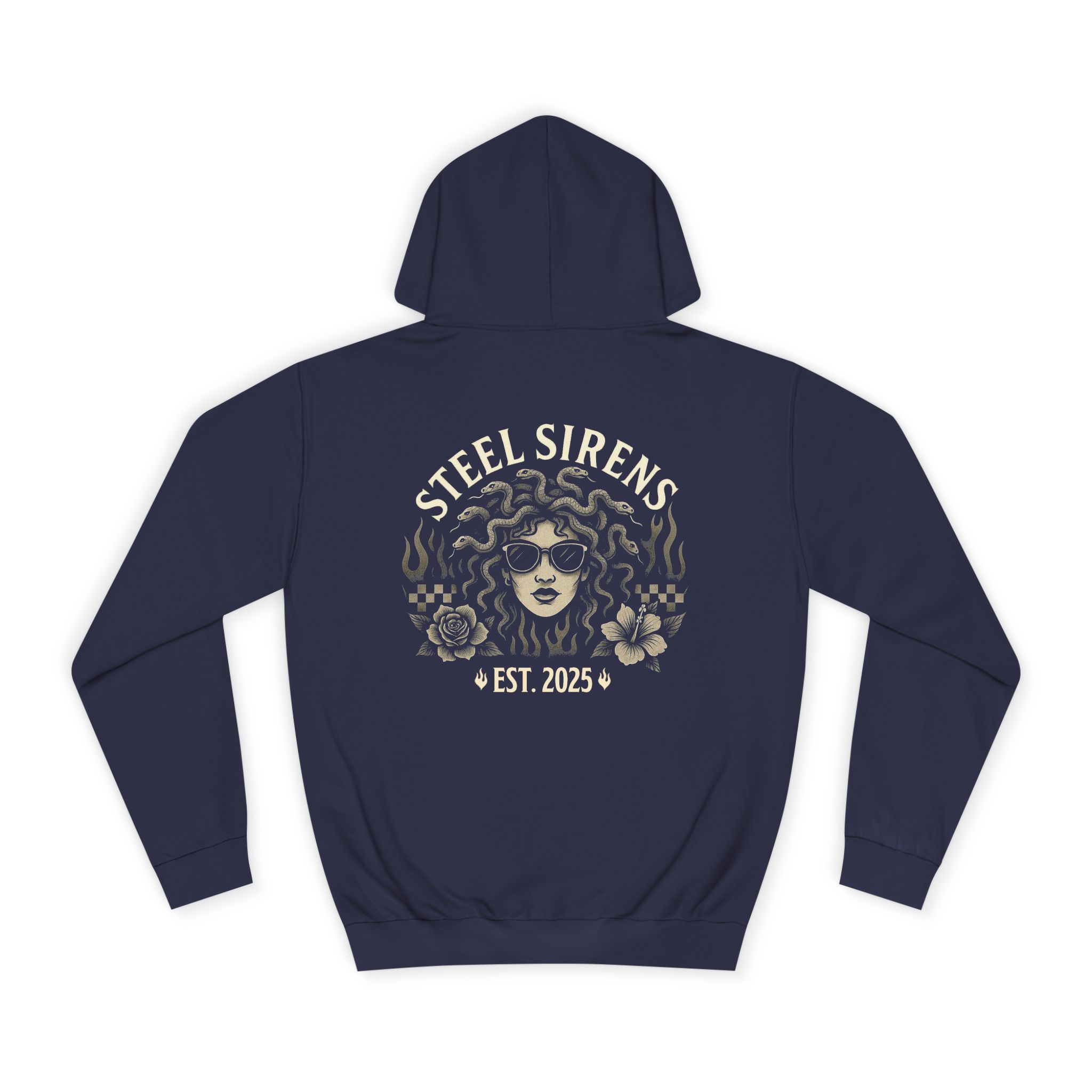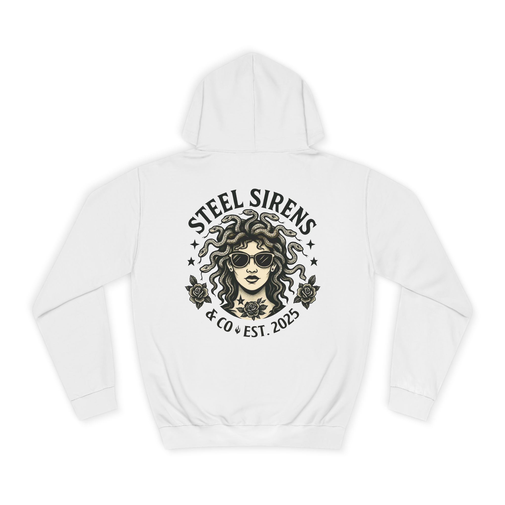 Stay warm, wild, and unapologetically bold in the Steel Sirens Moto Hoodie. Featuring our signature Medusa-inspired emblem on the back and minimalist chest logo on the front, this hoodie is designed for the women who ride hard, live louder, and lead with fearless energy.