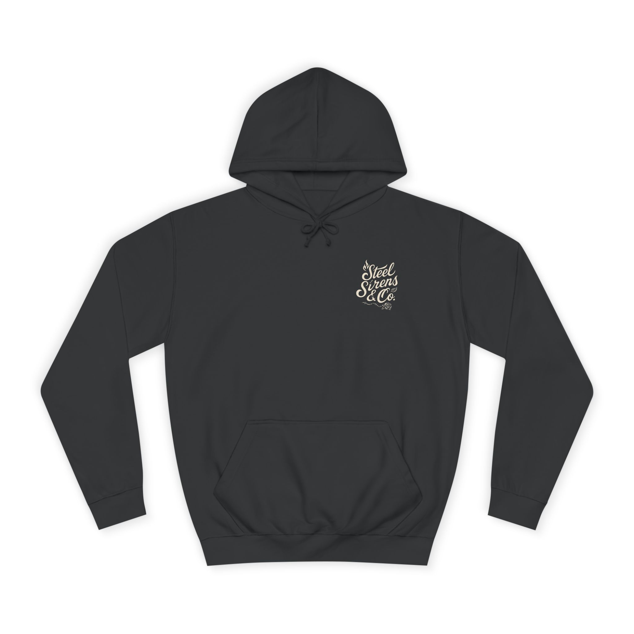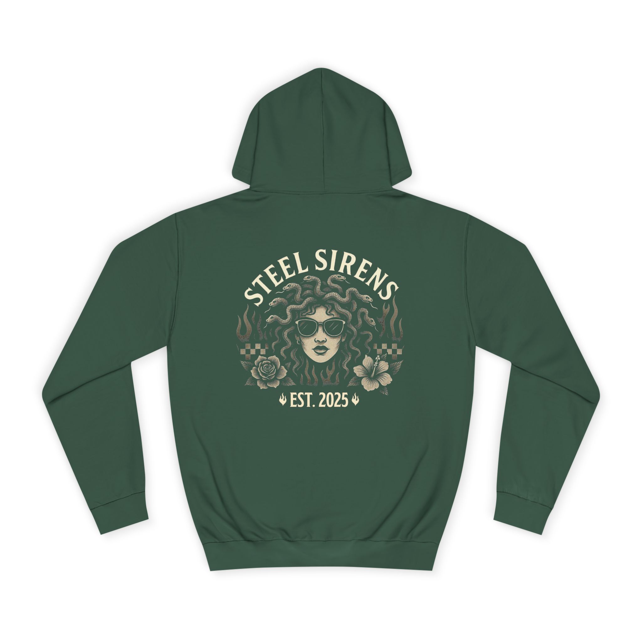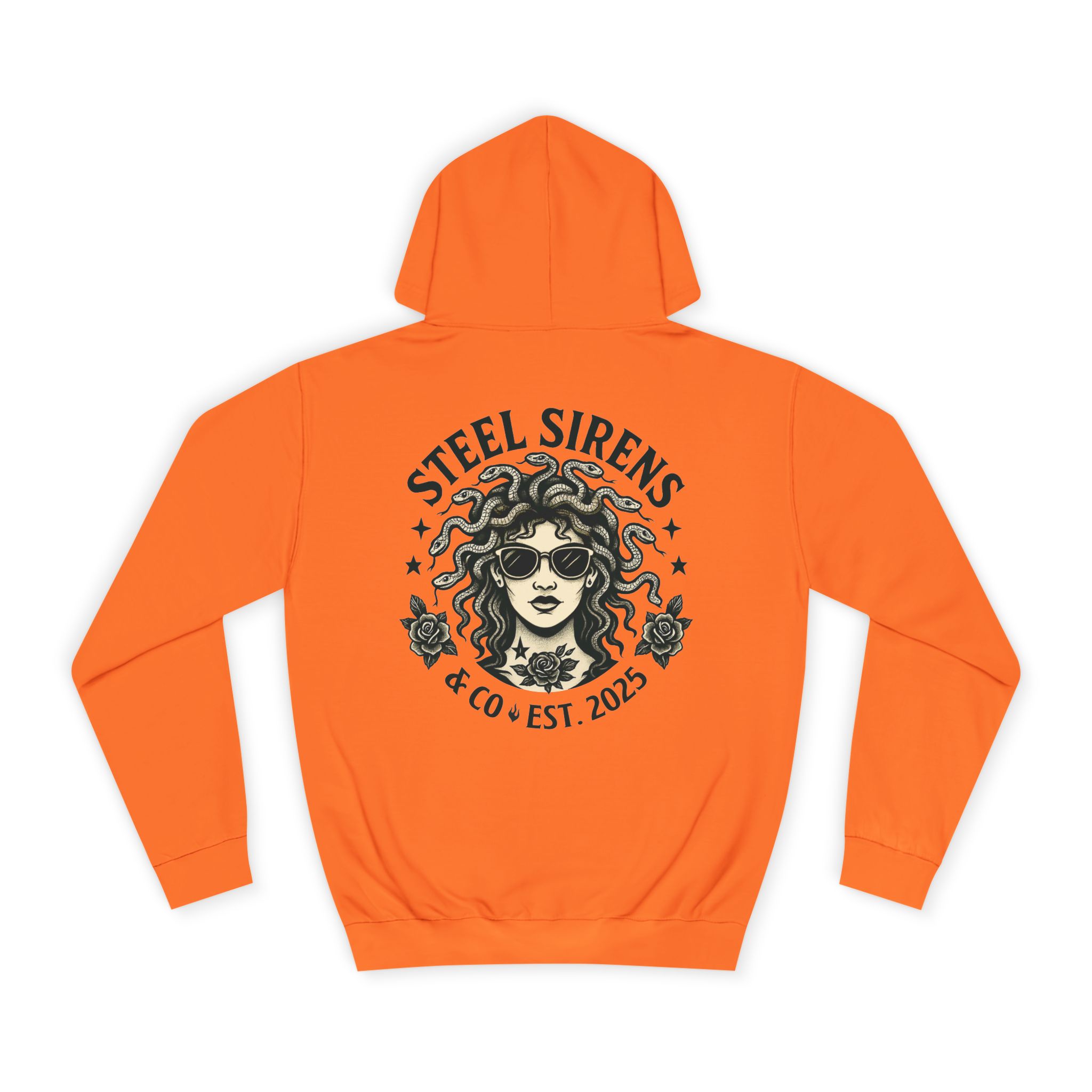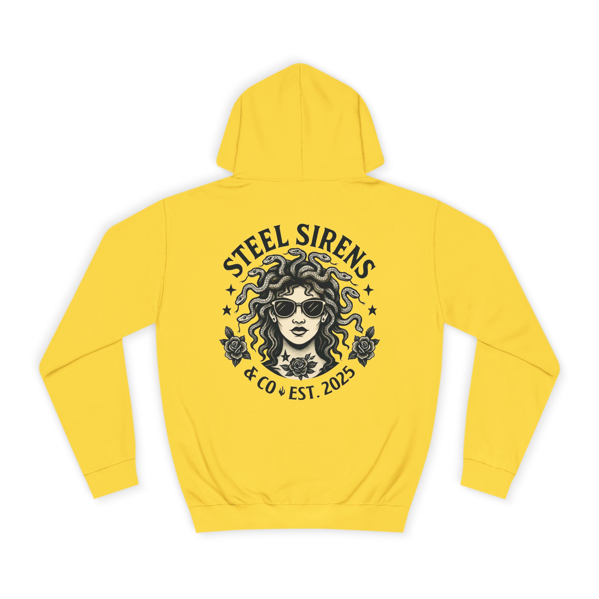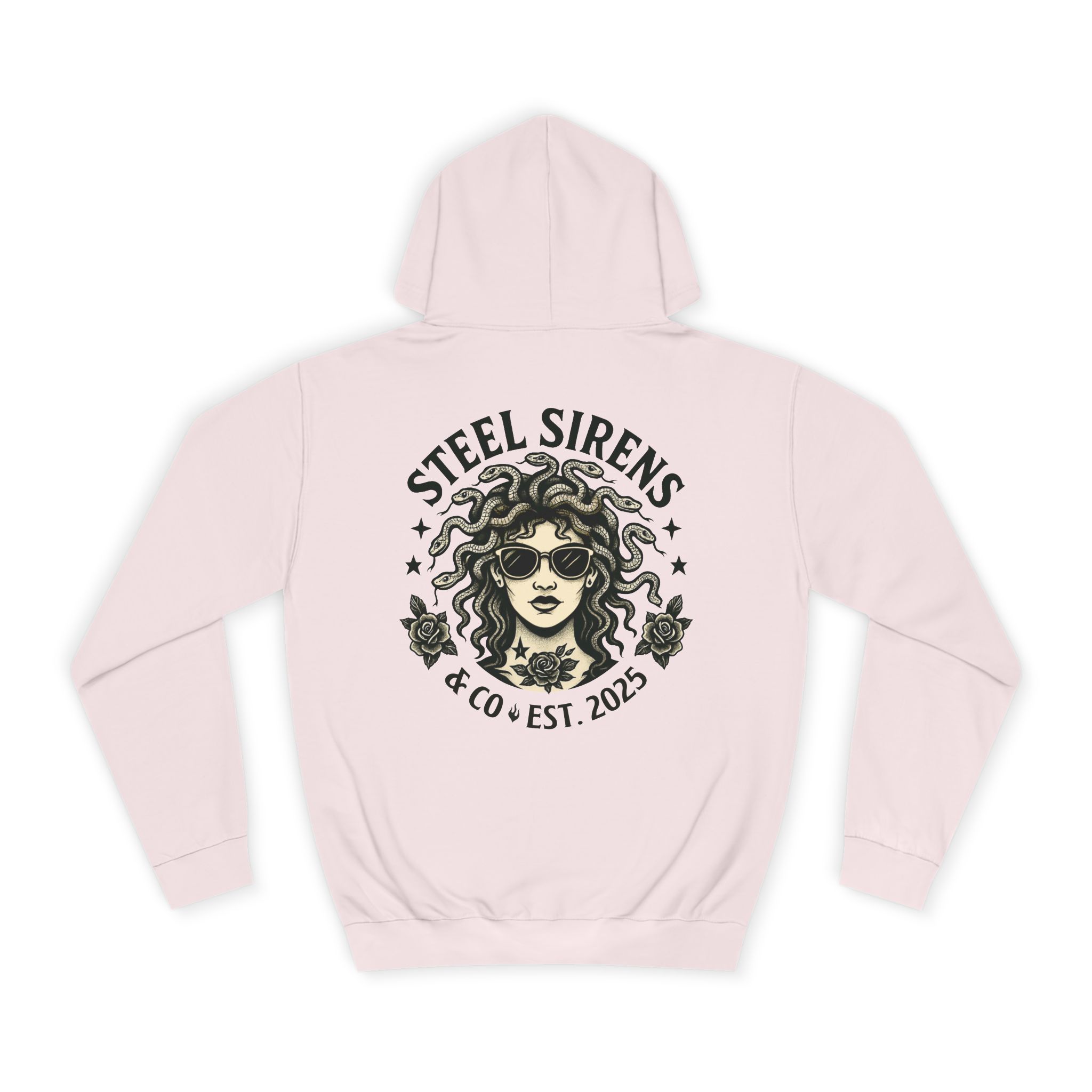 Stay warm, wild, and unapologetically bold in the Steel Sirens Moto Hoodie. Featuring our signature Medusa-inspired emblem on the back and minimalist chest logo on the front, this hoodie is designed for the women who ride hard, live louder, and lead with fearless energy.