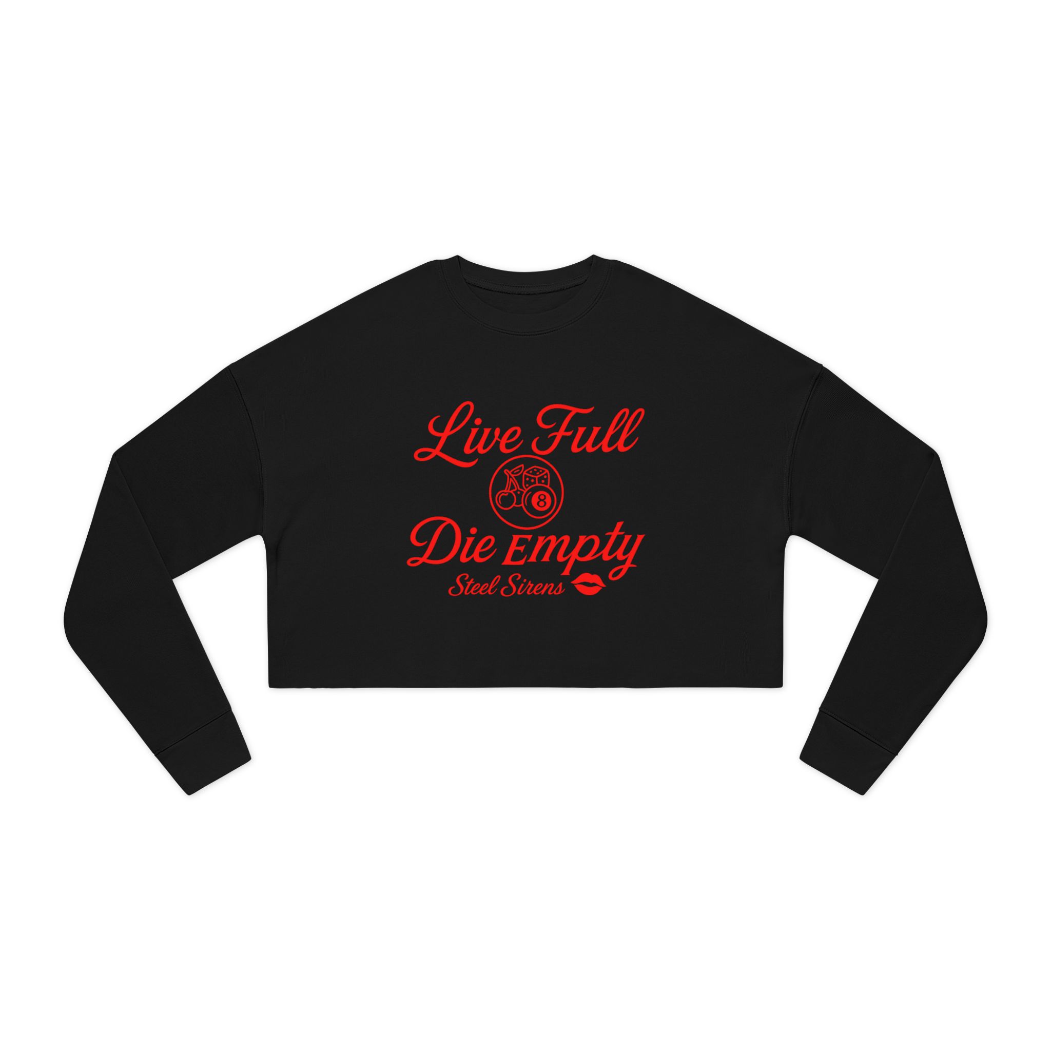 Ride bold and live louder in this Steel Sirens “Live Full, Die Empty”crop sweatshirt. Designed for fearless women who put passion first, this cozy cropped sweater features a striking hot-red neon graphic — cherries, dice, a lightning bolt, and the signature Steel Sirens lips.