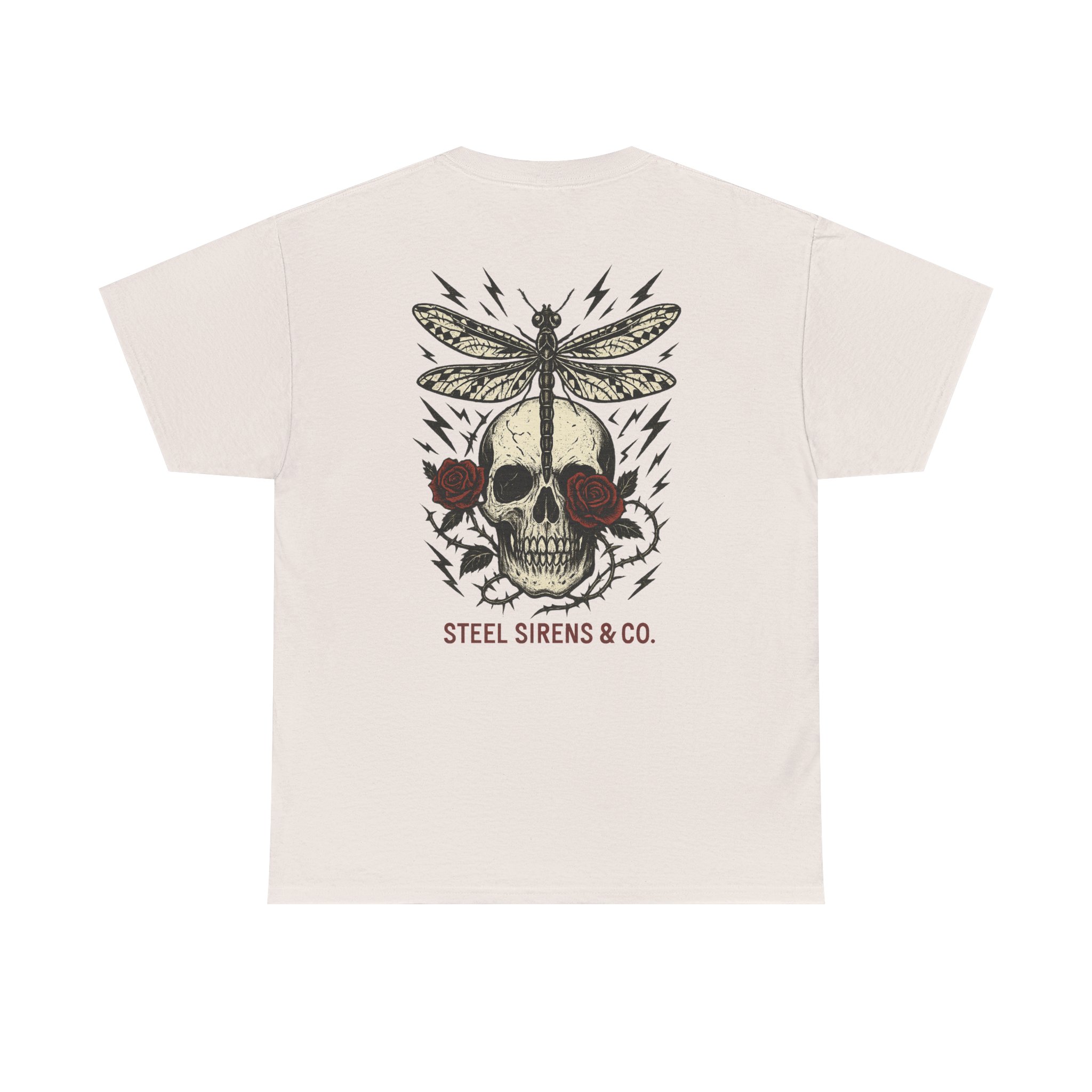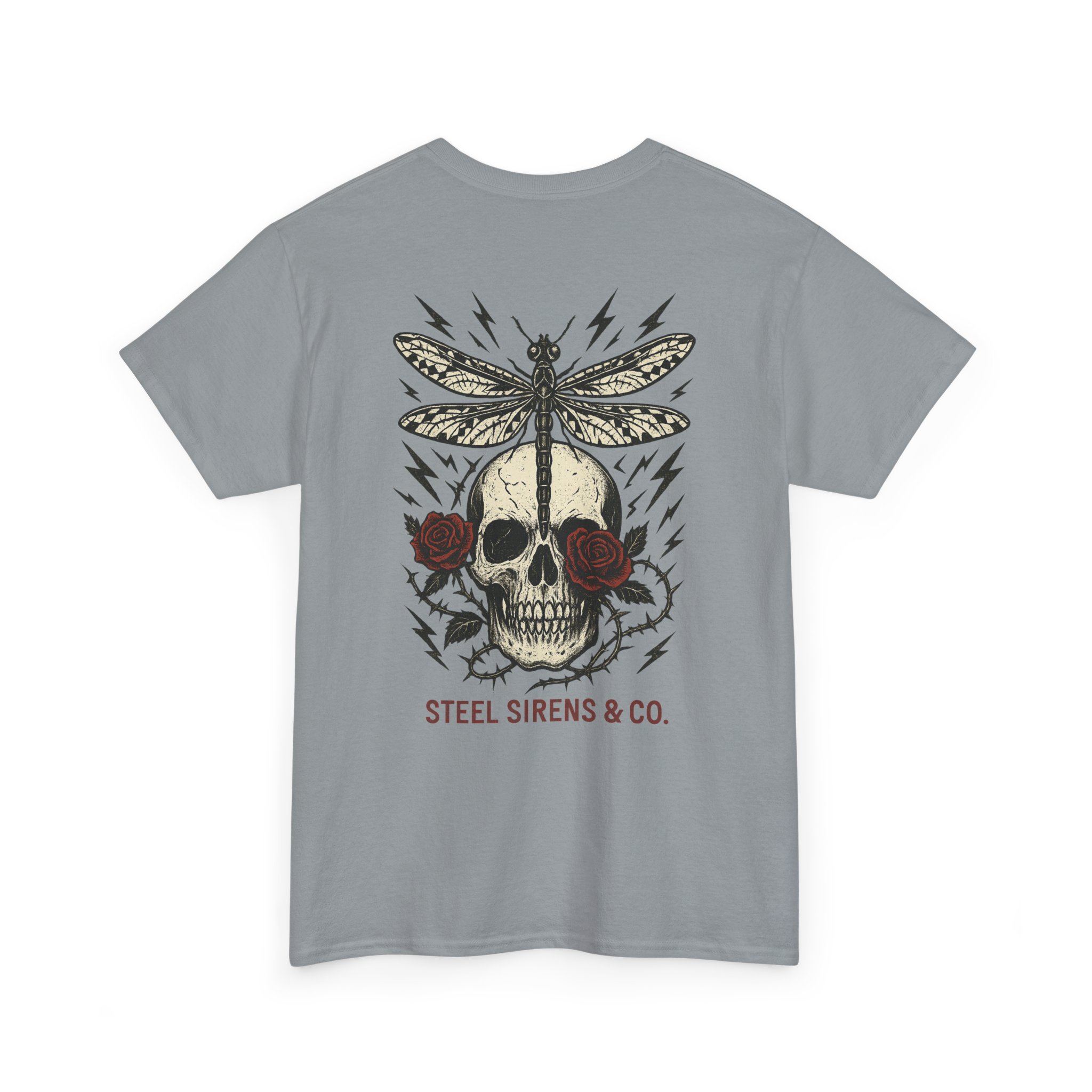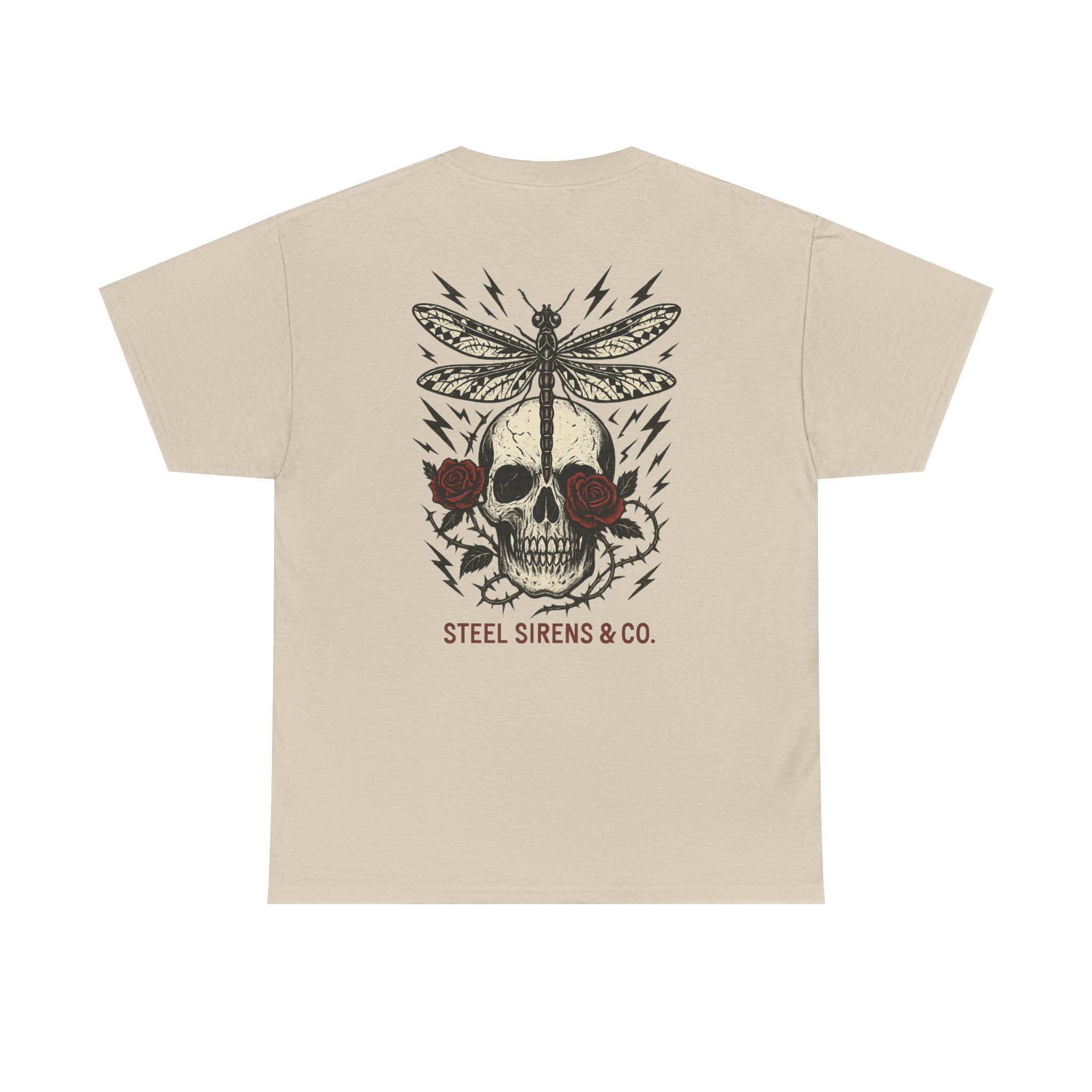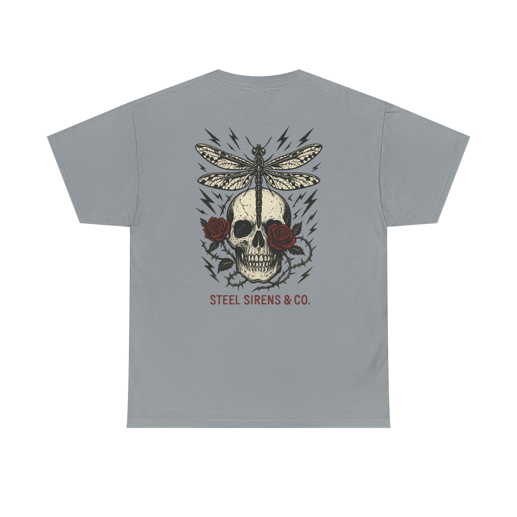 Dark. Daring. Unforgettable. The Deadly Beauty Tee is a fusion of beauty and raw power. Featuring a detailed skull framed by roses with a dragonfly perched on top, surrounded by crackling lightning bolts, this design captures transformation, death, rebirth, resilience, and untamed energy. Finished with the Steel Sirens & Co. name, it’s a statement piece for rebels who thrive in both chaos and change.