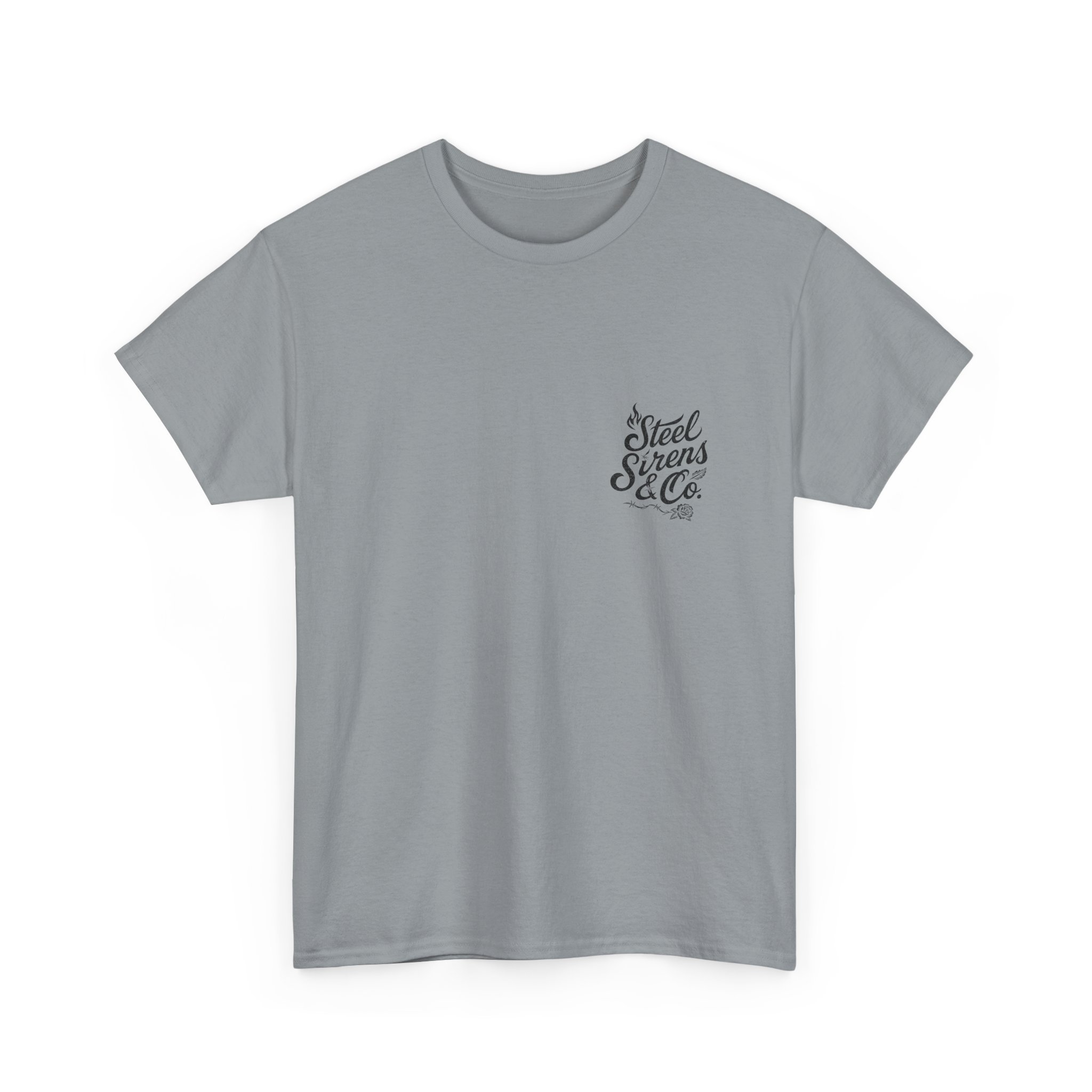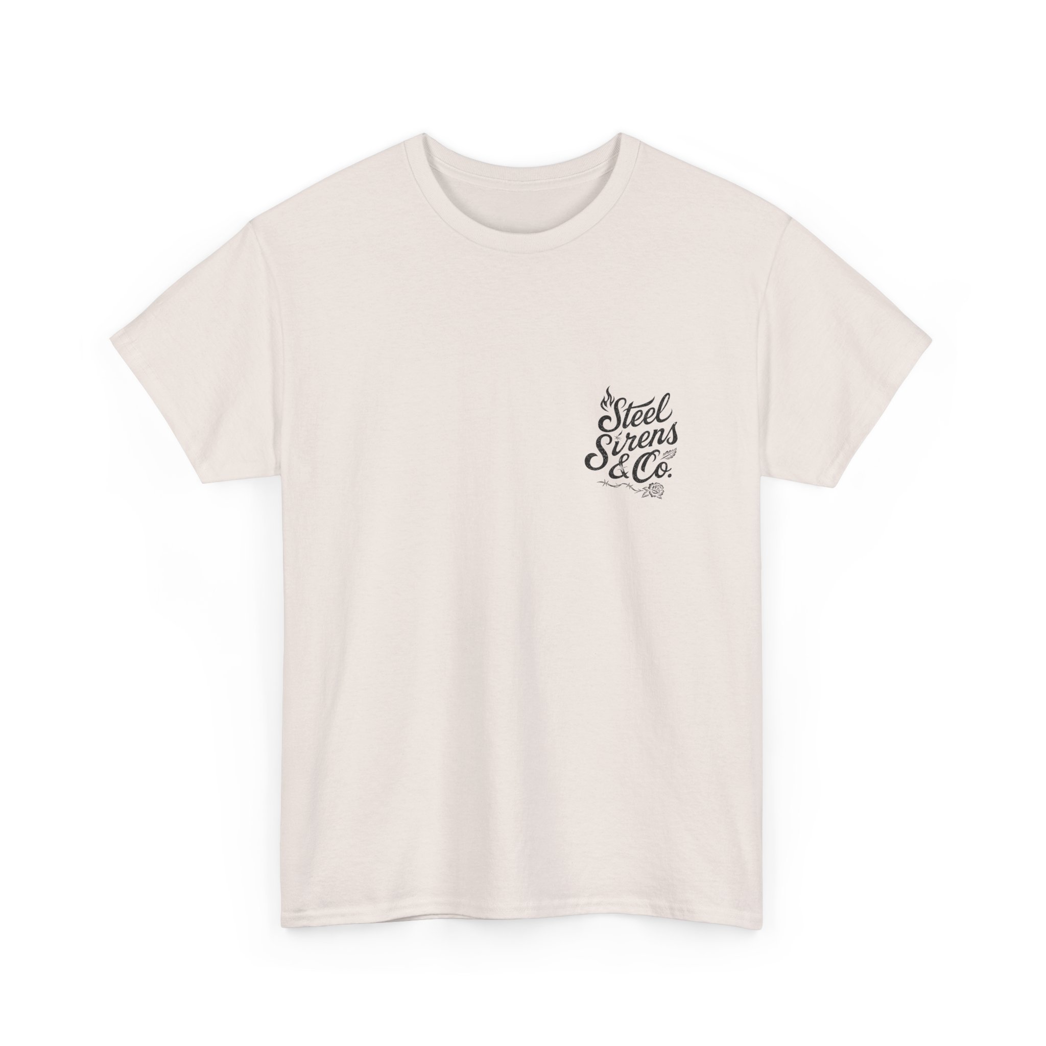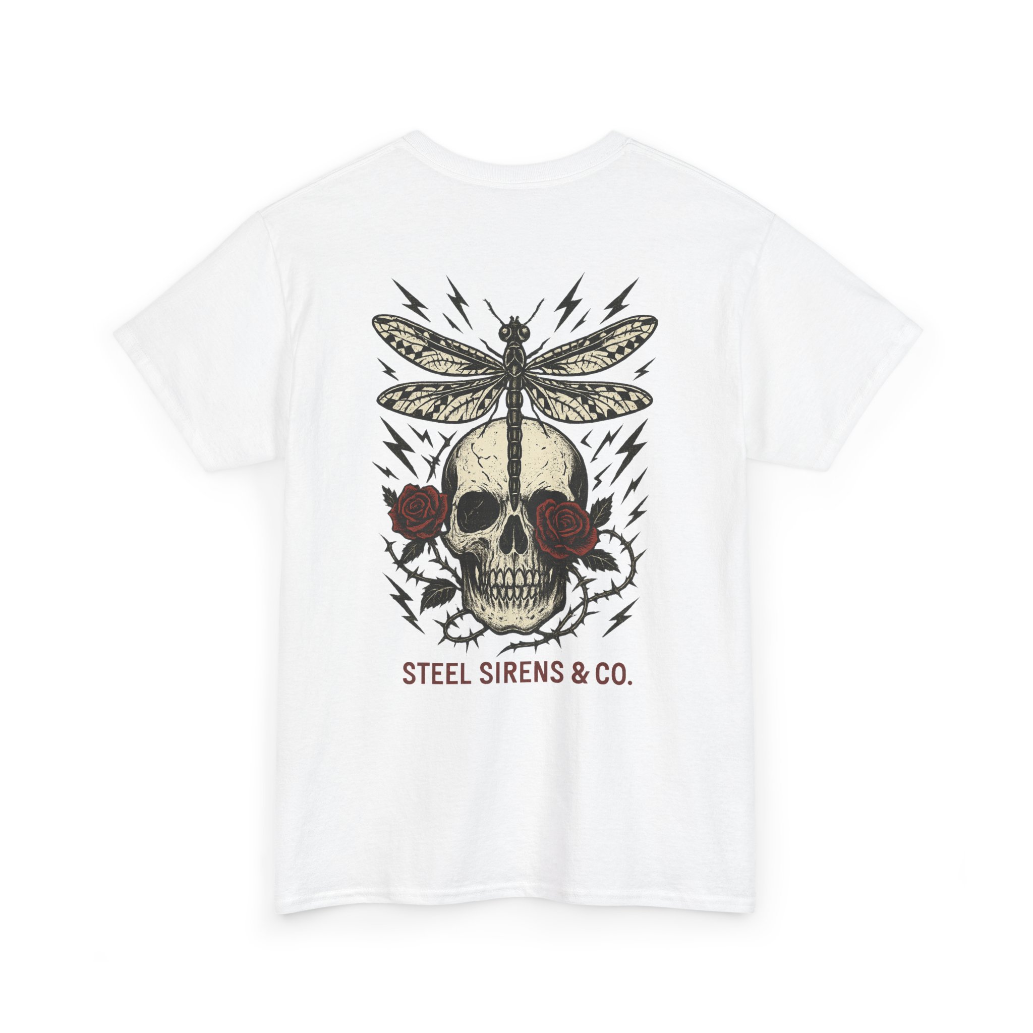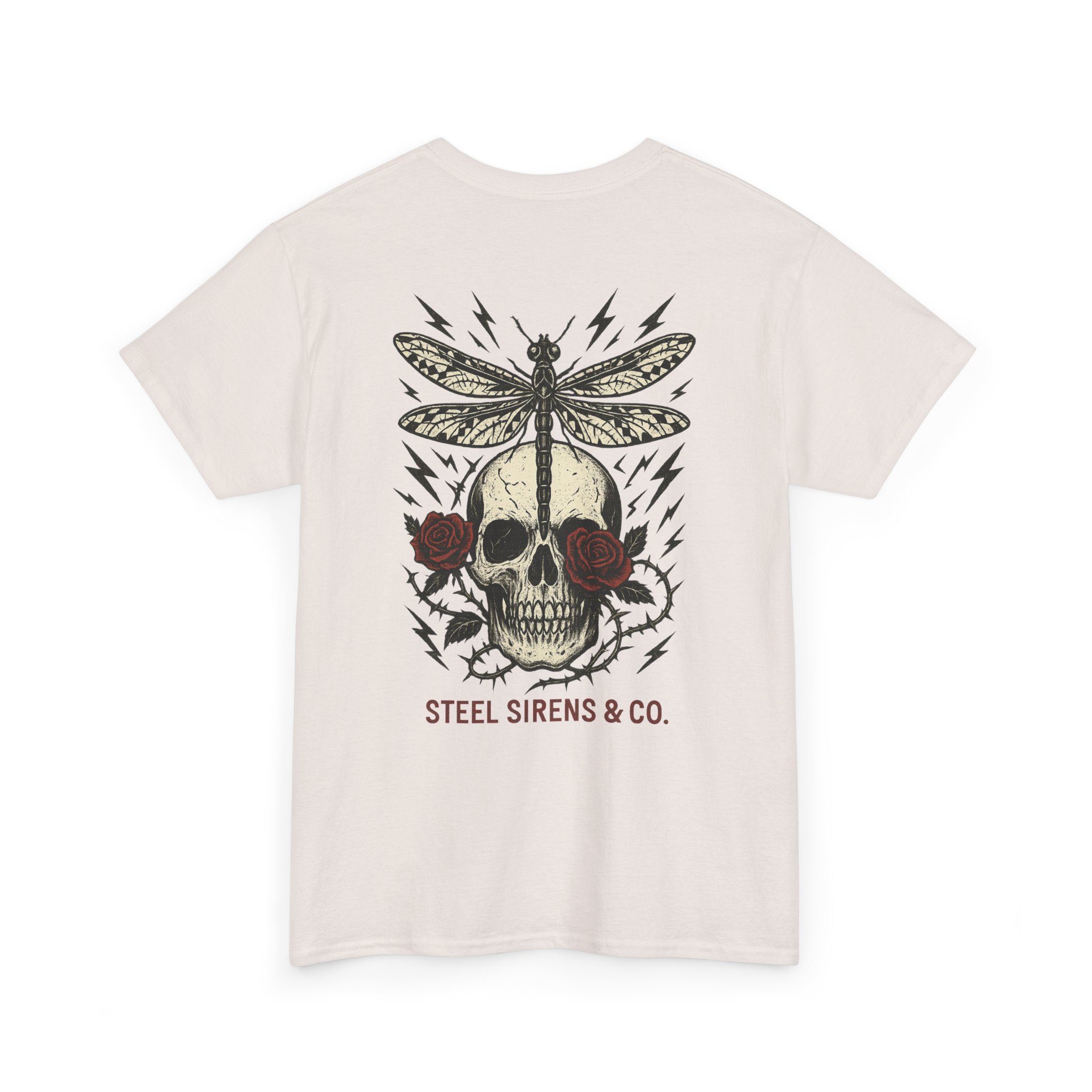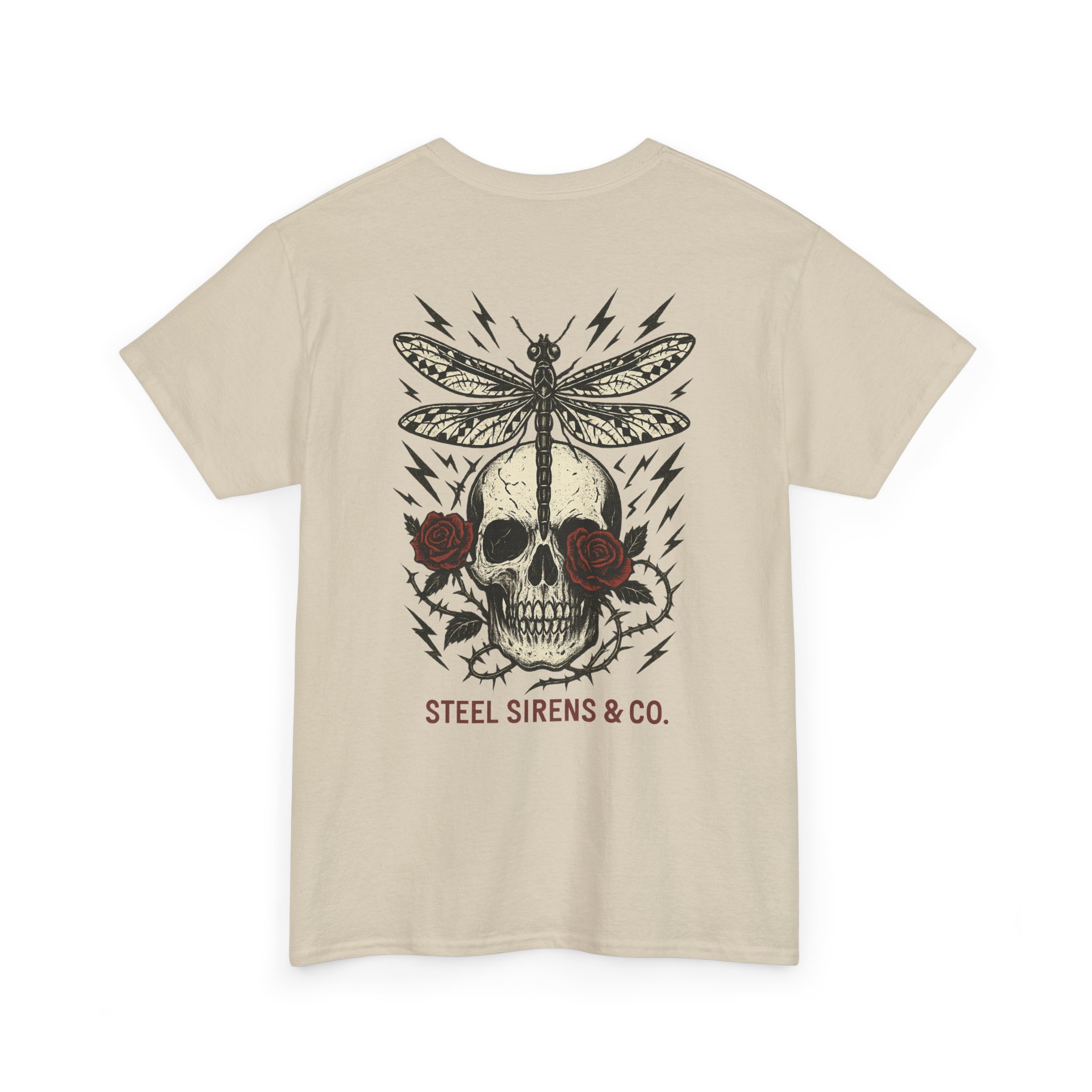 Dark. Daring. Unforgettable. The Deadly Beauty Tee is a fusion of beauty and raw power. Featuring a detailed skull framed by roses with a dragonfly perched on top, surrounded by crackling lightning bolts, this design captures transformation, death, rebirth, resilience, and untamed energy. Finished with the Steel Sirens & Co. name, it’s a statement piece for rebels who thrive in both chaos and change.