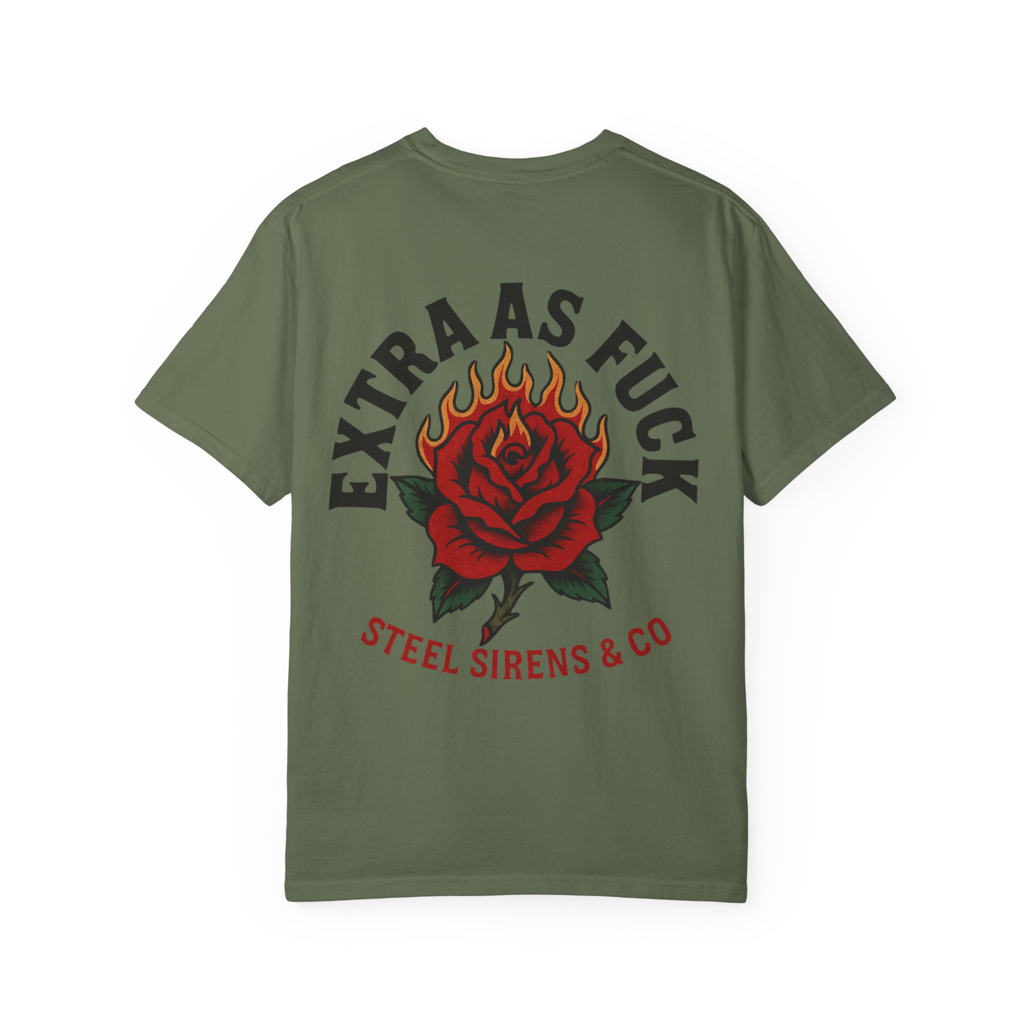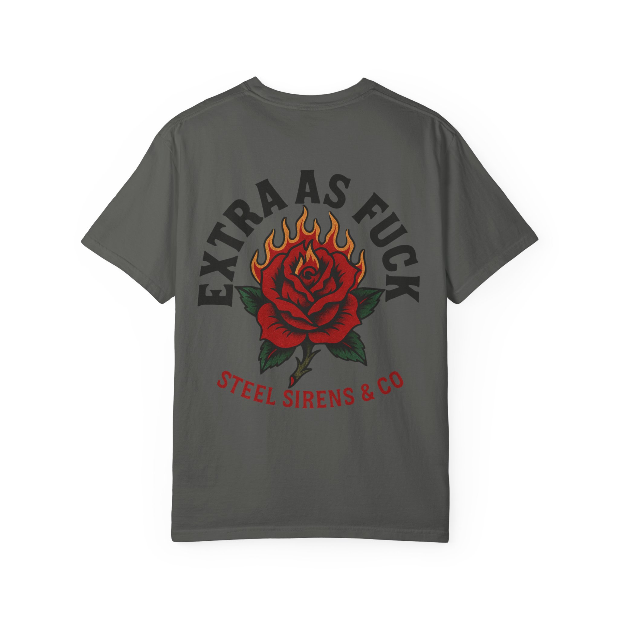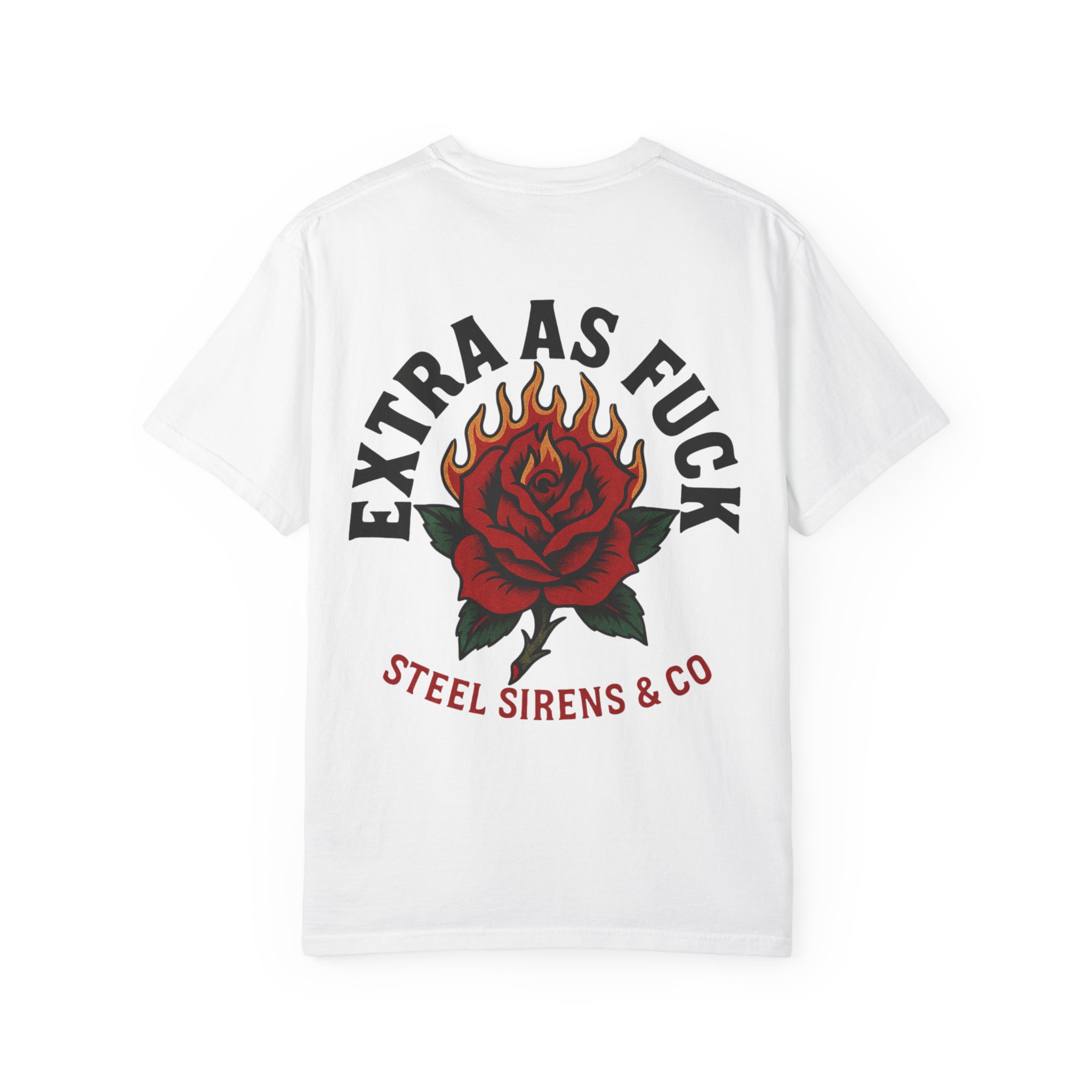 Turn heads and own the room. The Extra As F*ck Tee is bold, unapologetic, and dripping with attitude. Featuring a flaming rose graphic across the back with “Extra As Fck”* arched above, and a dagger-through-rose chest hit on the front, this shirt screams confidence with every stitch.