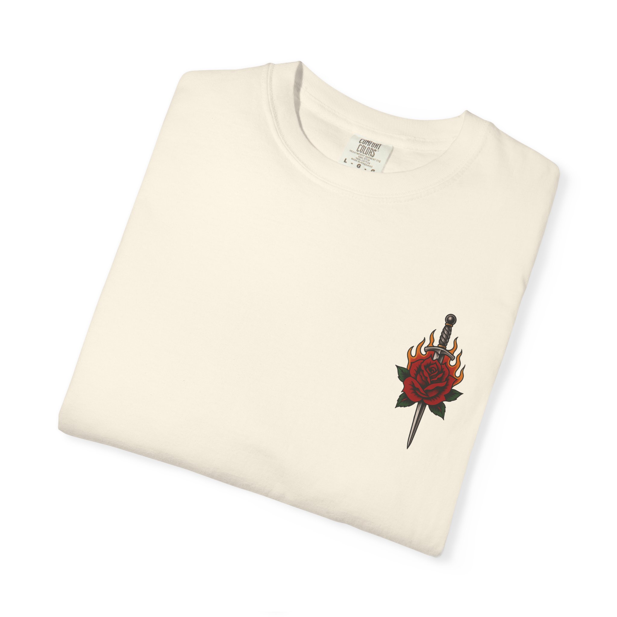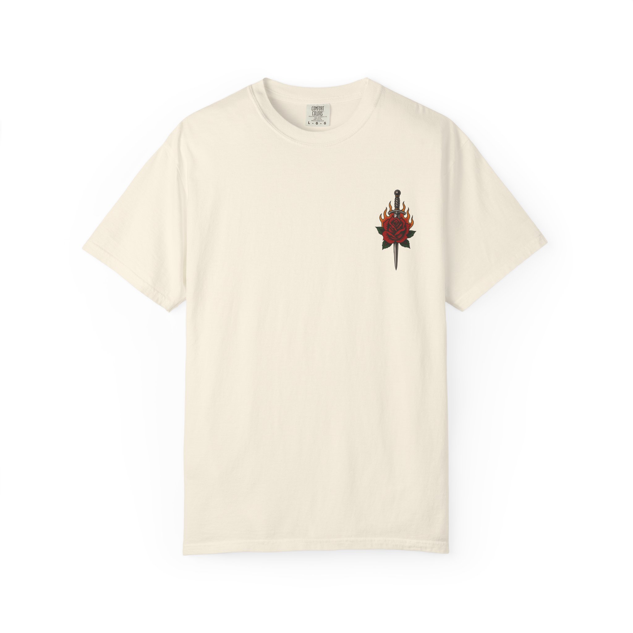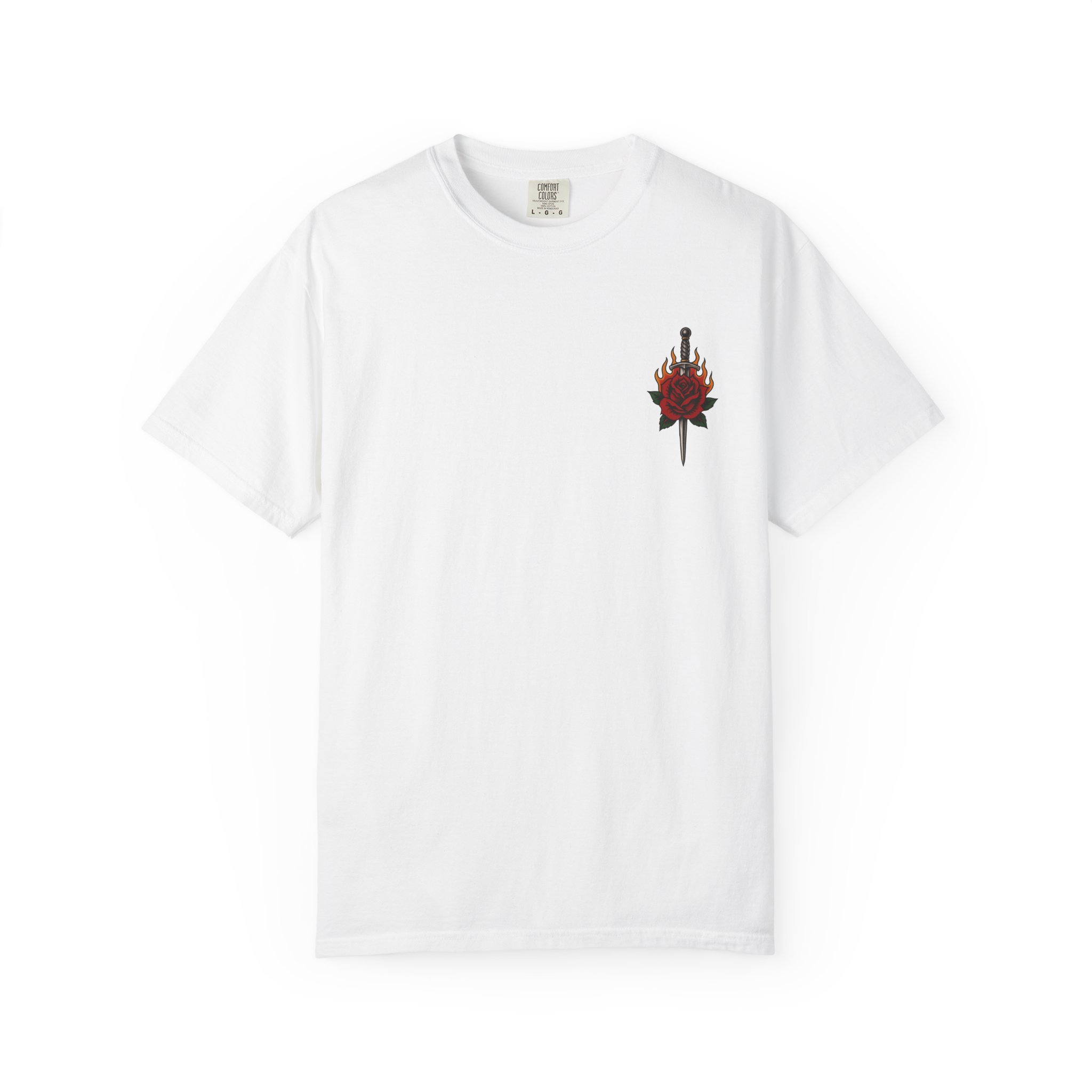 • Bold flaming rose back graphic + dagger rose chest detail