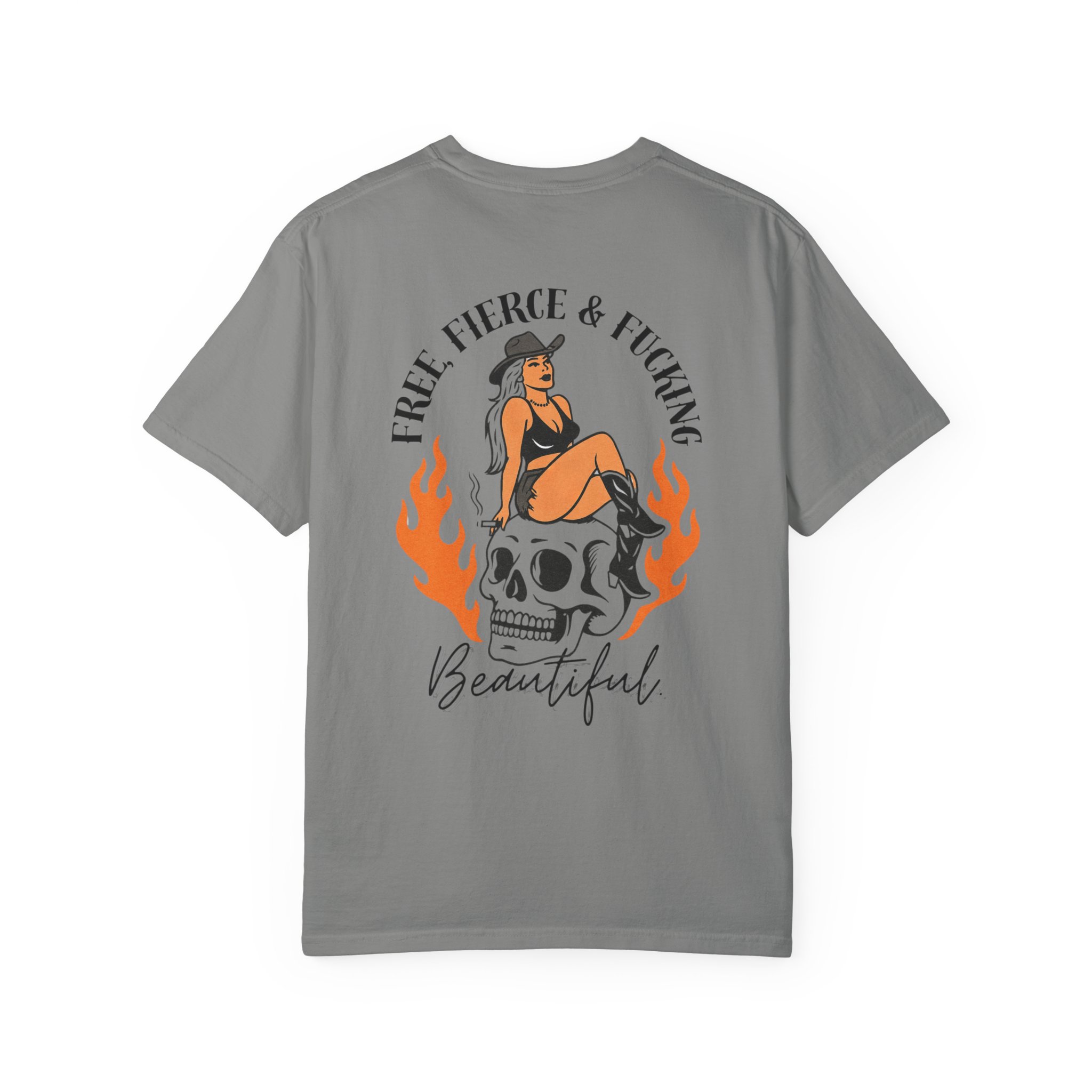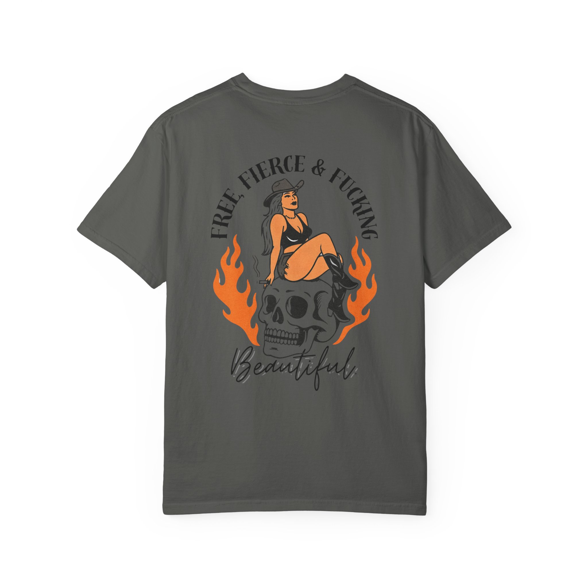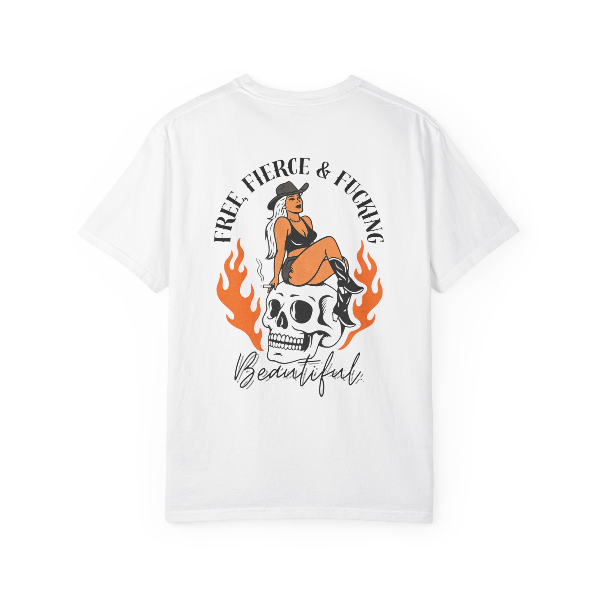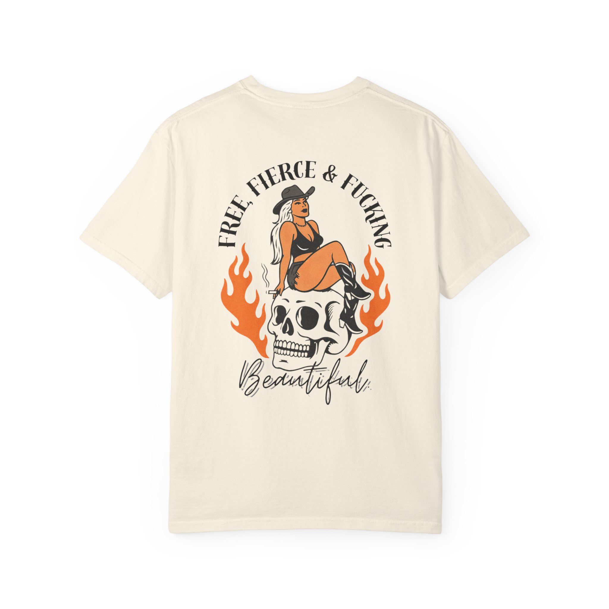 Unapologetic. Untamed. Unstoppable. The Free, Fierce & Beautiful Tee features a bold back graphic of a pin-up siren sitting on a flaming skull with the words “Free, Fierce & F*ing Beautiful” a declaration of strength, rebellion, and self-love.