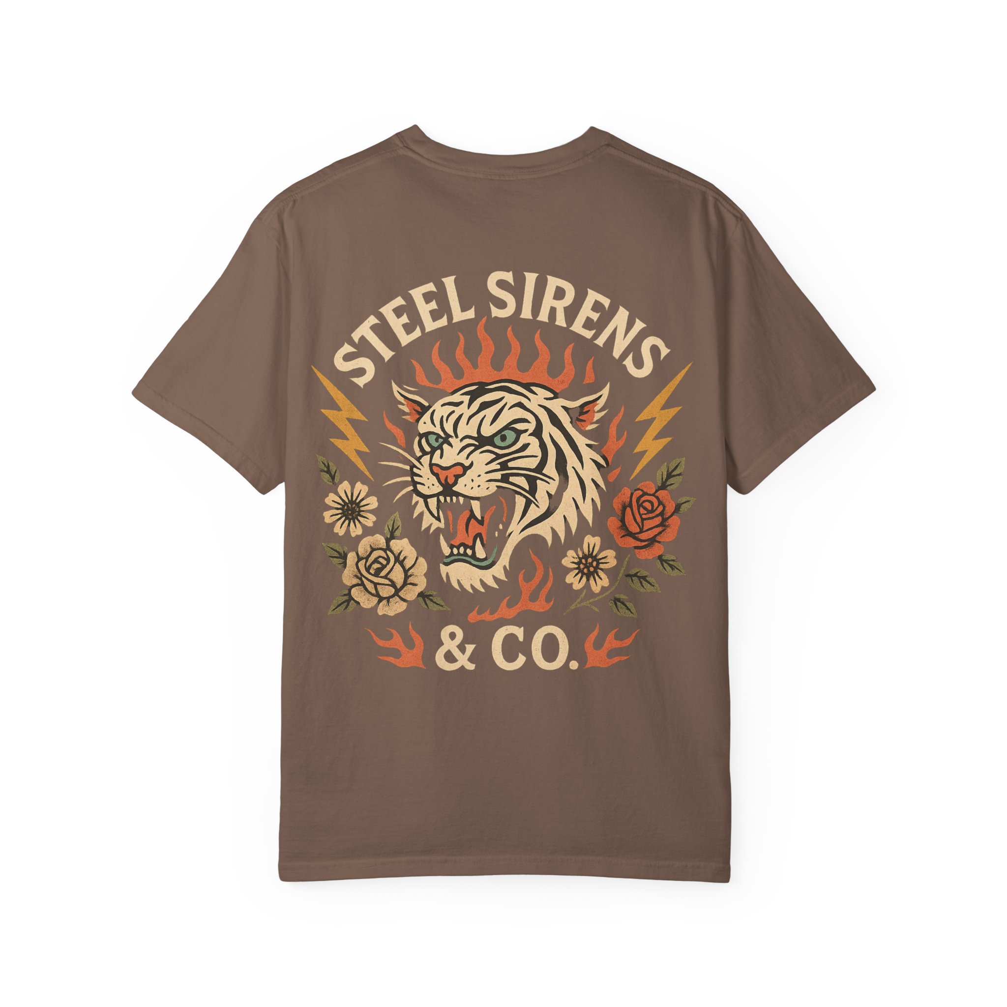 Front and center is our roaring white tiger, framed by flames, bolts, and blooming rebellion. It’s bold, vintage-inspired, and soaked in that signature Steel Sirens grit.