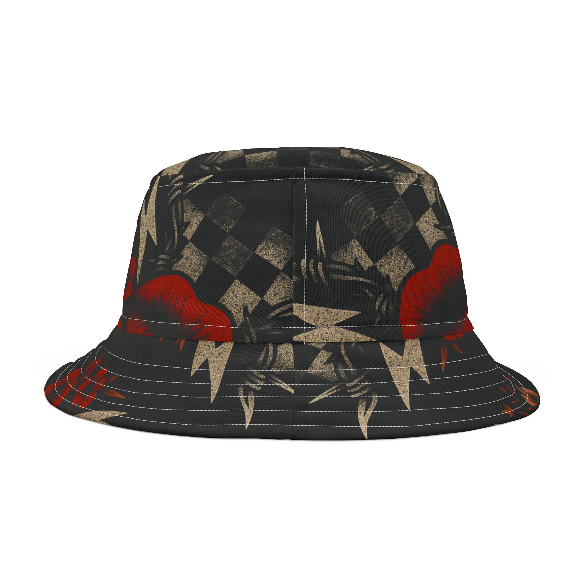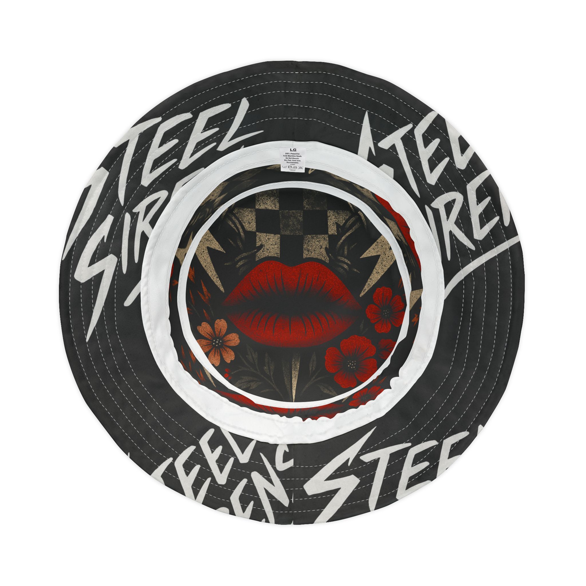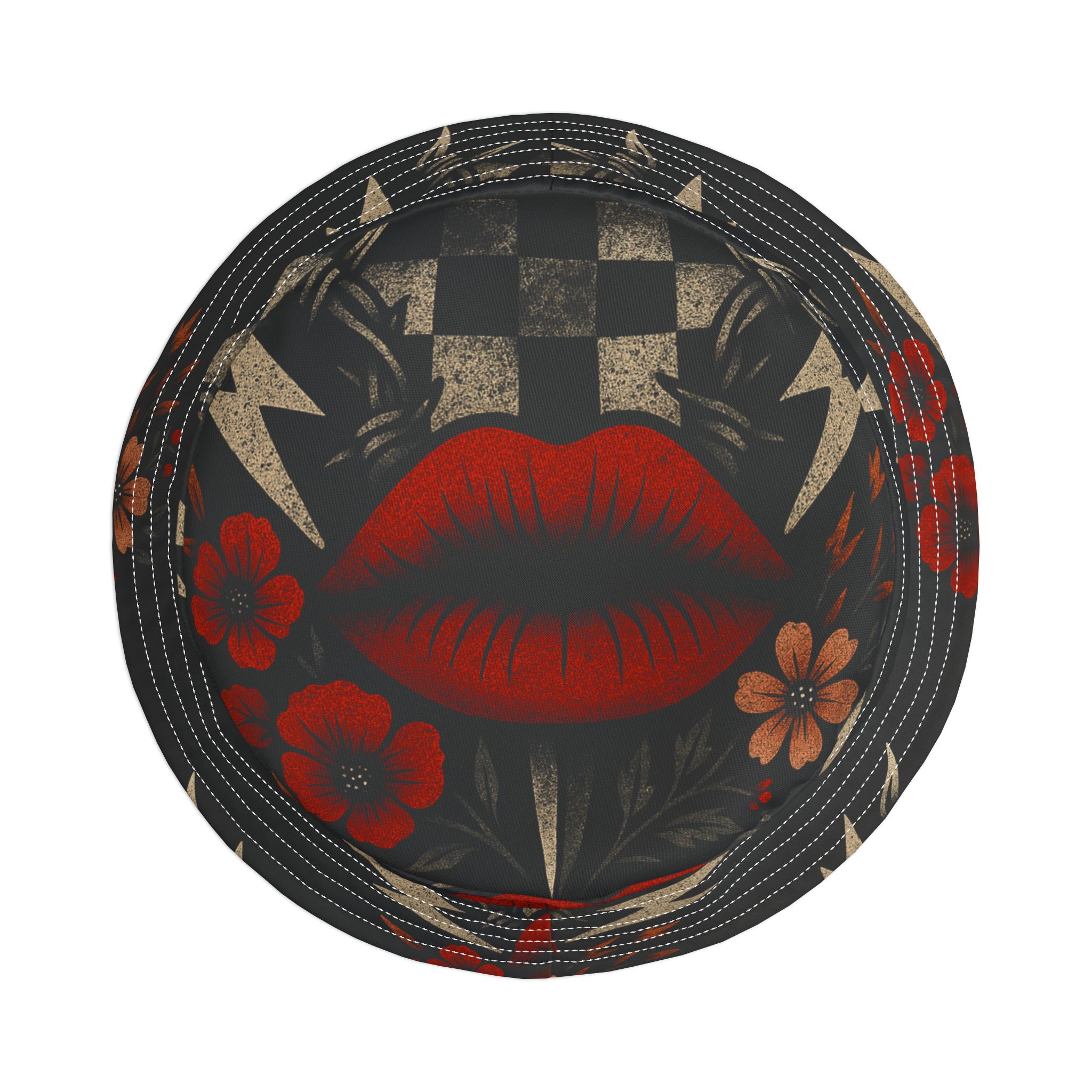 Unleash your untamed spirit with the Kiss of Thunder Bucket Hat from Steel Sirens & Co. This edgy, all-over print features blazing lips, lightning bolts, checkered accents, and dark floral details. Built for the fearless woman who rides her own vibe.