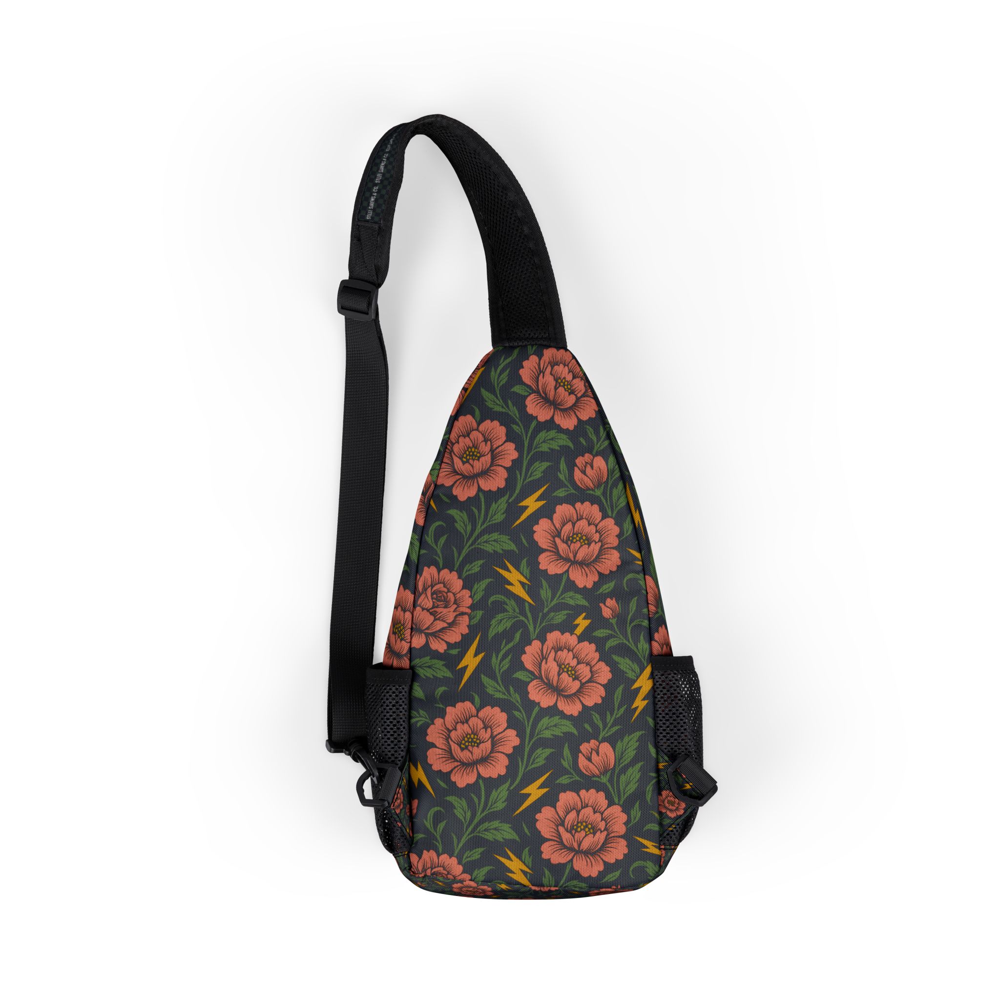 Meet your new favorite ride-or-die bag. The Rose Voltage Sling Pack by Steel Sirens & Co. Designed for life on the go, this bag fuses dark florals with electric edge. Black background, blazing lightning bolts, and fierce red roses scream rebel soul with streetwise style.