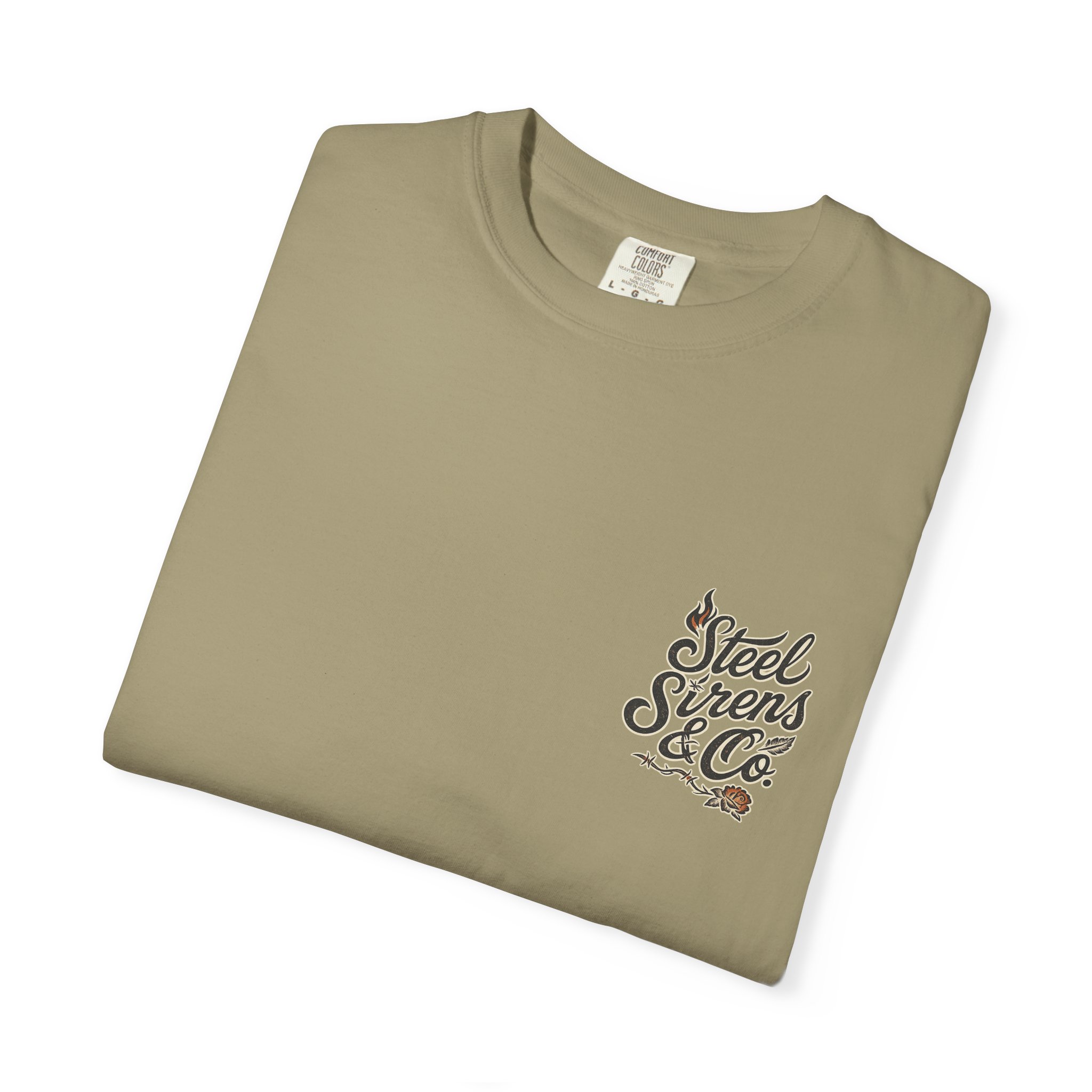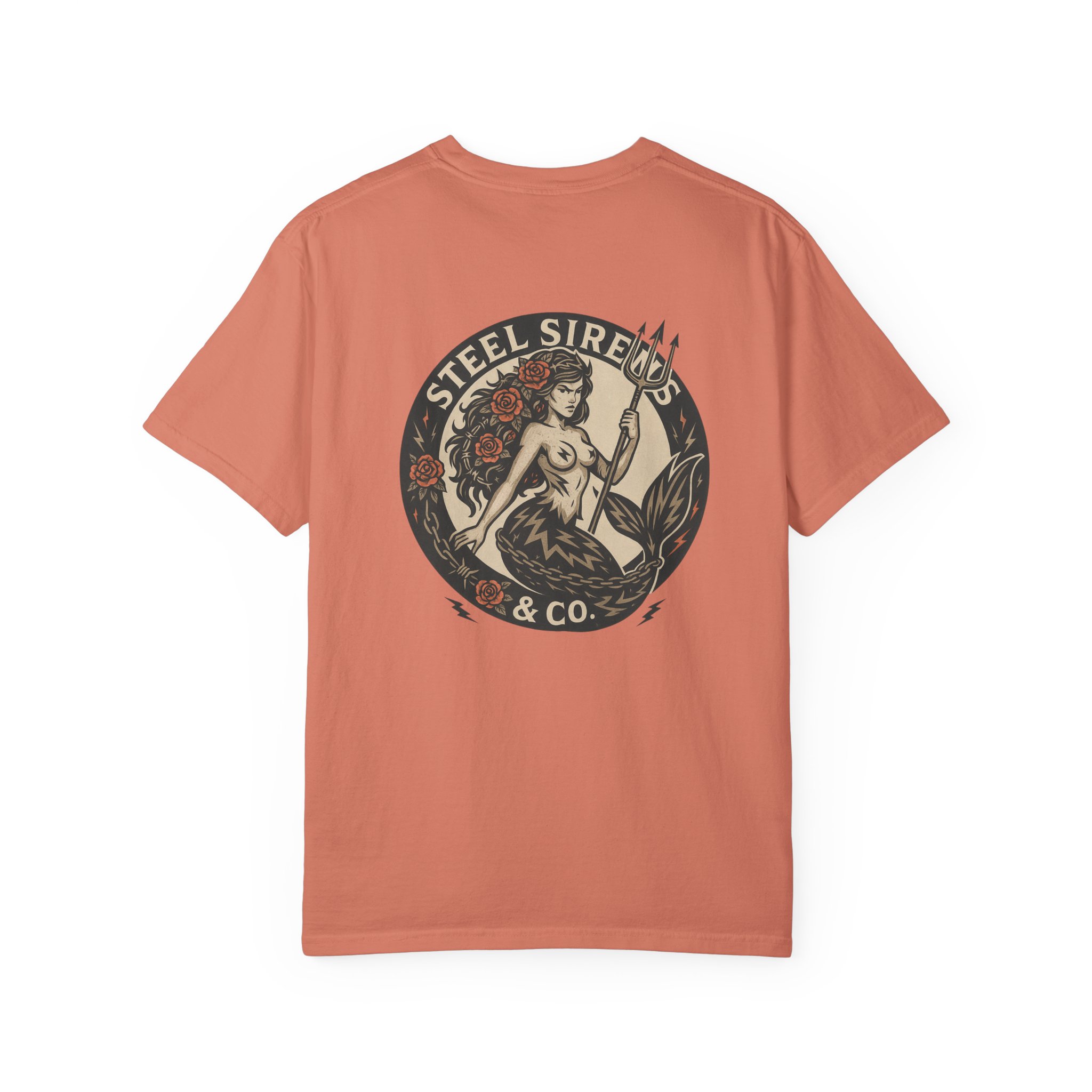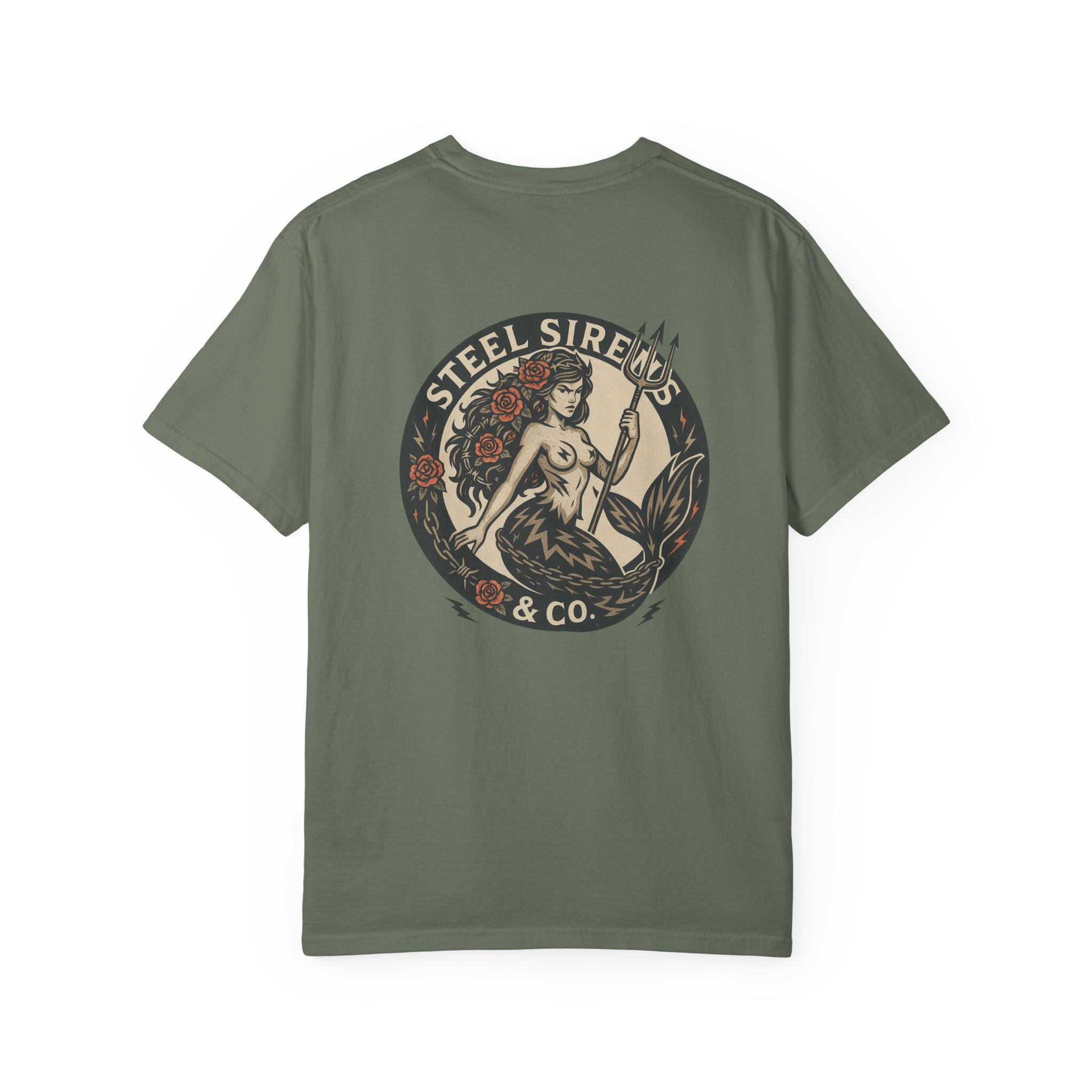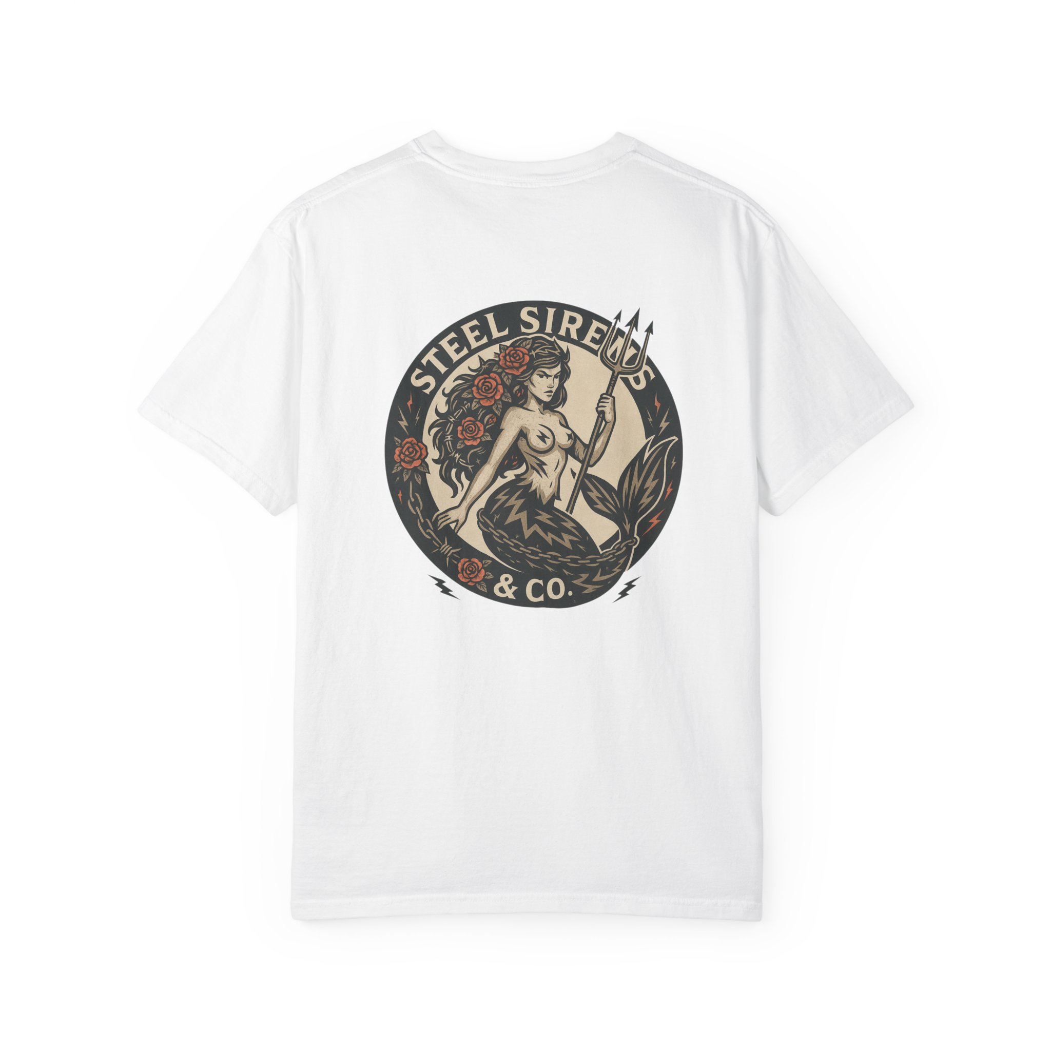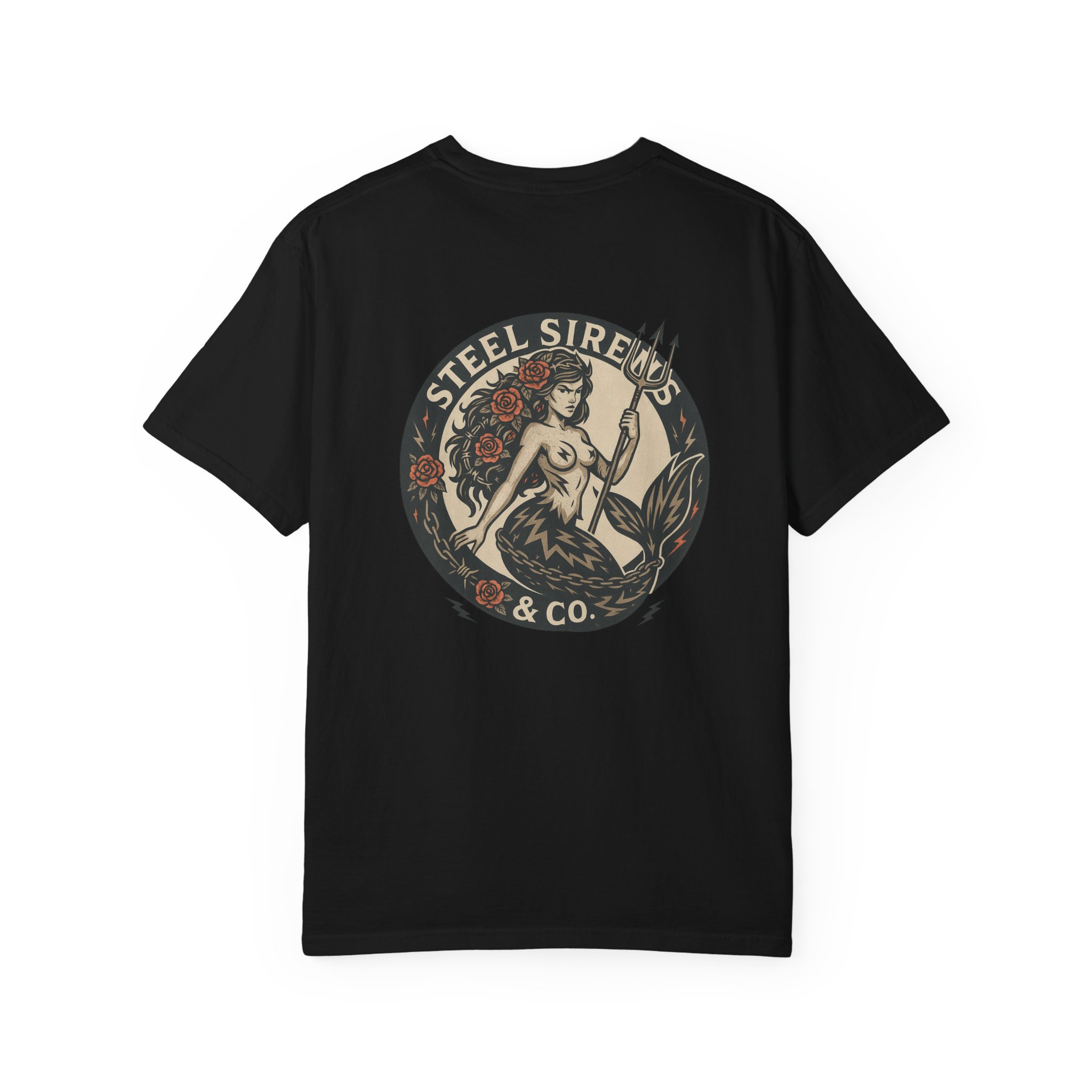 The Siren Sovereign Comfort Colors Tee captures the fierce allure of the Steel Sirens. Featuring a powerful back graphic of a tattoo-style mermaid wielding a trident, surrounded by roses, lightning, and bold colors, this shirt embodies danger, beauty, and rebellion.