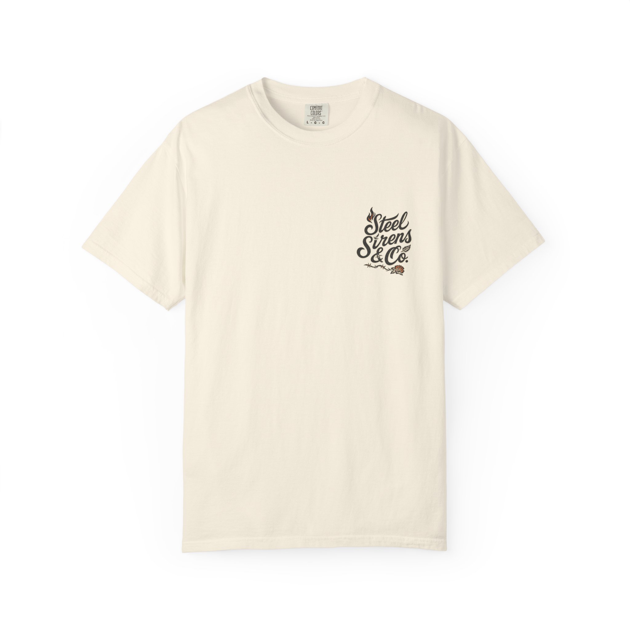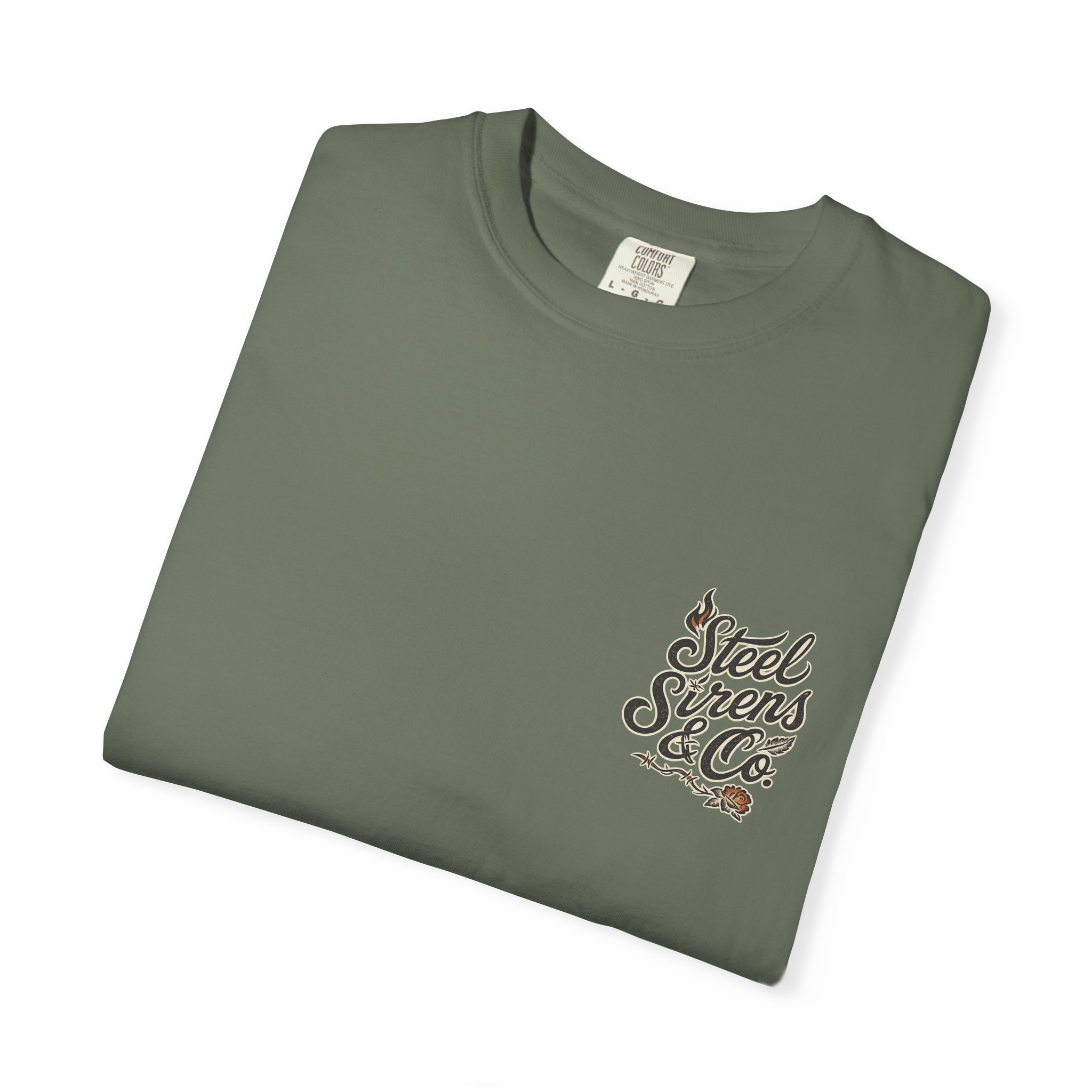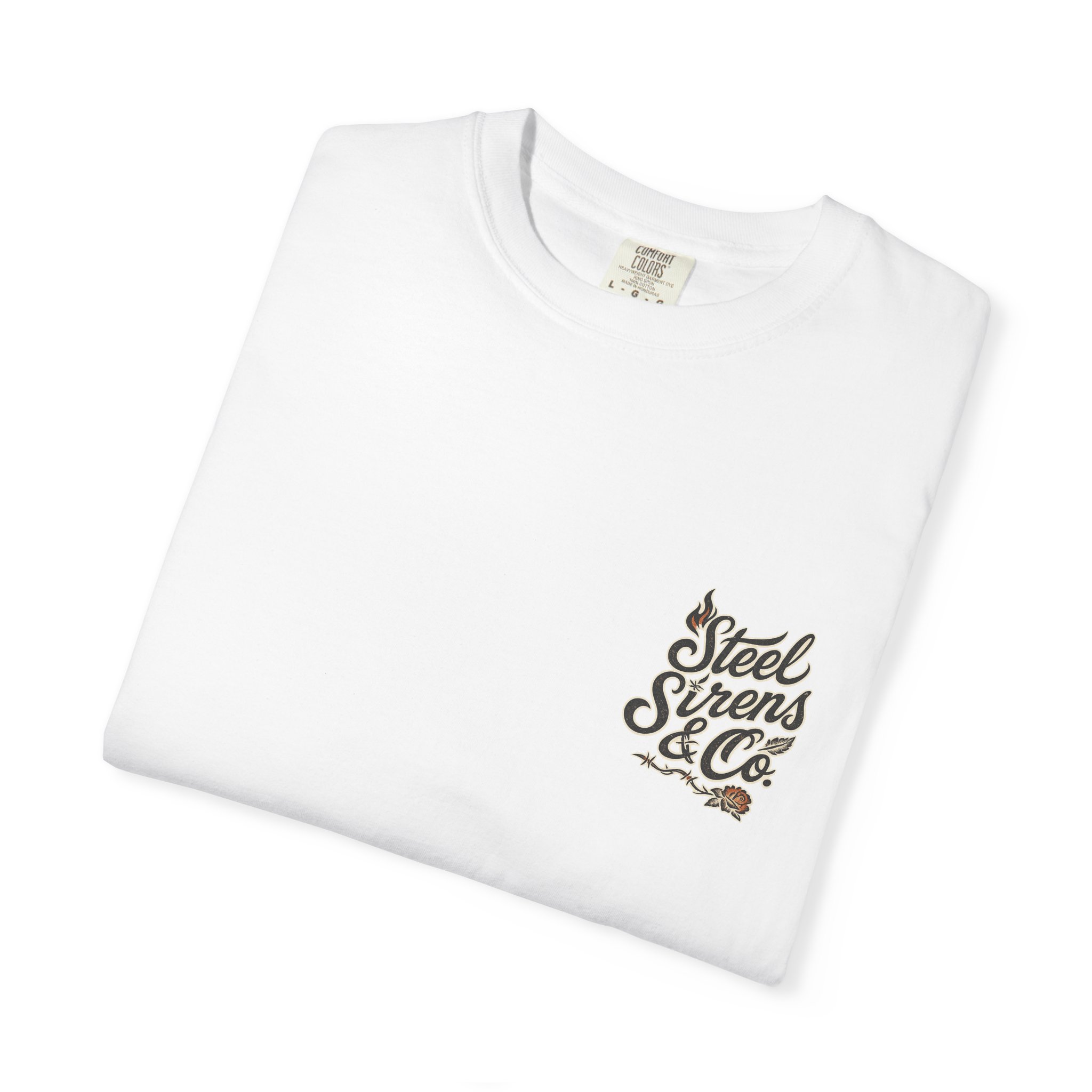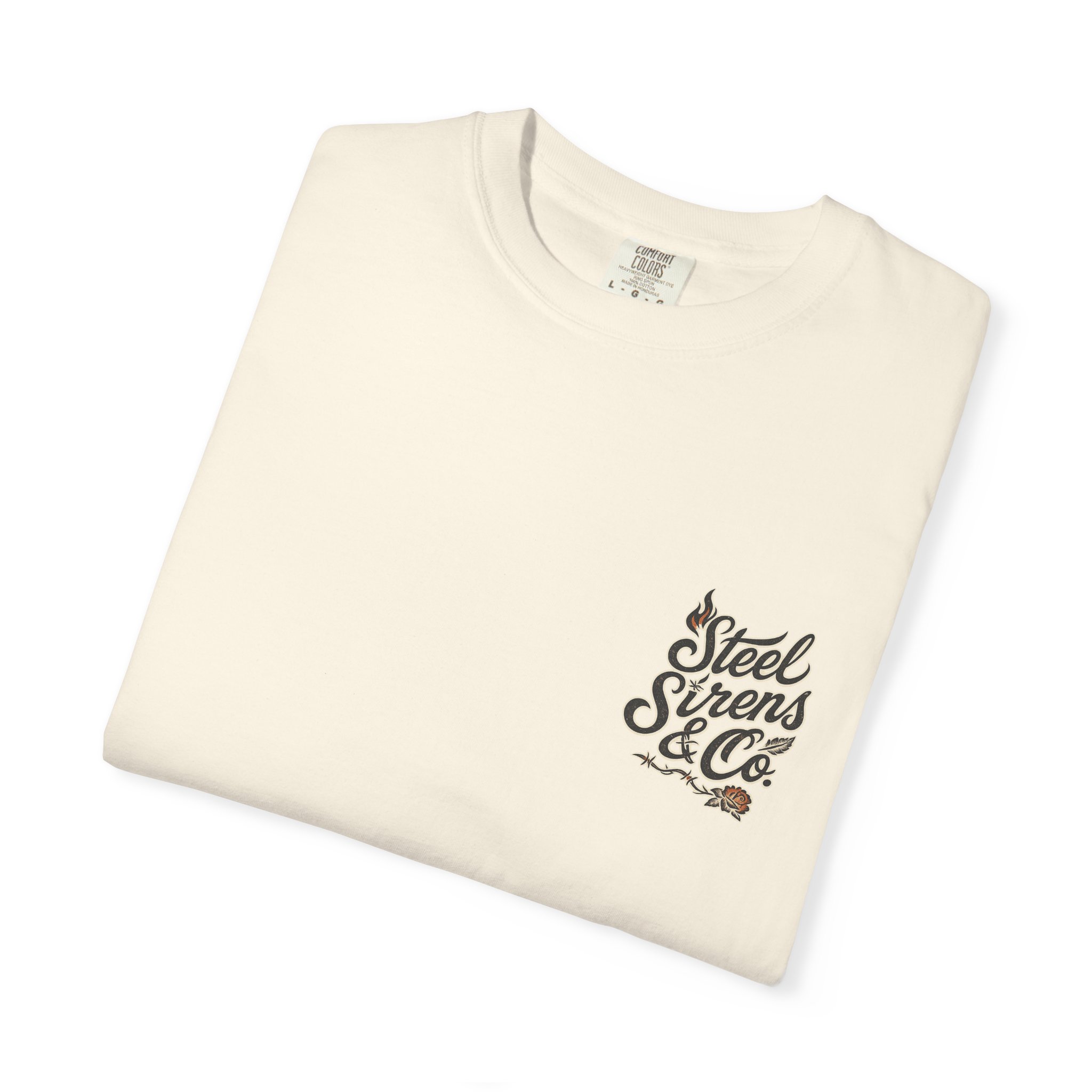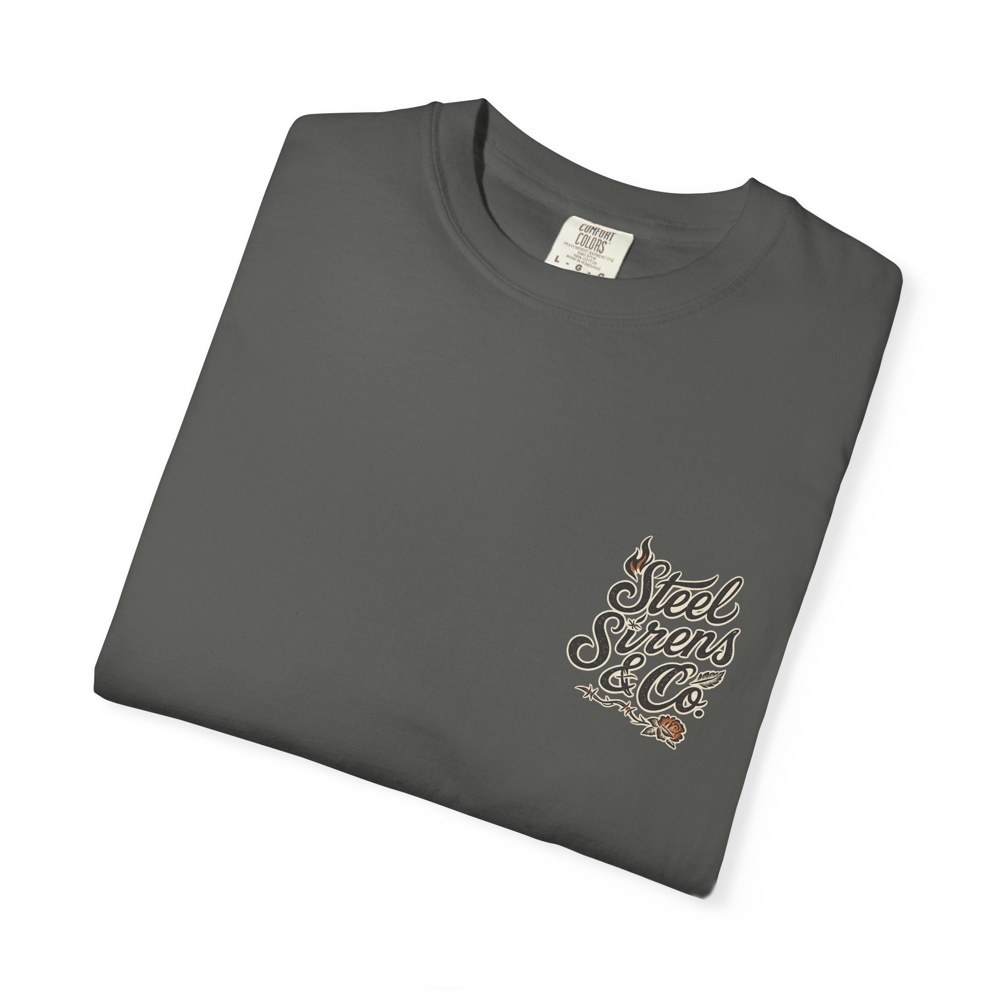 The Siren Sovereign Comfort Colors Tee captures the fierce allure of the Steel Sirens. Featuring a powerful back graphic of a tattoo-style mermaid wielding a trident, surrounded by roses, lightning, and bold colors, this shirt embodies danger, beauty, and rebellion.