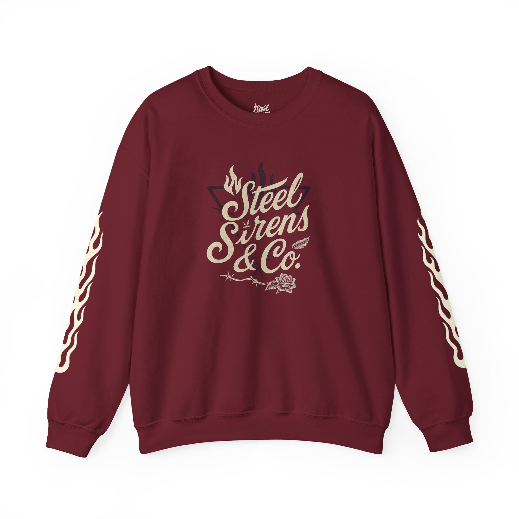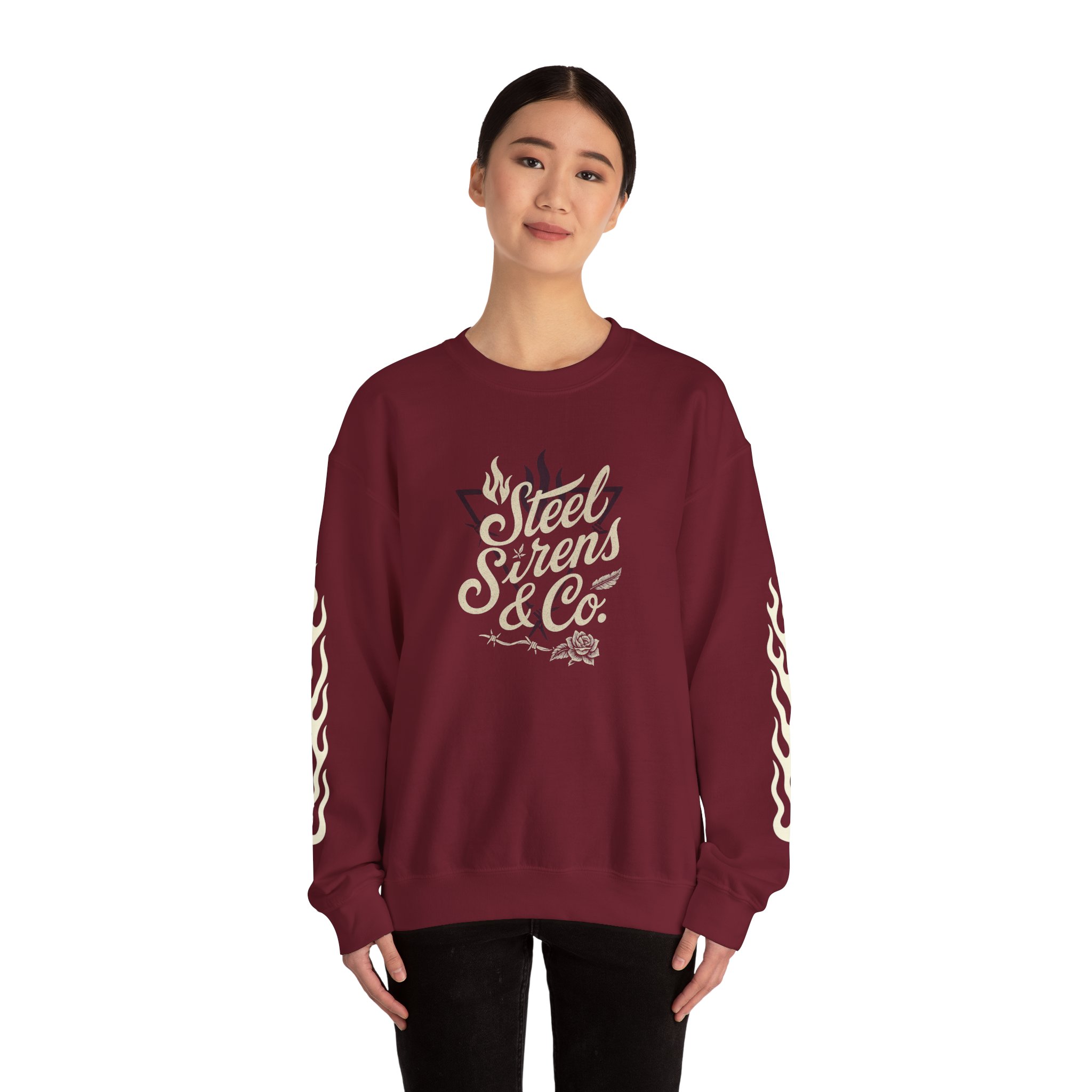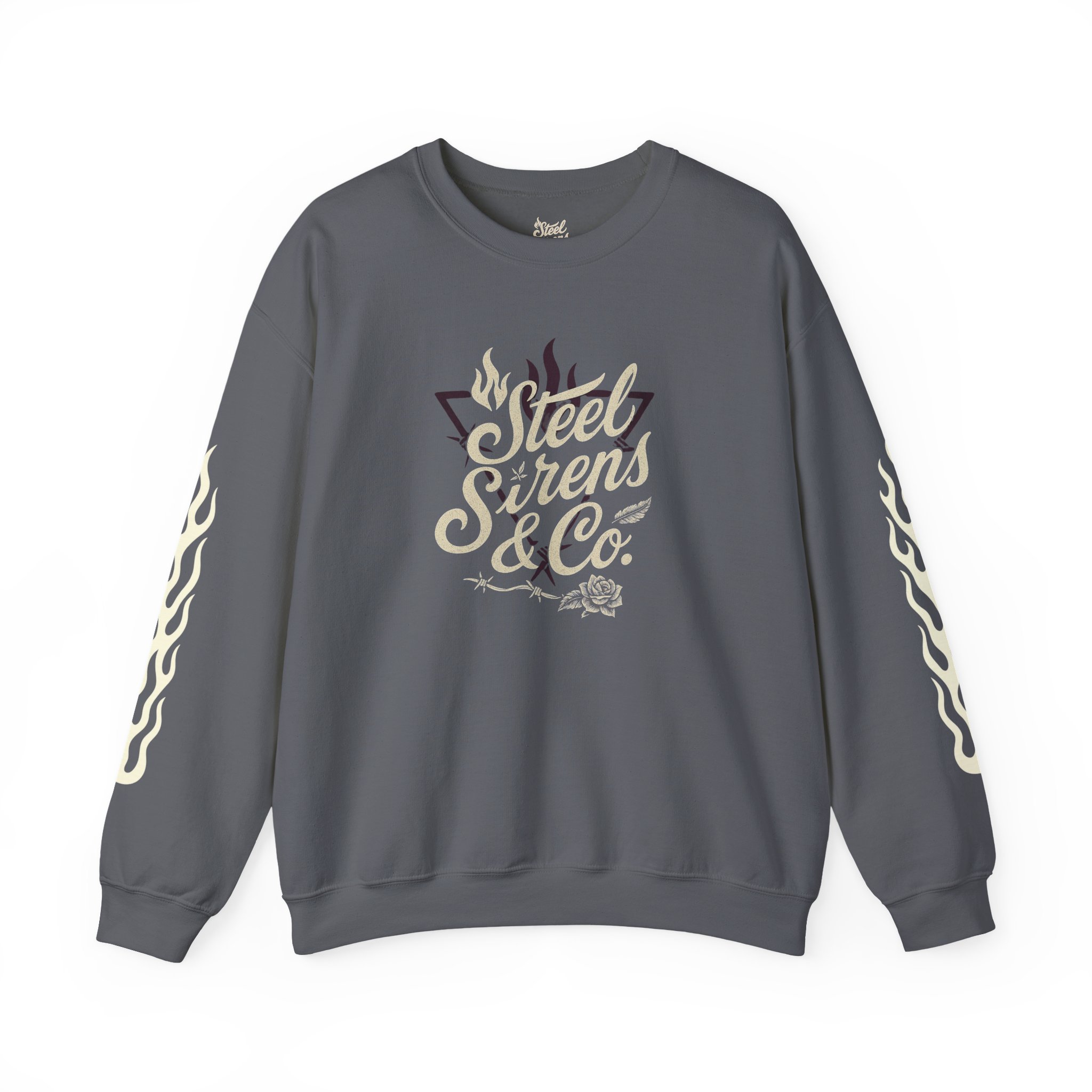 The Rise Above Crewneck is all about strength, unity, and unapologetic style. Featuring our Steel Sirens & Co. logo on the front with bold flame accents down each sleeve, this sweatshirt makes a statement from every angle. The back reads “Built to Rise, Not to Rival” a motto that embodies our mission of empowerment without competition. Designed for comfort with a tough edge, it’s perfect for cool nights at the track, laid-back weekends, or whenever you want to carry that rebel spirit with you.