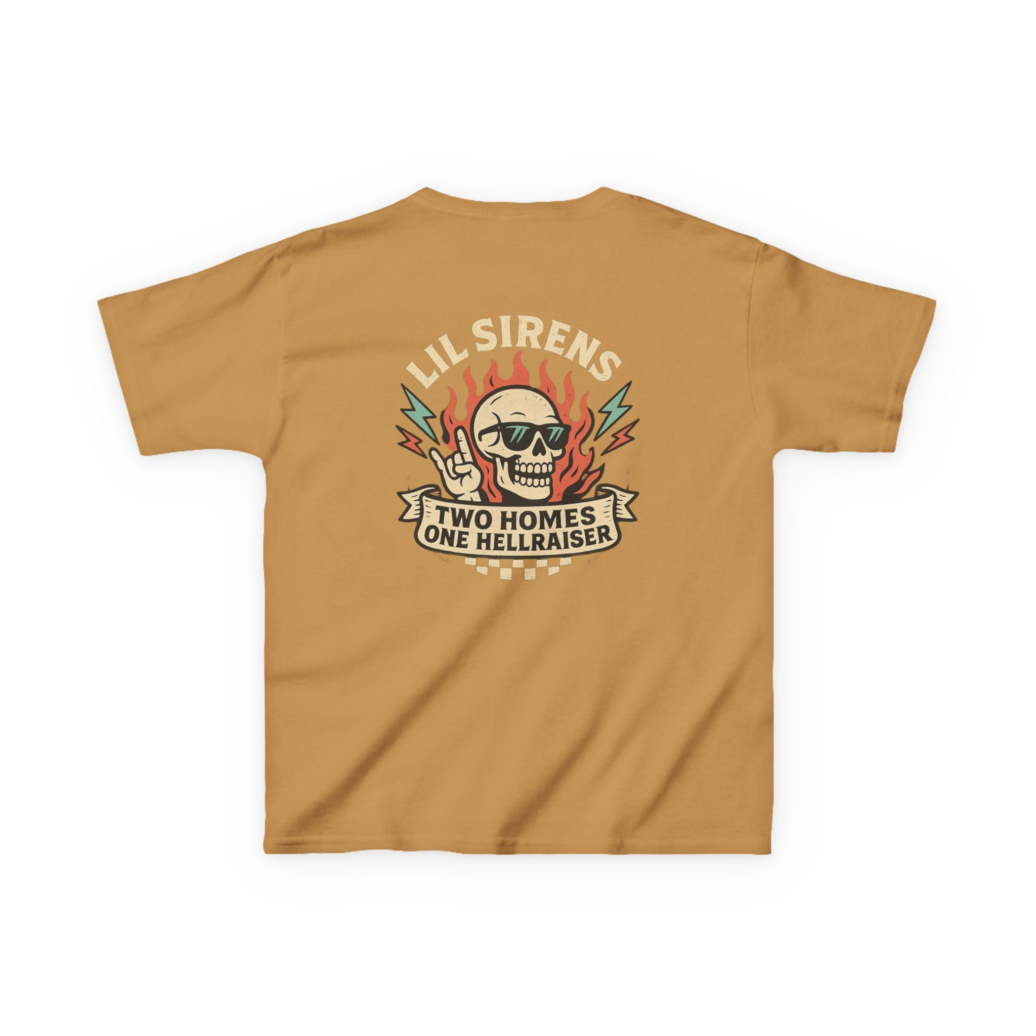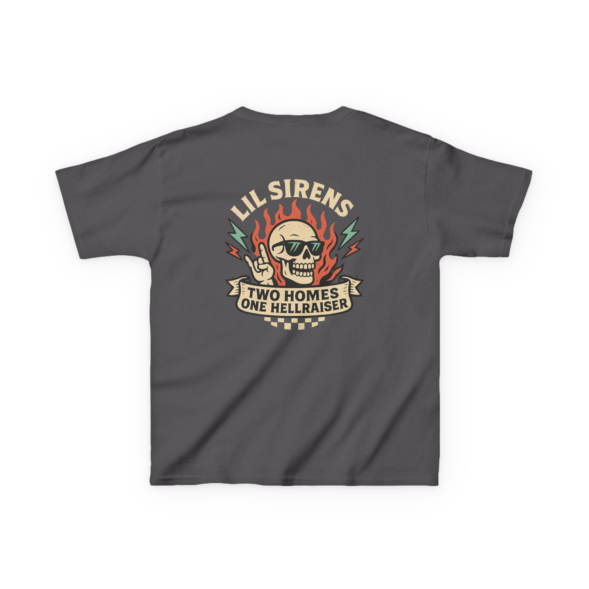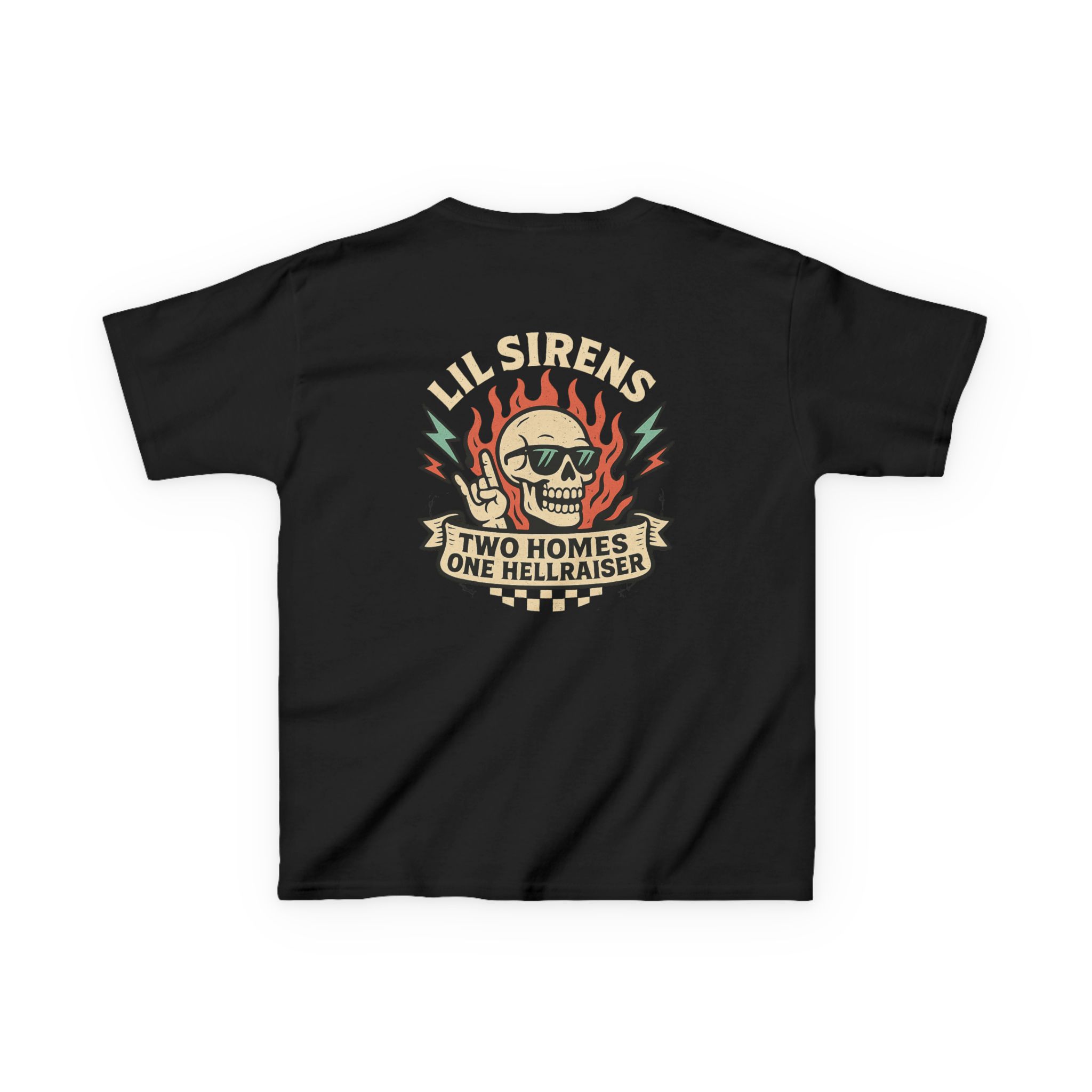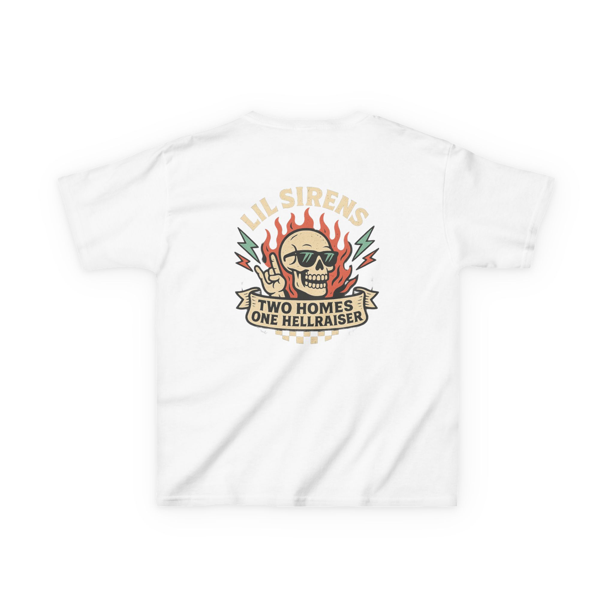 For the tiny rebels with big stories. The Lil Sirens “Two Homes One Hellraiser” Tee is made for the kiddos who ride the line, break the mold, and love twice as hard. The kiddos who roll between homes but never lose their fire. Whether they’re splitting time between homes or just living loud, this tee lets ‘em wear their truth with pride. Featuring a badass skull with flames and lightning bolts, it’s bold, empowering, and full of energy, just like them.