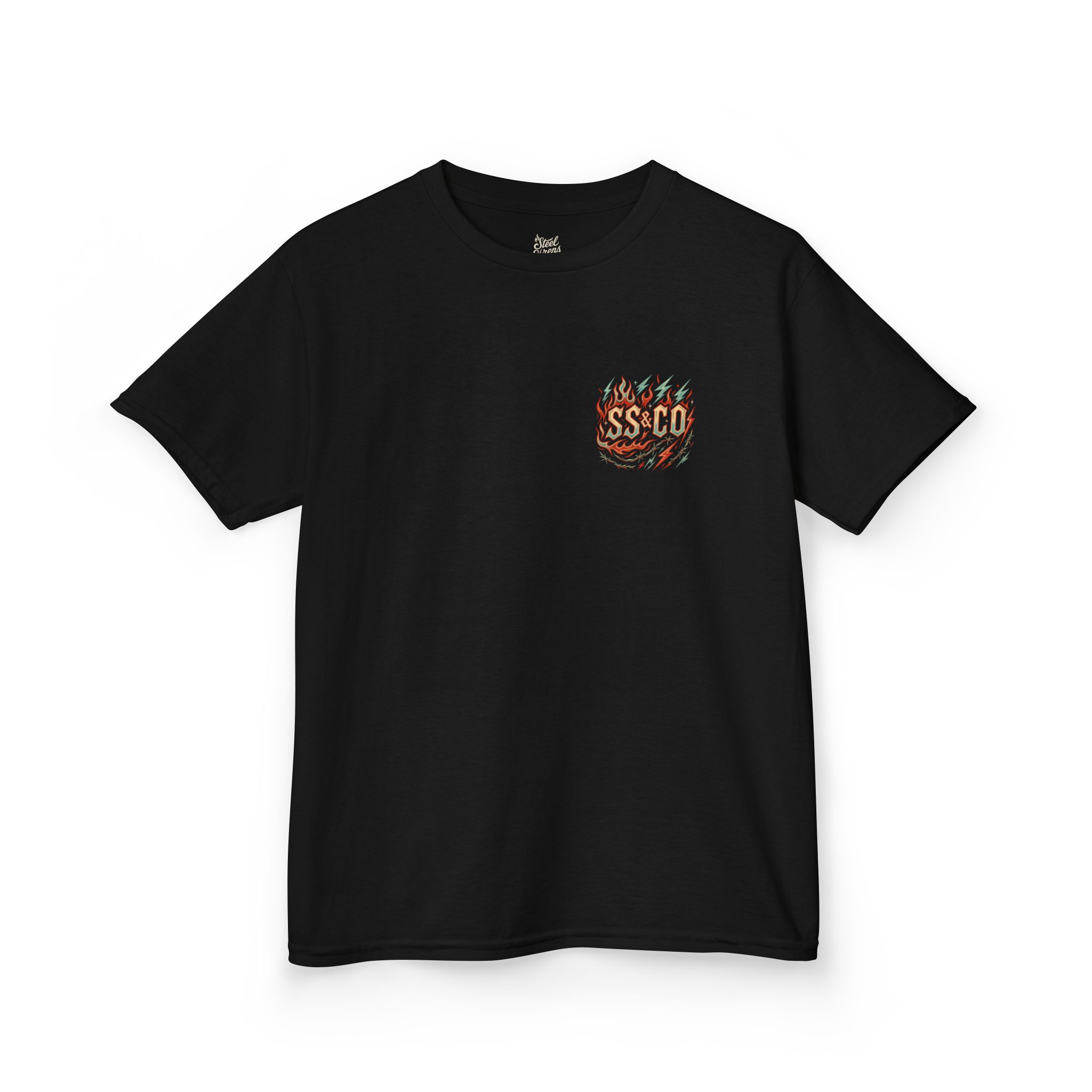 Split Schedules, same wild heart. For the kids who bring twice the chaos and all the attitude. The Lil Sirens Two Homes One Hellraiser Tee features a fiery back graphic with a grinning skull, flames, and the banner “Two Homes, One Hellraiser” celebrating the wild spirit of blended families. The front chest sports the SS⚡️&Co. crest for that authentic moto vibe.